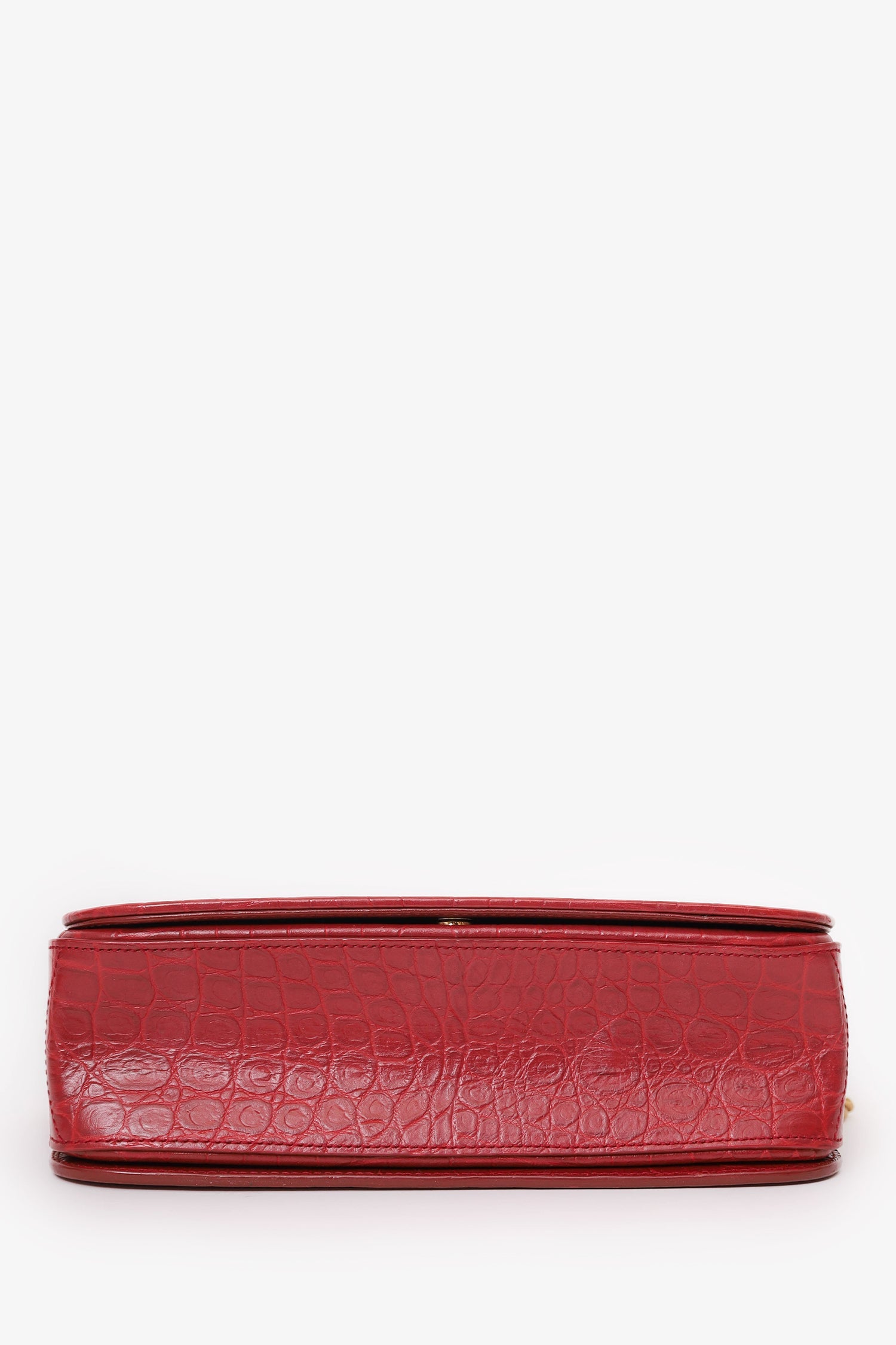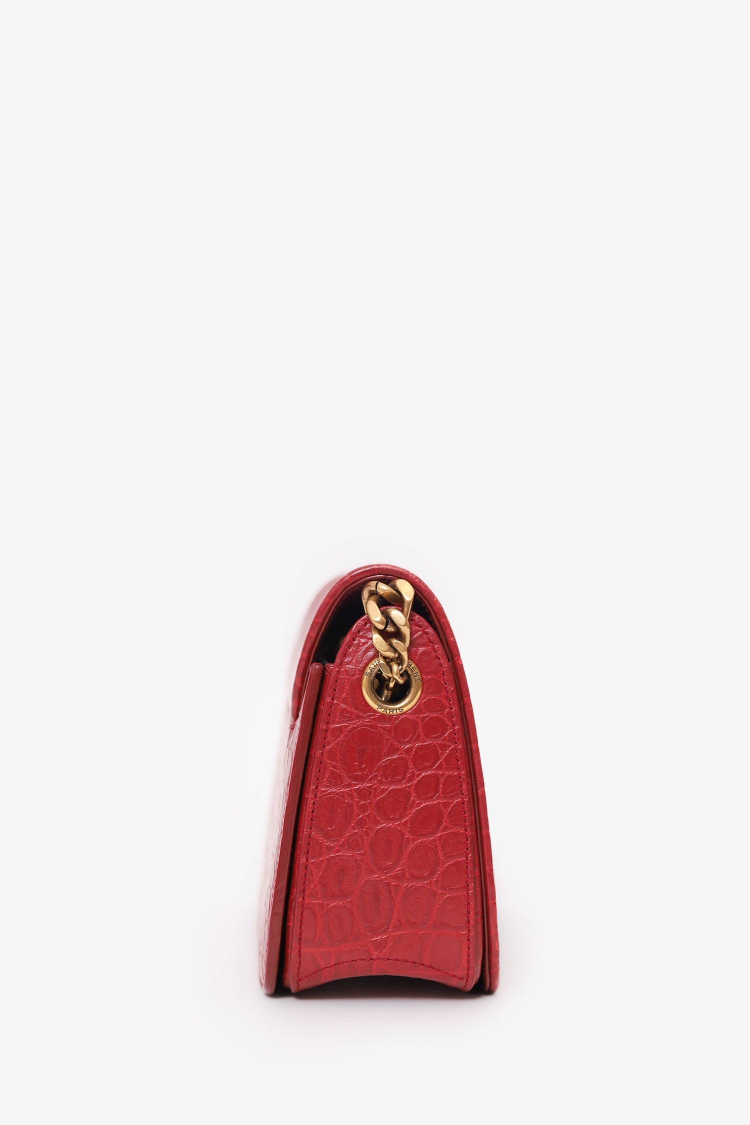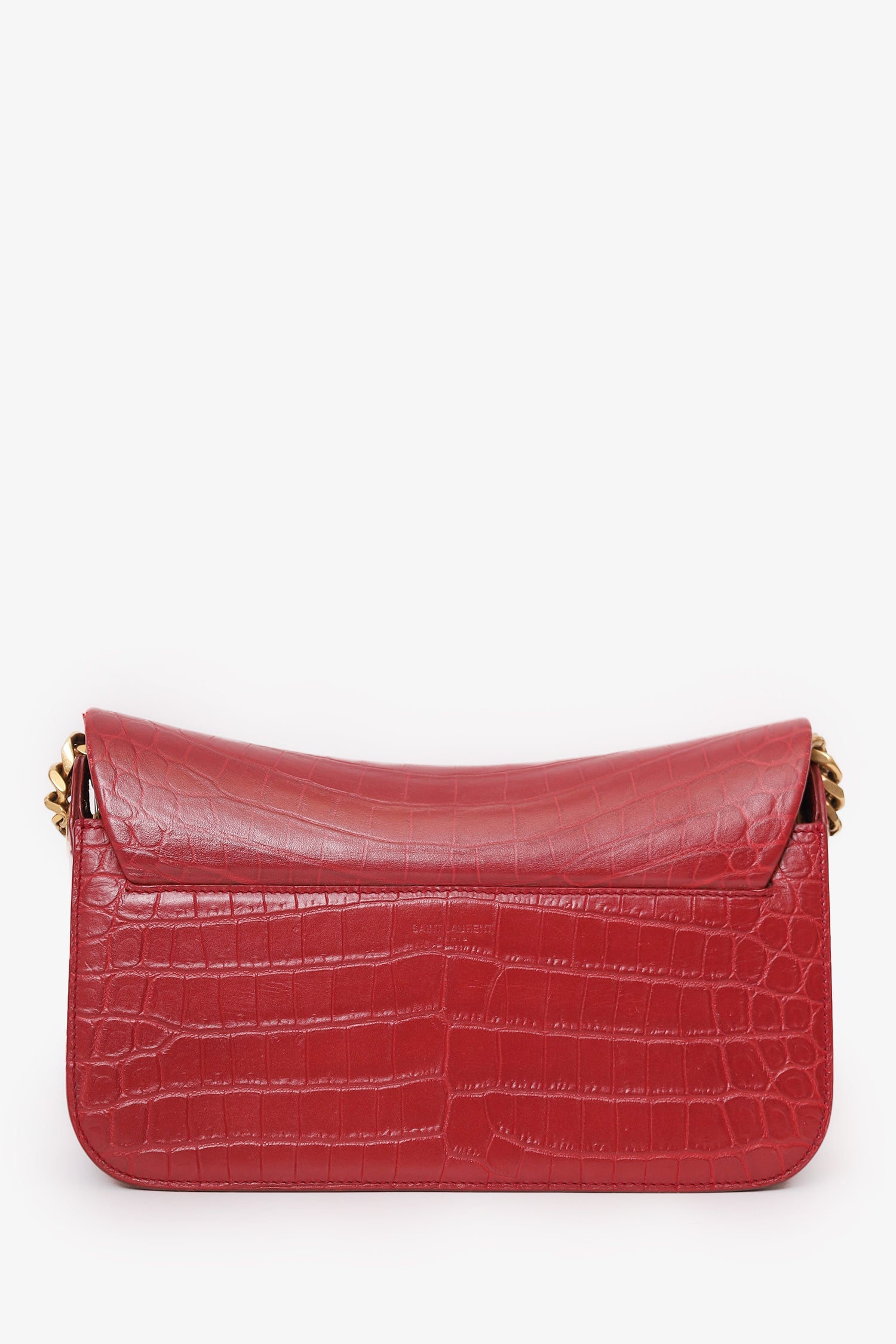 Saint Laurent Red Embossed Elise Shoulder Bag. Front-fold-over-flap with snap-button-up closure. Removable chain link shoulder strap. Lined interior with 1 large open pocket, and 1 slip pocket. Gold-tone hardware. Tonal stitching.