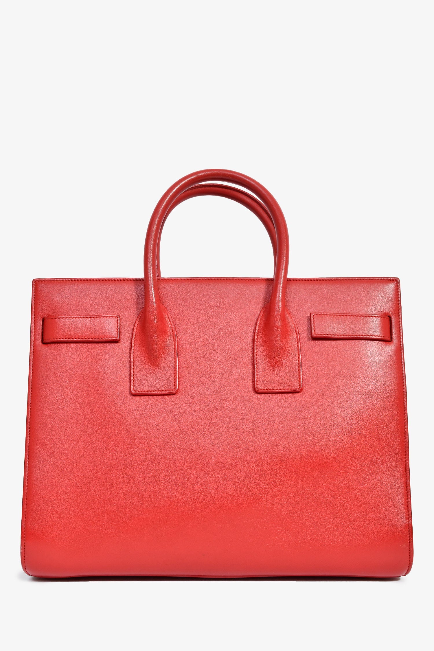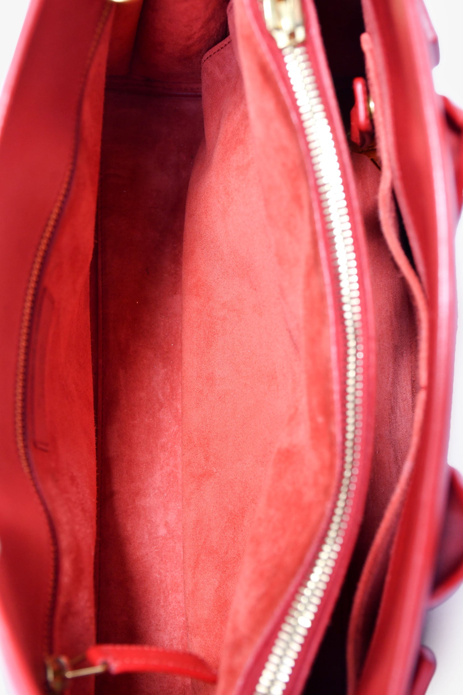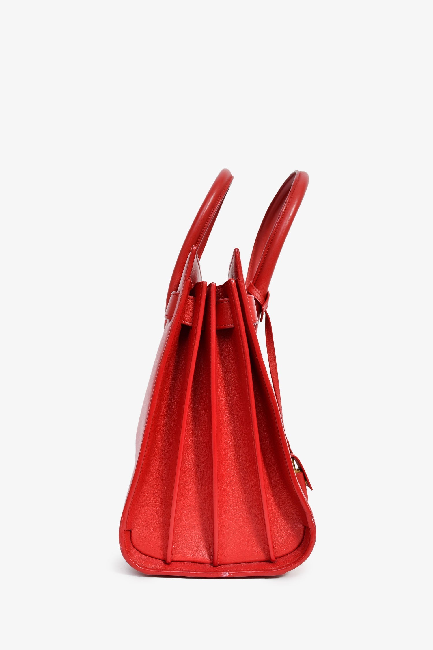 Saint Laurent Red Leather Small Sac De Jour. Open interior. Rolled handles. Attached strap. Suede-lined interior with 6 interior compartments: 2 open, 2 zip, and 2 slip pockets. Gold-tone hardware. Tonal stitching.