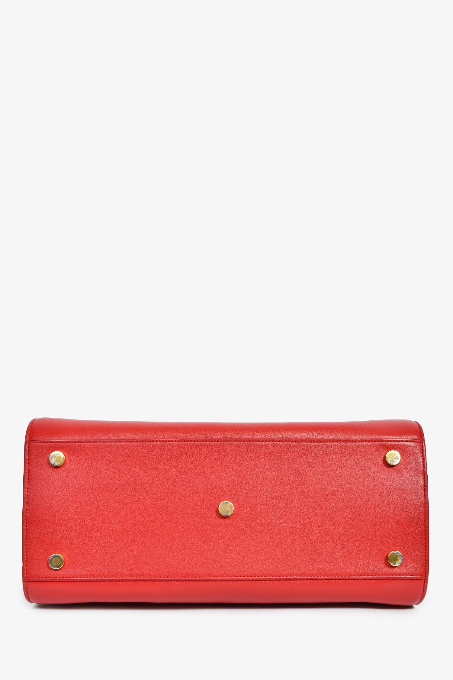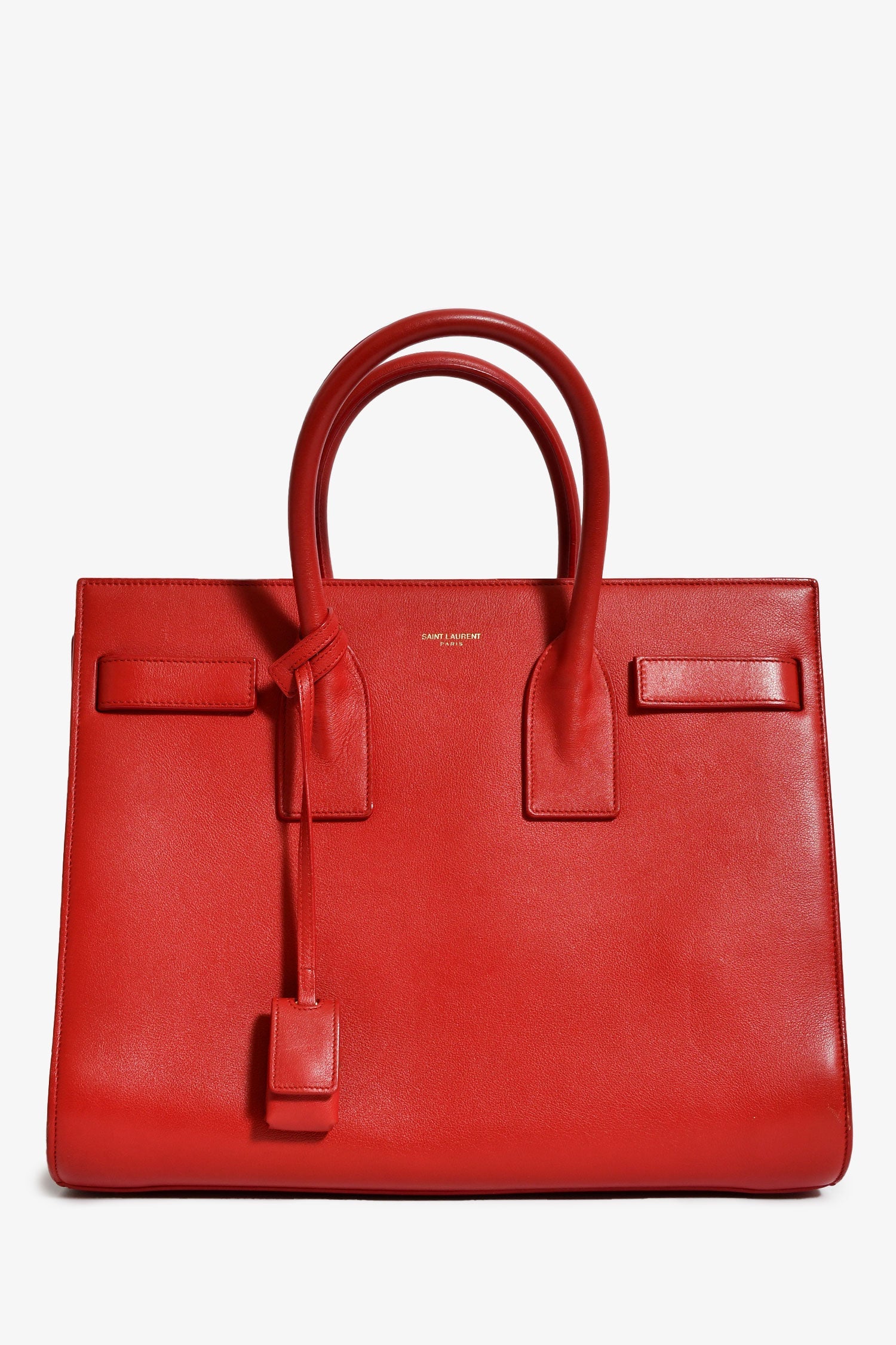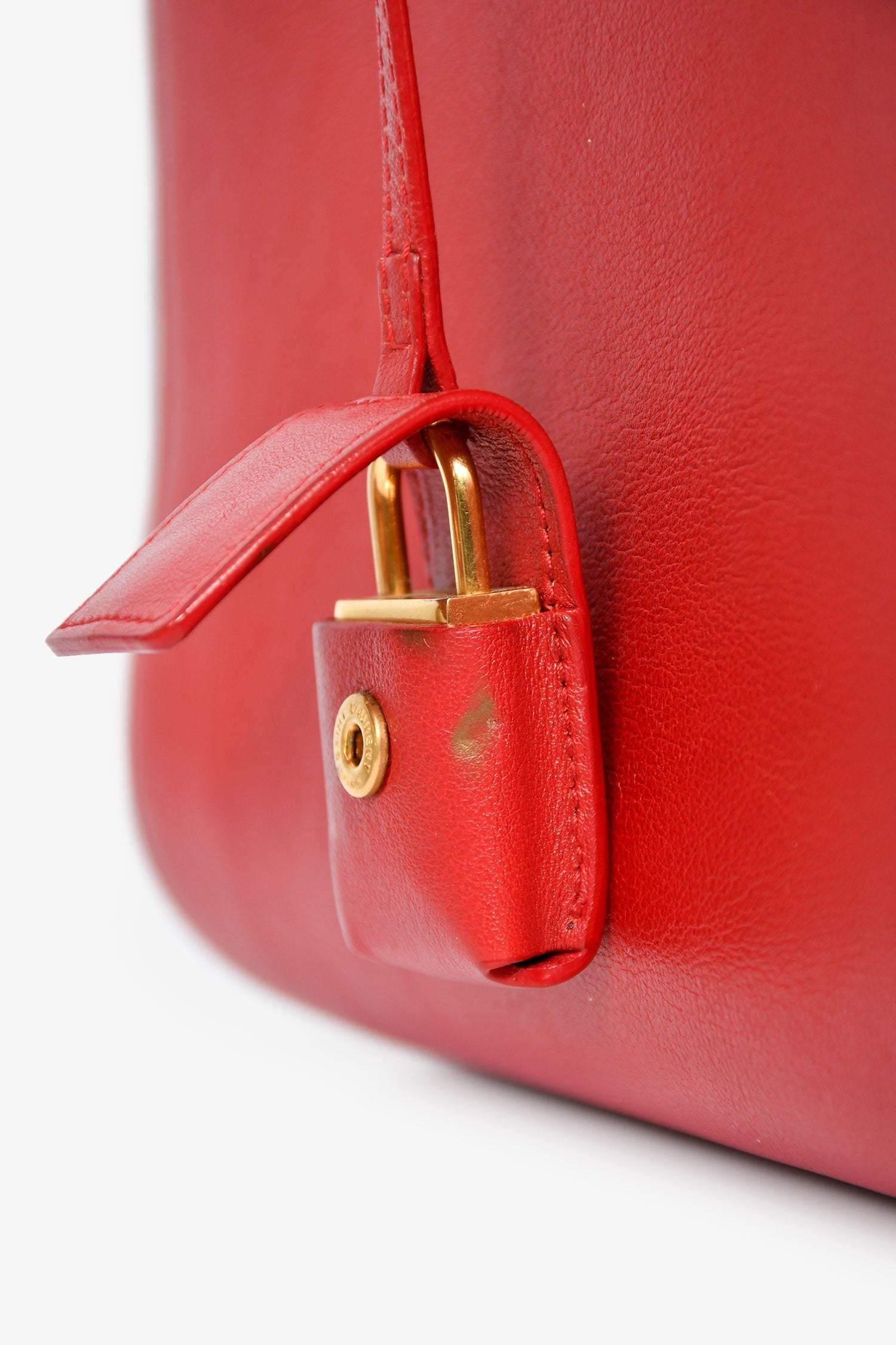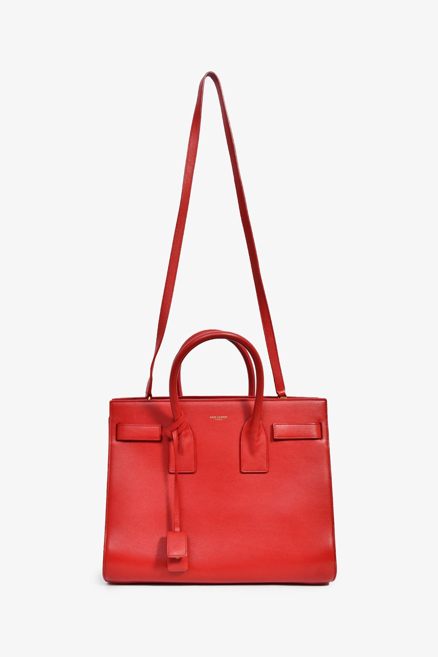 Saint Laurent Red Leather Small Sac De Jour. Open interior. Rolled handles. Attached strap. Suede-lined interior with 6 interior compartments: 2 open, 2 zip, and 2 slip pockets. Gold-tone hardware. Tonal stitching.