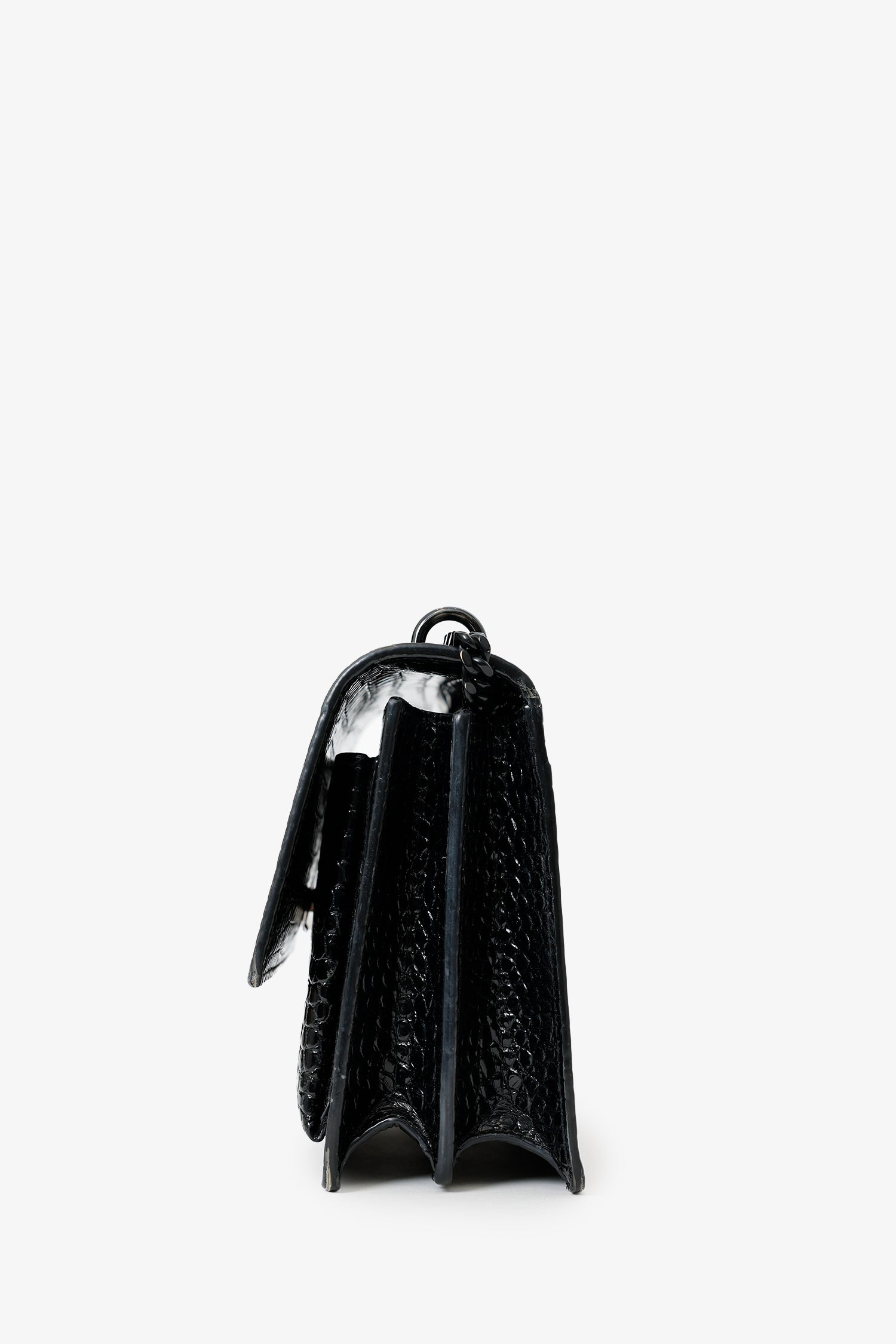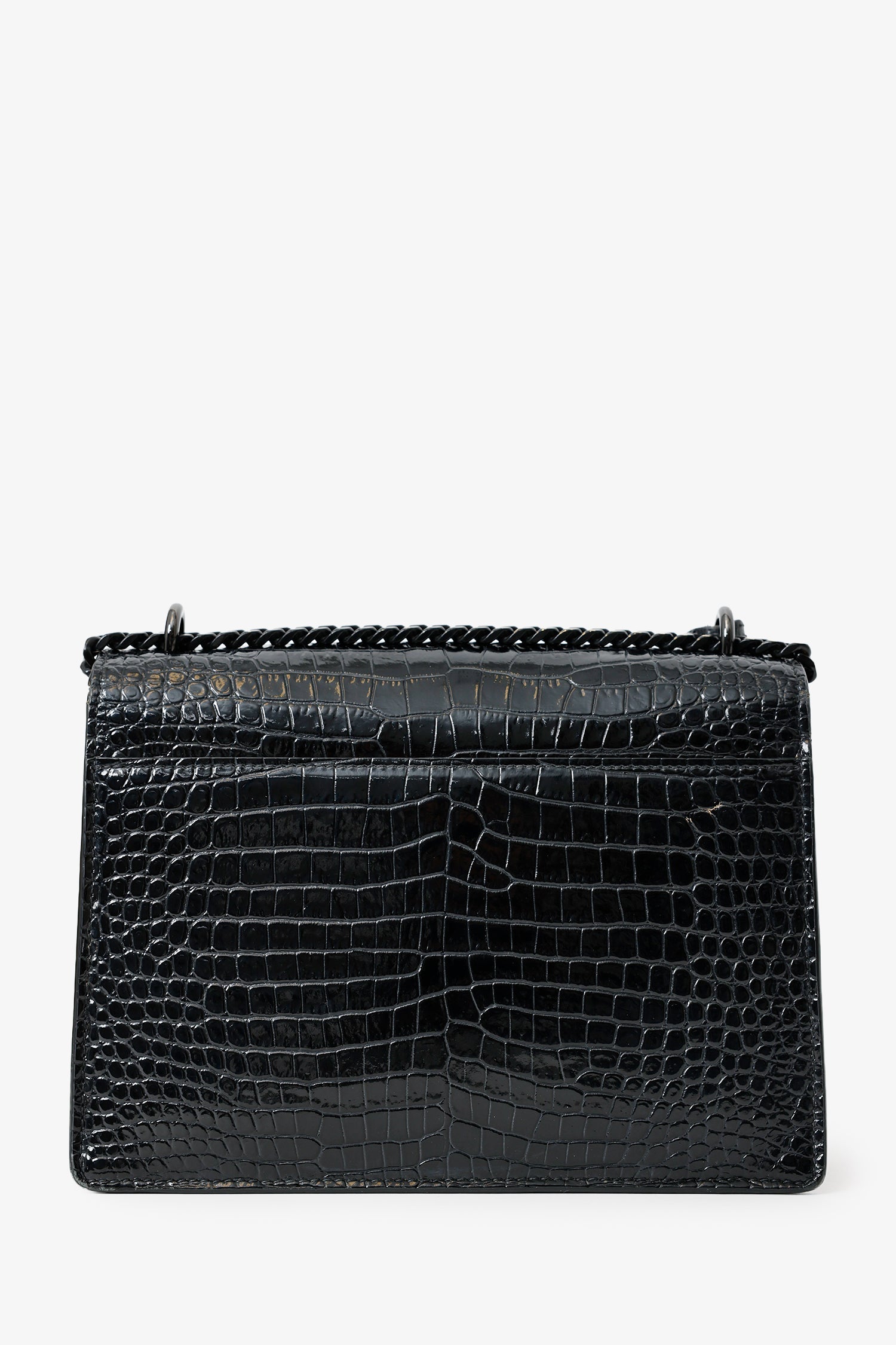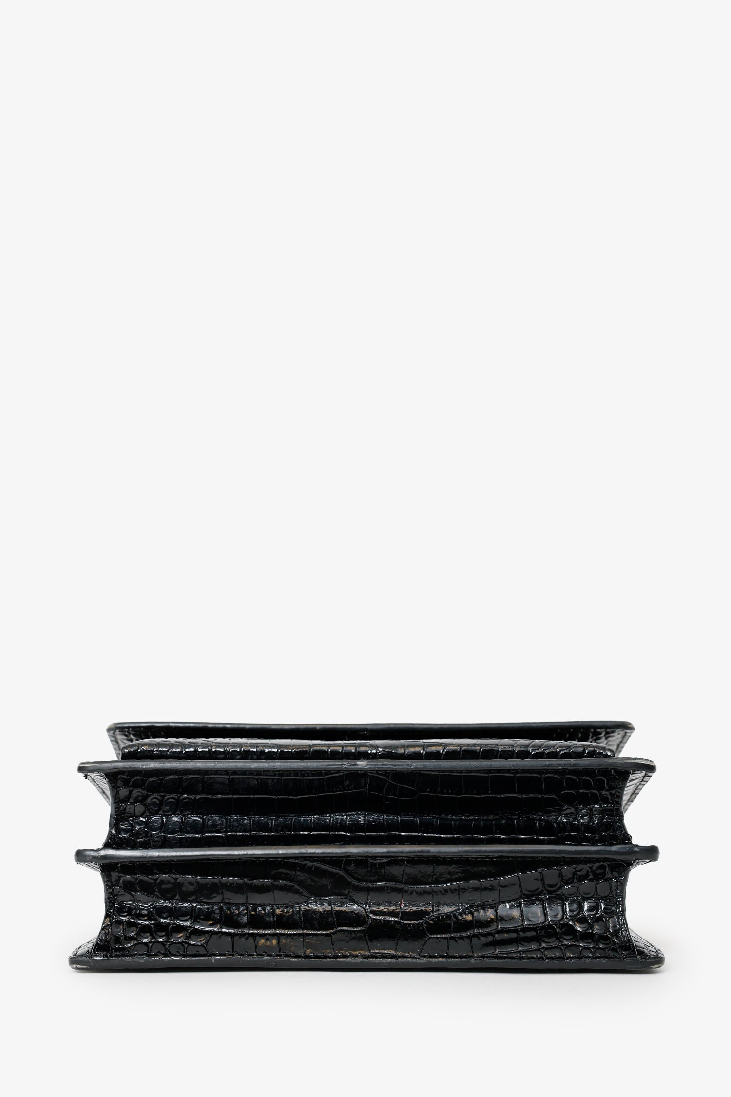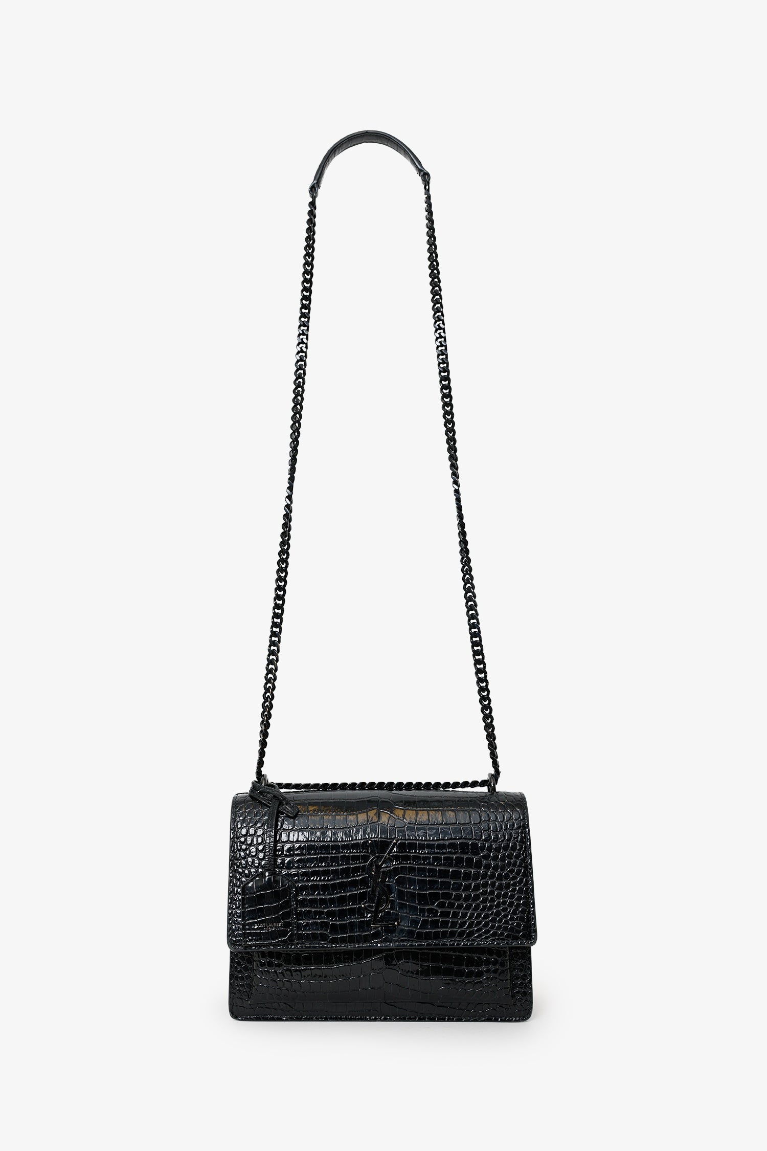 Saint Laurent So Black Croc Embossed Leather Medium 'Sunset' Shoulder Bag. Front fold-over flap with magnetic snap-button closure. Twin chainlink strap that can be pulled into one longer strap. Single rear exterior slip pocket. 3 interior compartments; front slip and middle slip and rear with single slip pocket. Suede-lined interior. Removable bag tag. Tonal hardware. Tonal stitching.