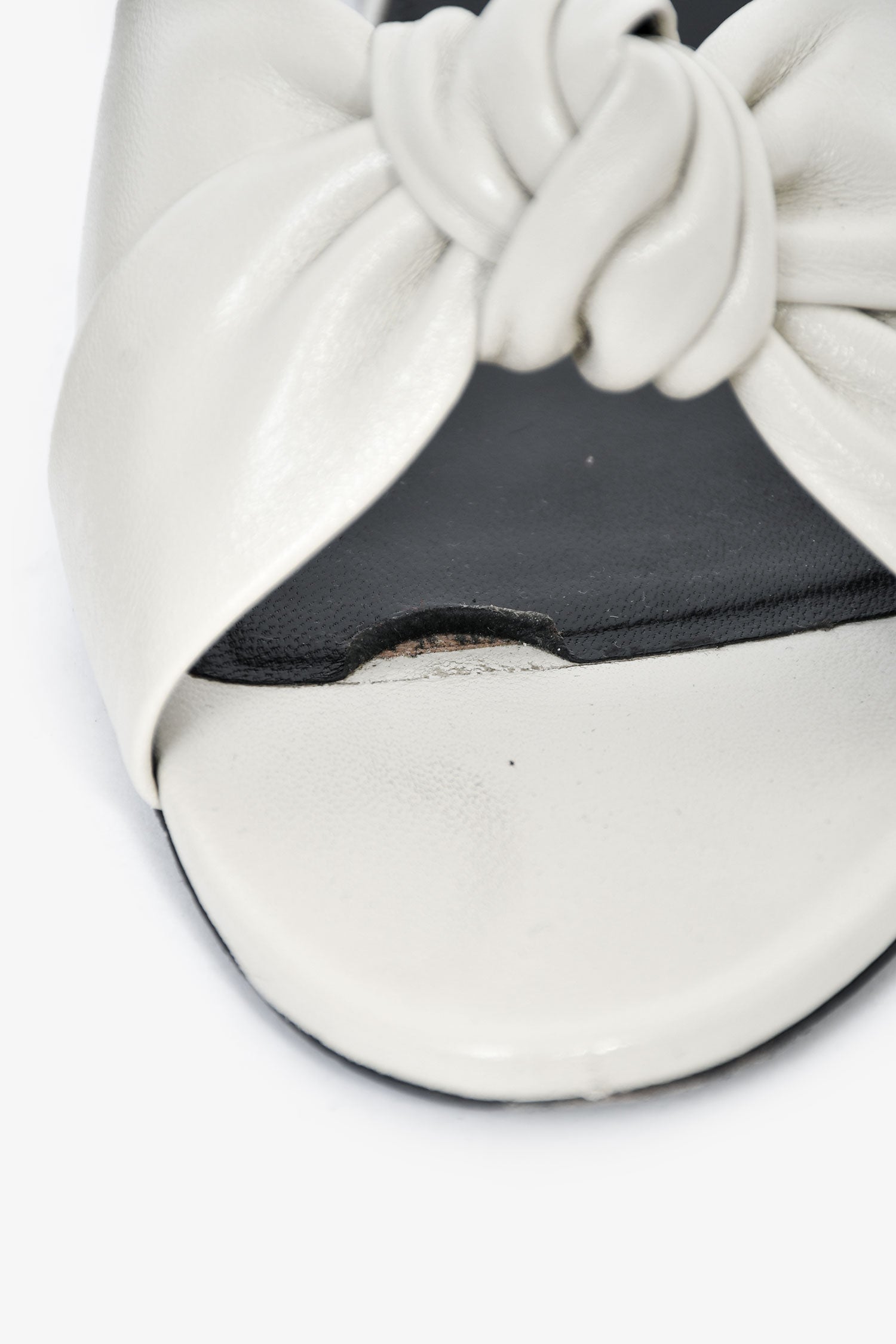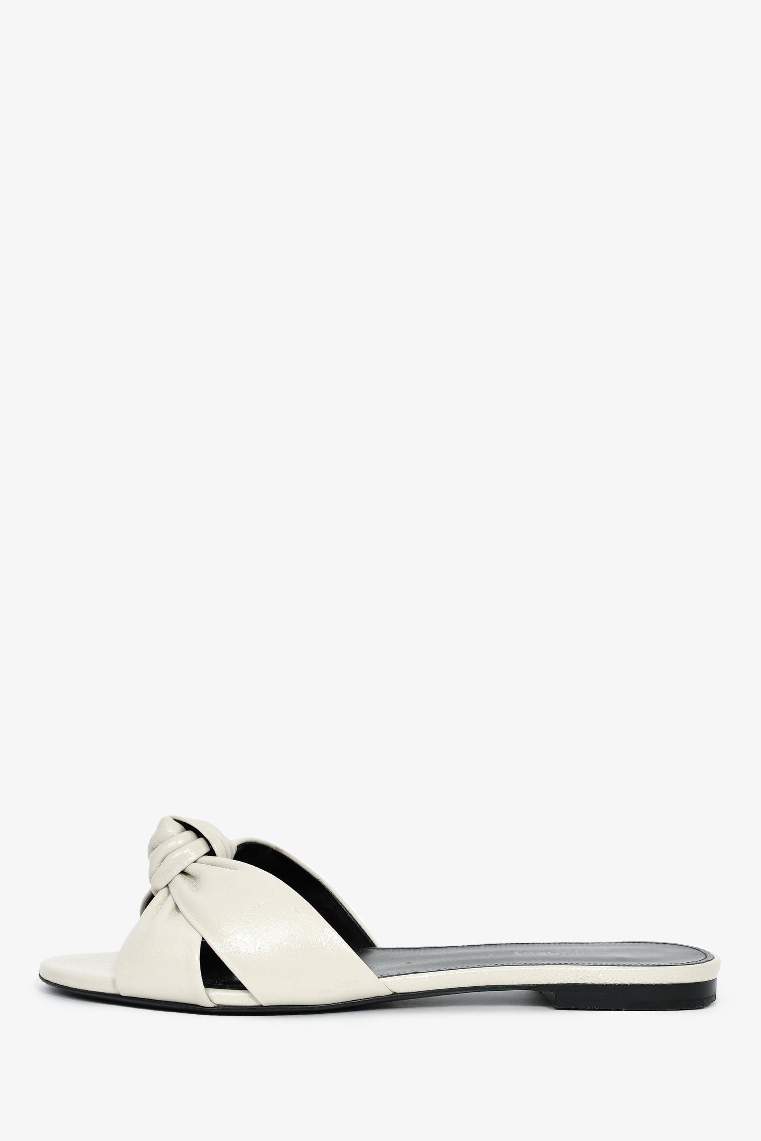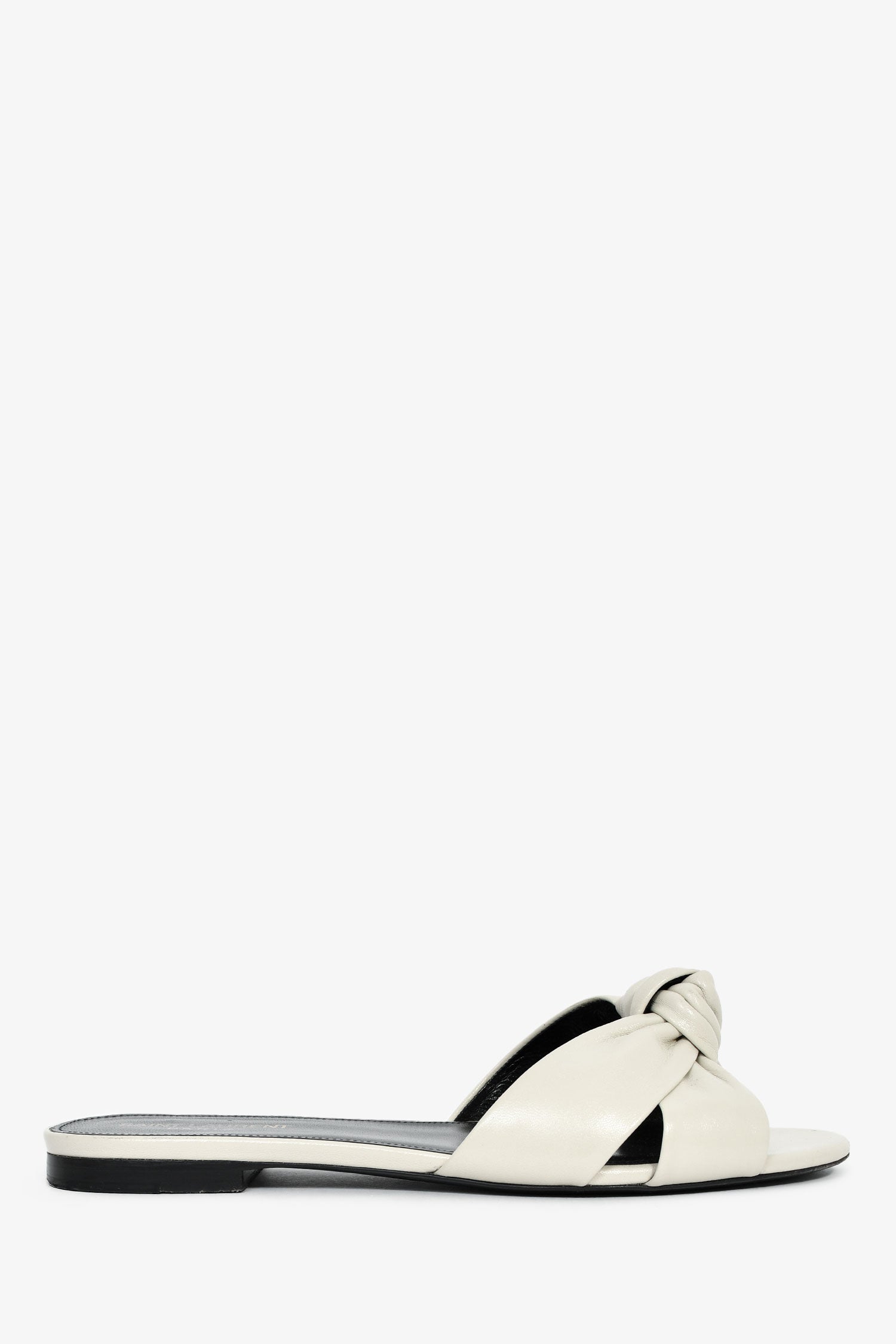 Saint Laurent White Leather Knot Flat Sandals. Slip-on. Round, open toe. Leather insoles. Tonal stitching.