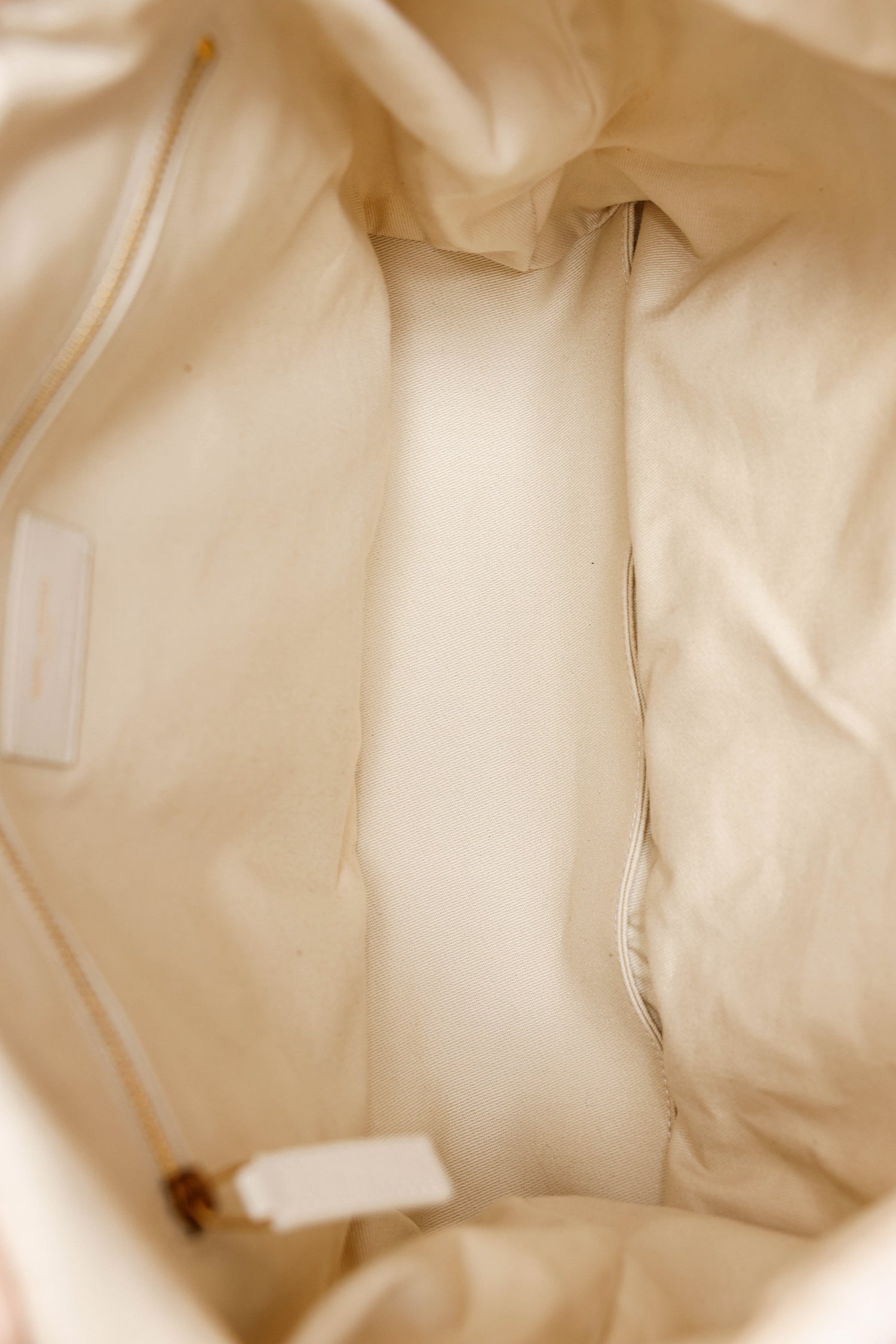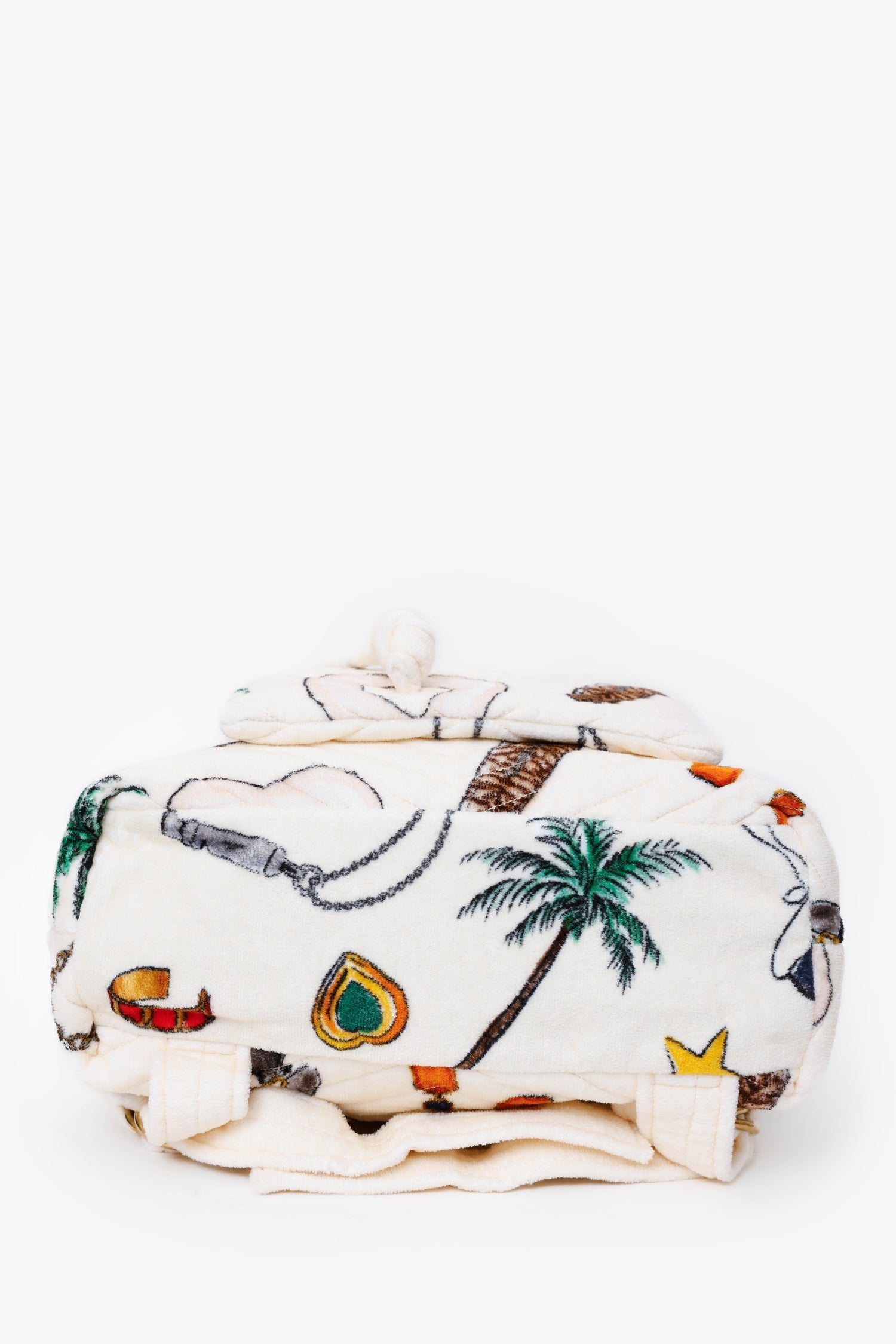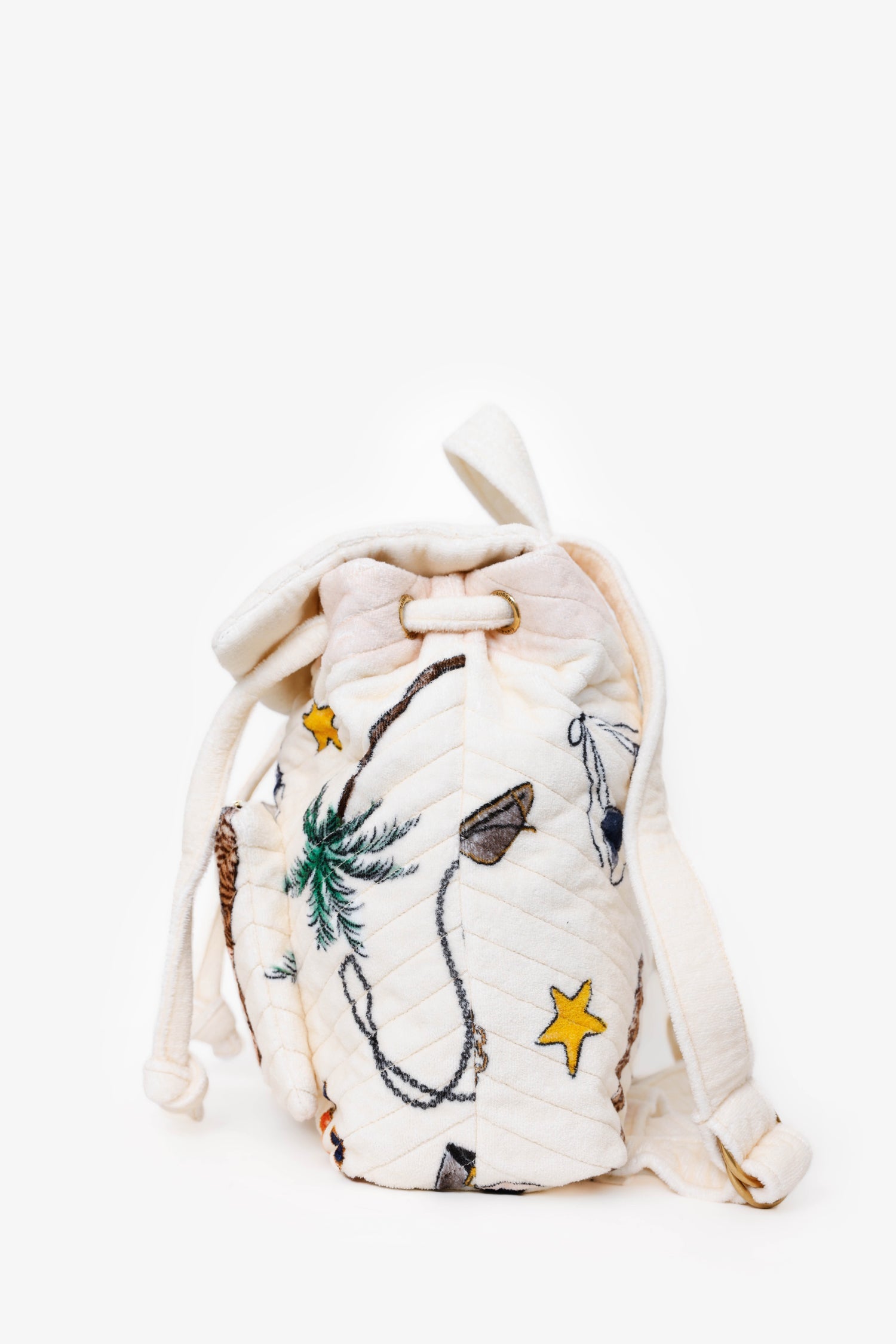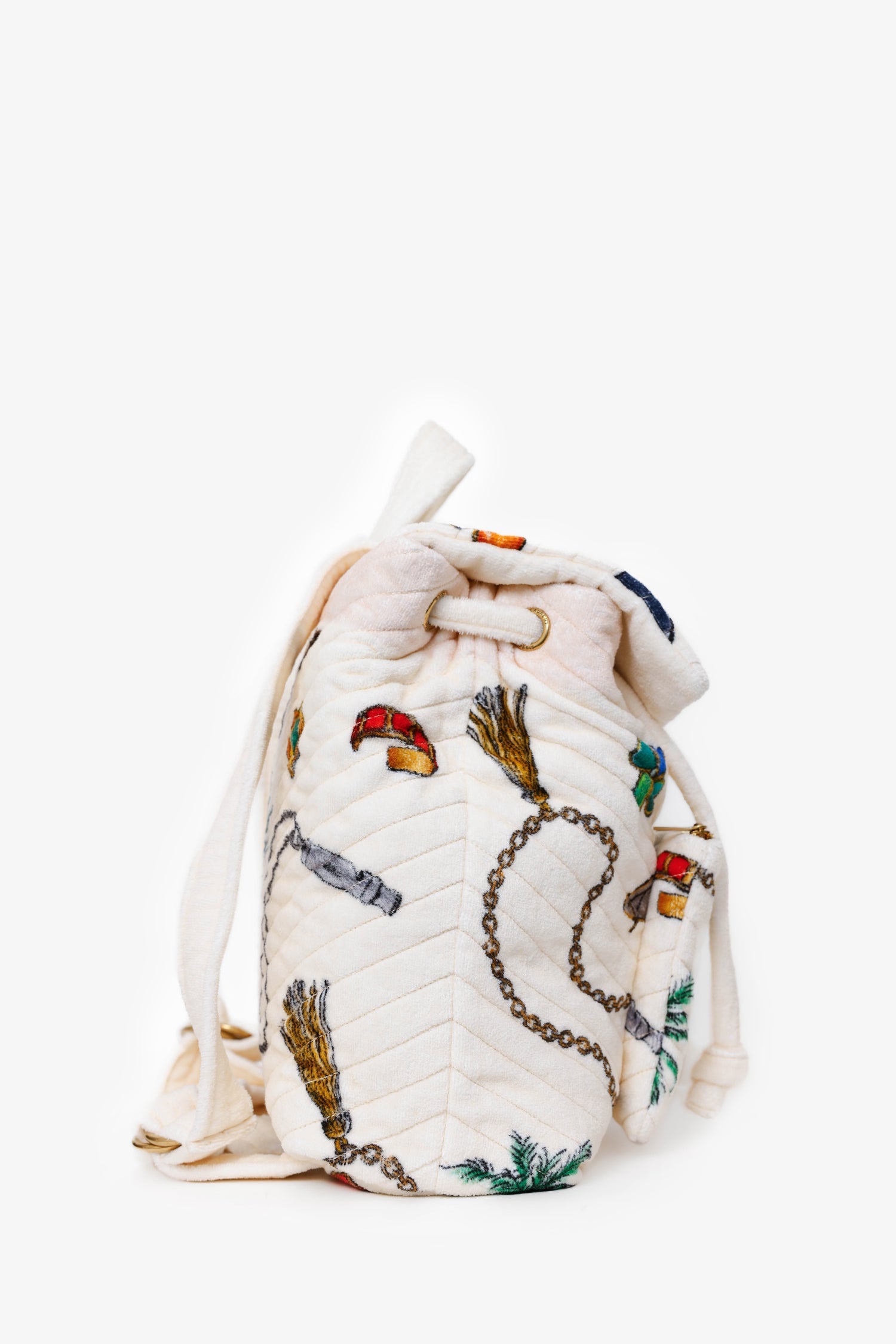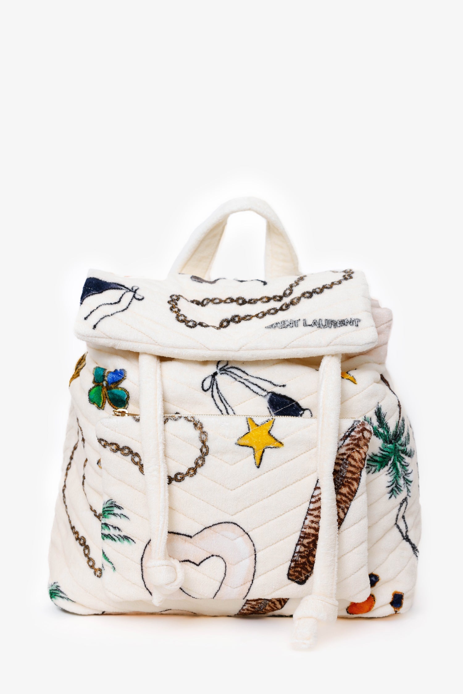 Saint Laurent White Terry Cloth Summer Print Backpack. Front fold-over flap with button-up closure and adjustable cinch cords. Top handle. 2 over-the-shoulder adjustable backpack straps with pull-through buckle closure. Front exterior pocket with zipper closure. Lined interior. Single interior pocket with zip closure. Gold-tone hardware. Tonal stitching.
