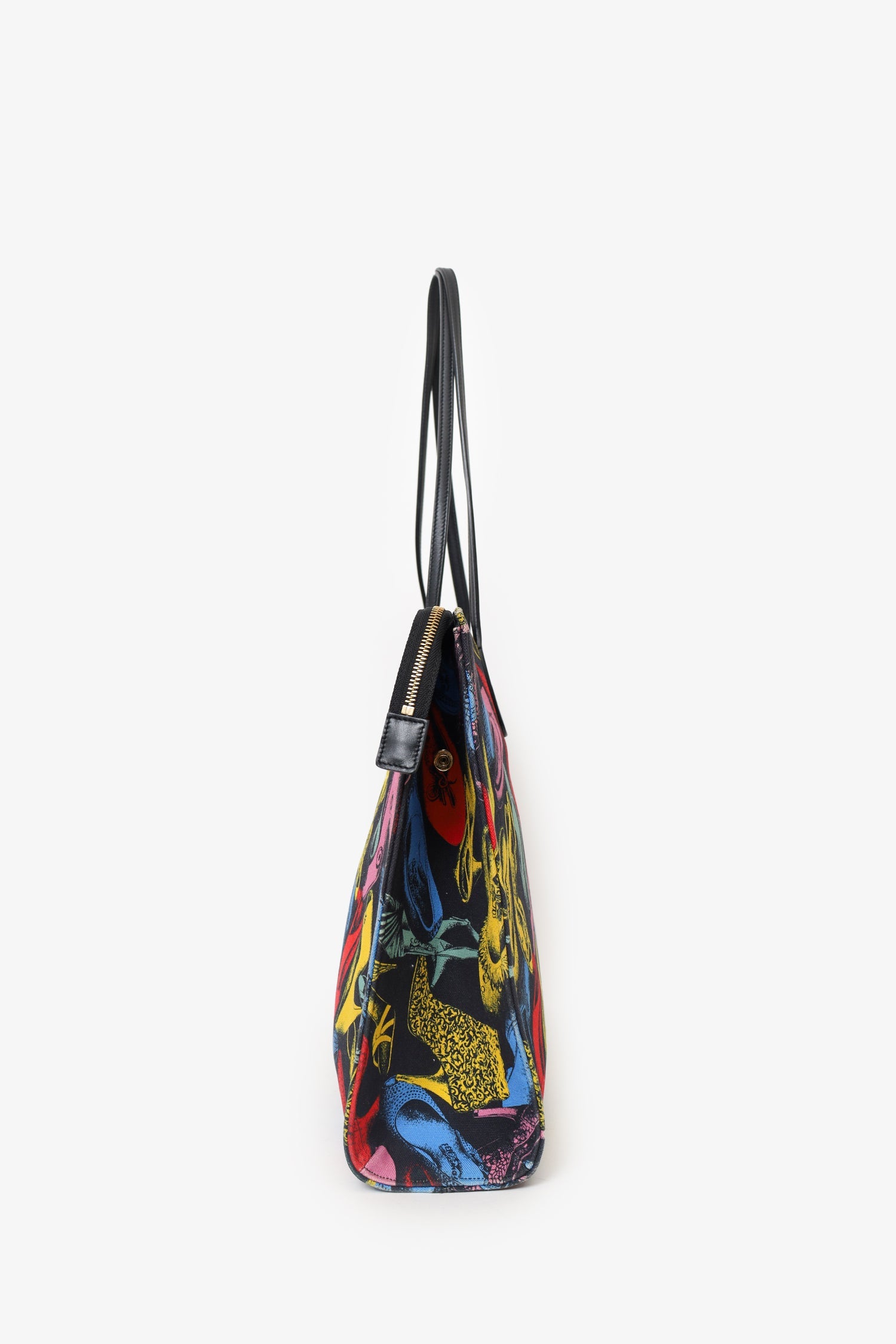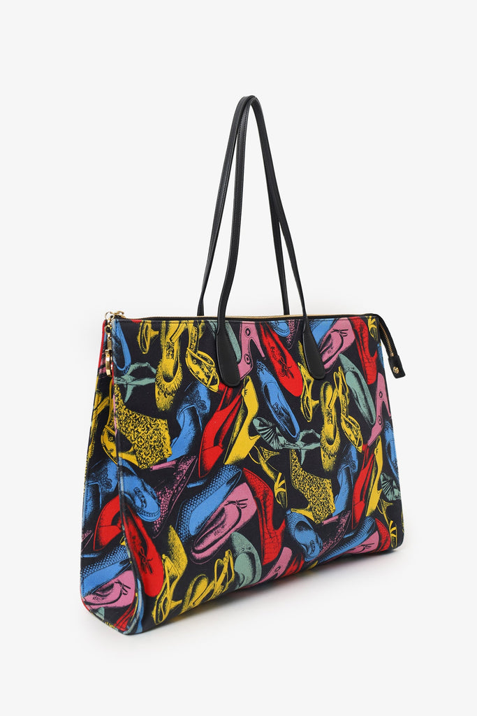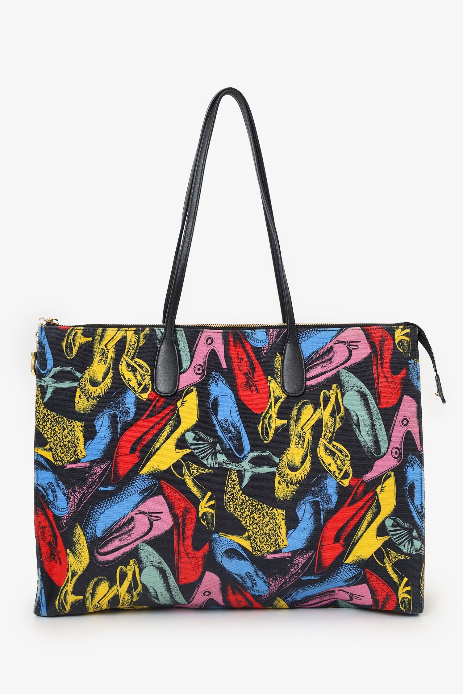 Salvatore Ferragam Black/Multicolour Canvas Shoe Printed Shopping Tote. Top zip closure. Protective base studs. Twin top shoulder straps. Interior lining. Single interior zip pocket. Tonal stitching. Gold-tone hardware.