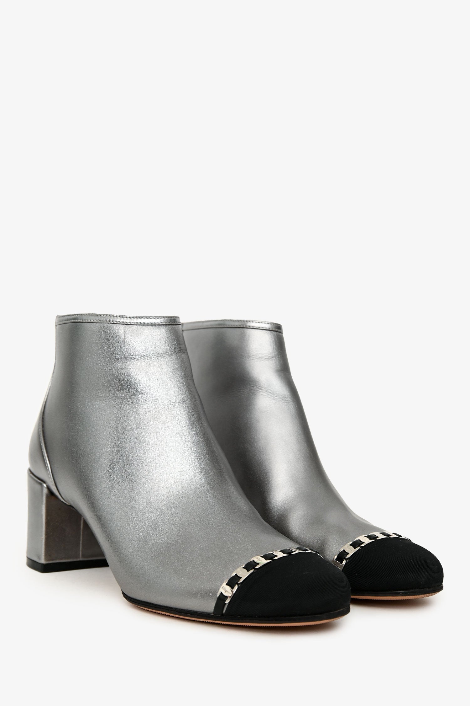 Salvatore Ferragamo Silver/Black Leather Cap Toe Chain Logo Ankle Boots. Pull-on. Round toe. Back zipper closure. Silver-tone hardware. Tonal Stitching.