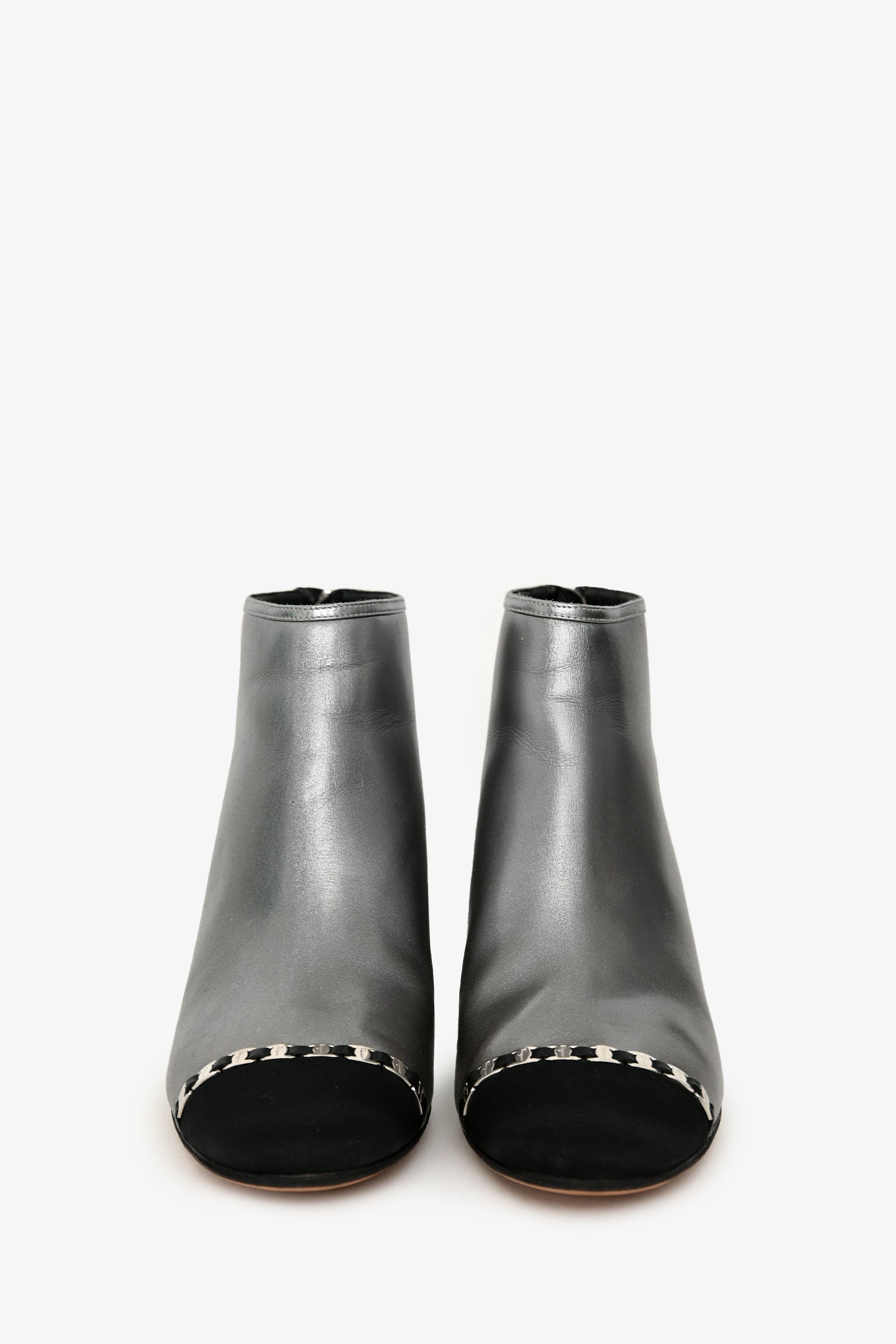 Salvatore Ferragamo Silver/Black Leather Cap Toe Chain Logo Ankle Boots. Pull-on. Round toe. Back zipper closure. Silver-tone hardware. Tonal Stitching.