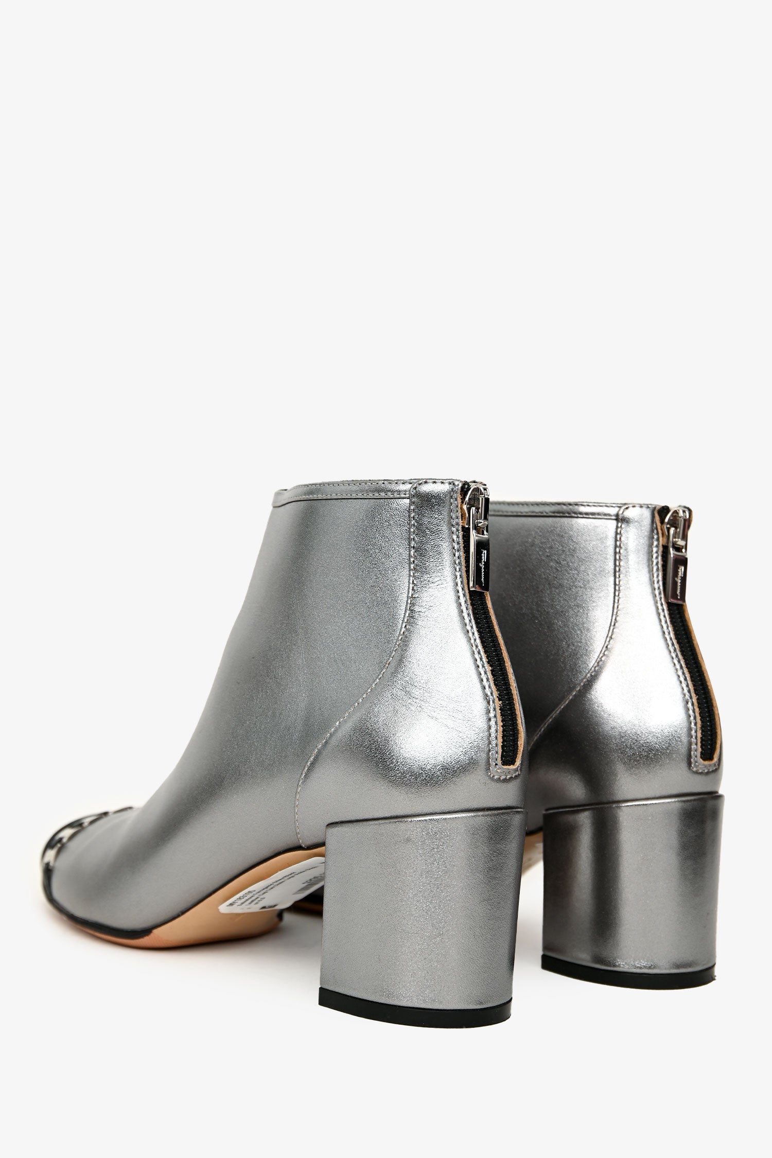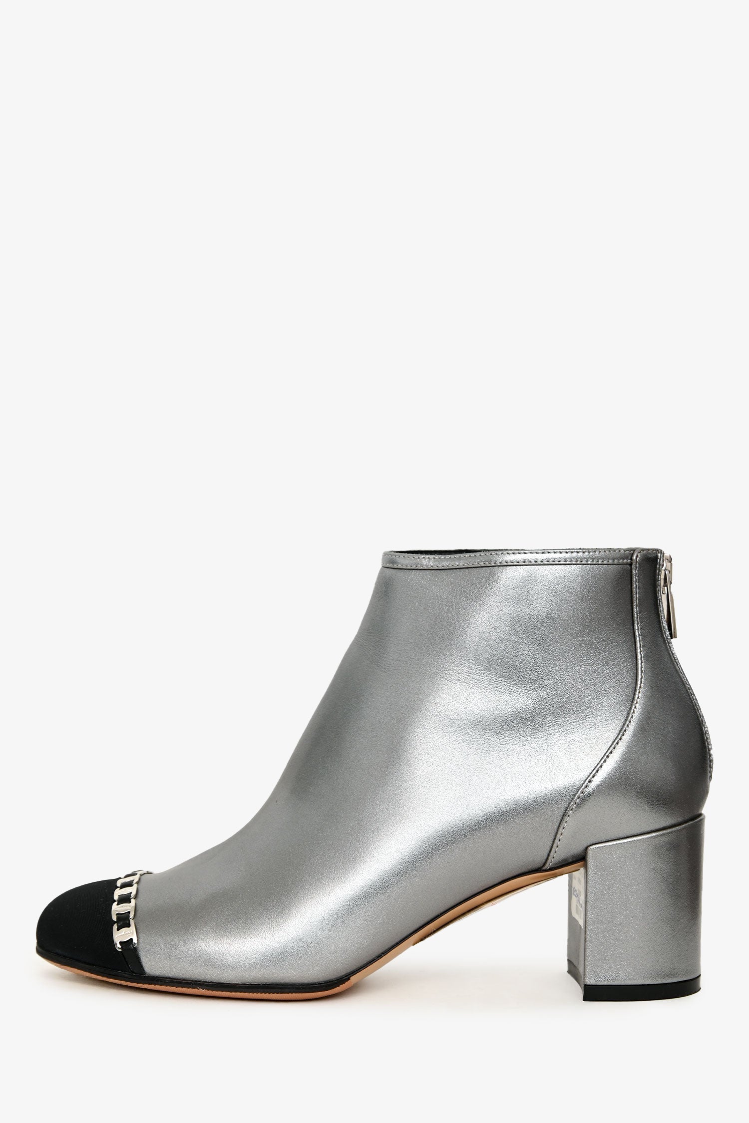 Salvatore Ferragamo Silver/Black Leather Cap Toe Chain Logo Ankle Boots Size 36.5