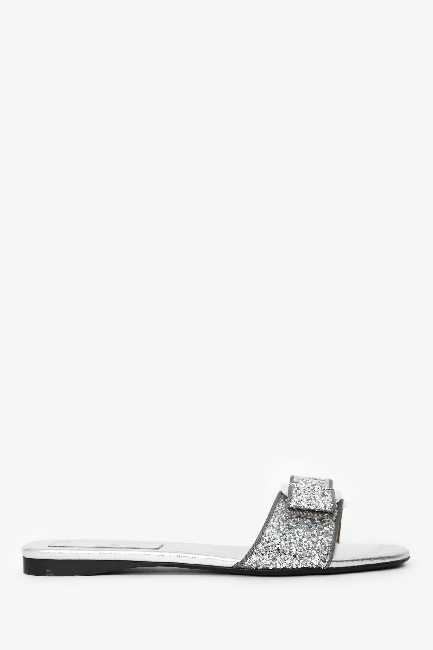 Salvatore Ferragamo Silver Glitter Vara Bow Slide Sandals. Slip-on. Round, open toe. Metallic leather insole. Silver-tone hardware. Tonal stitching.