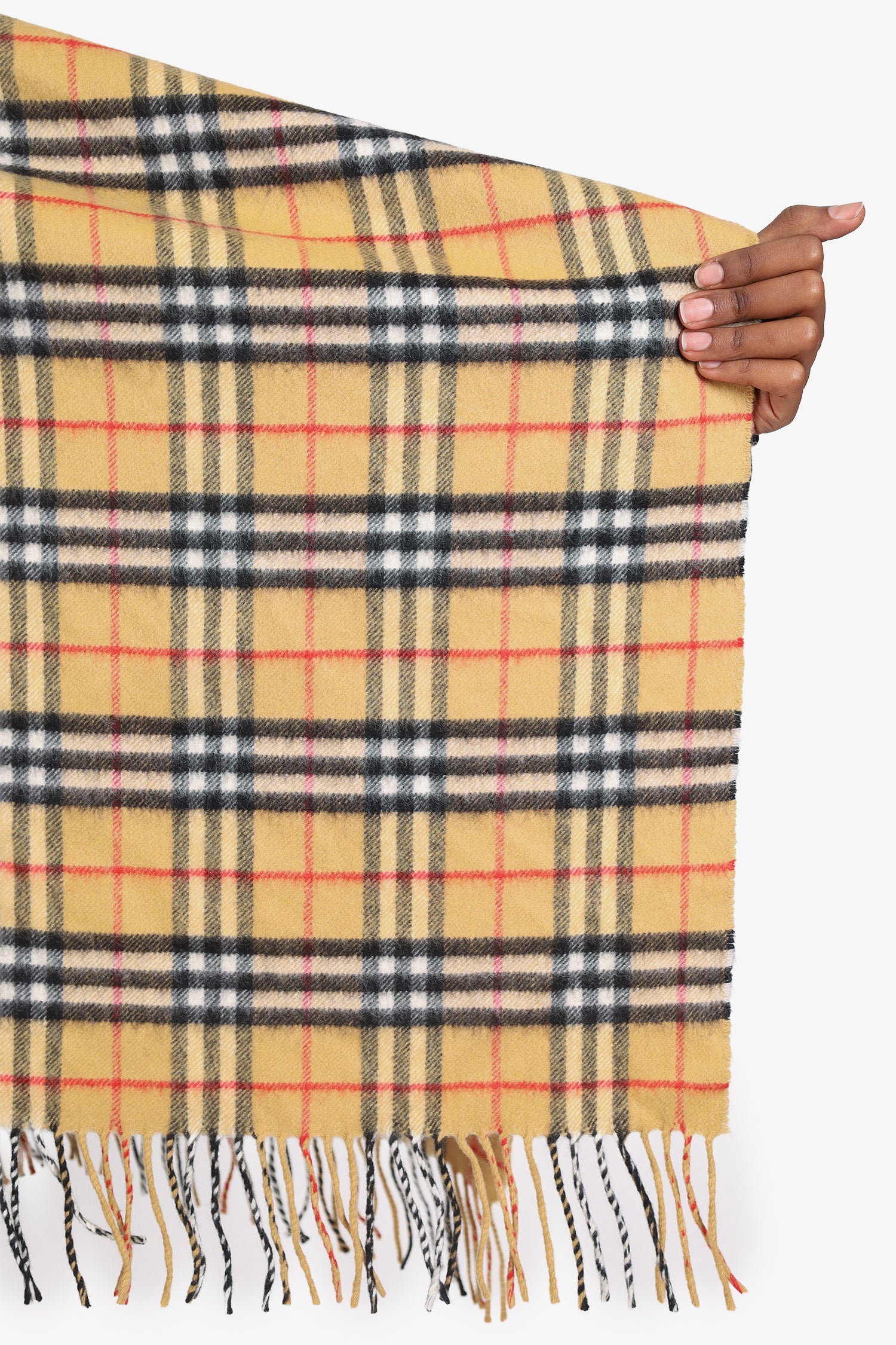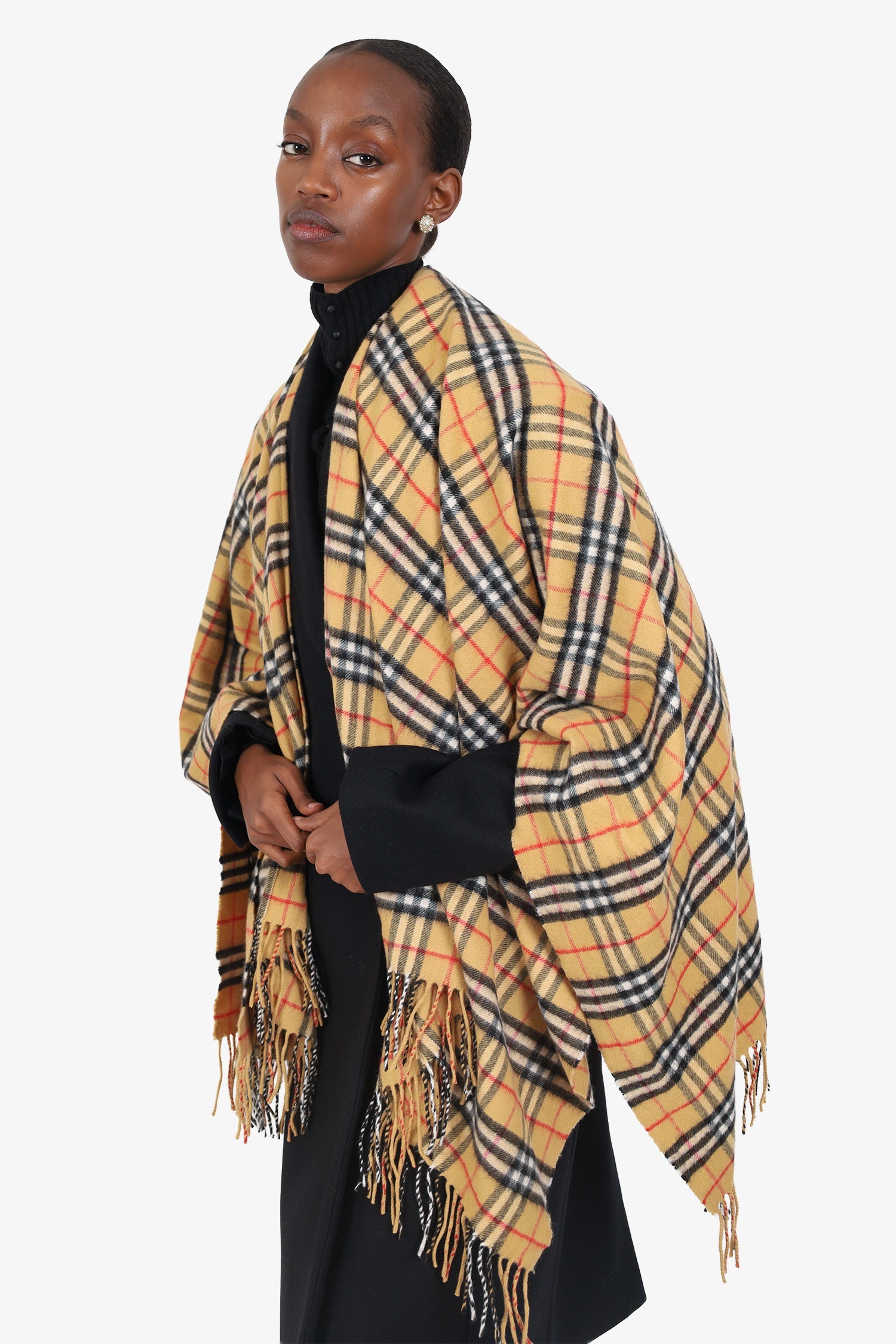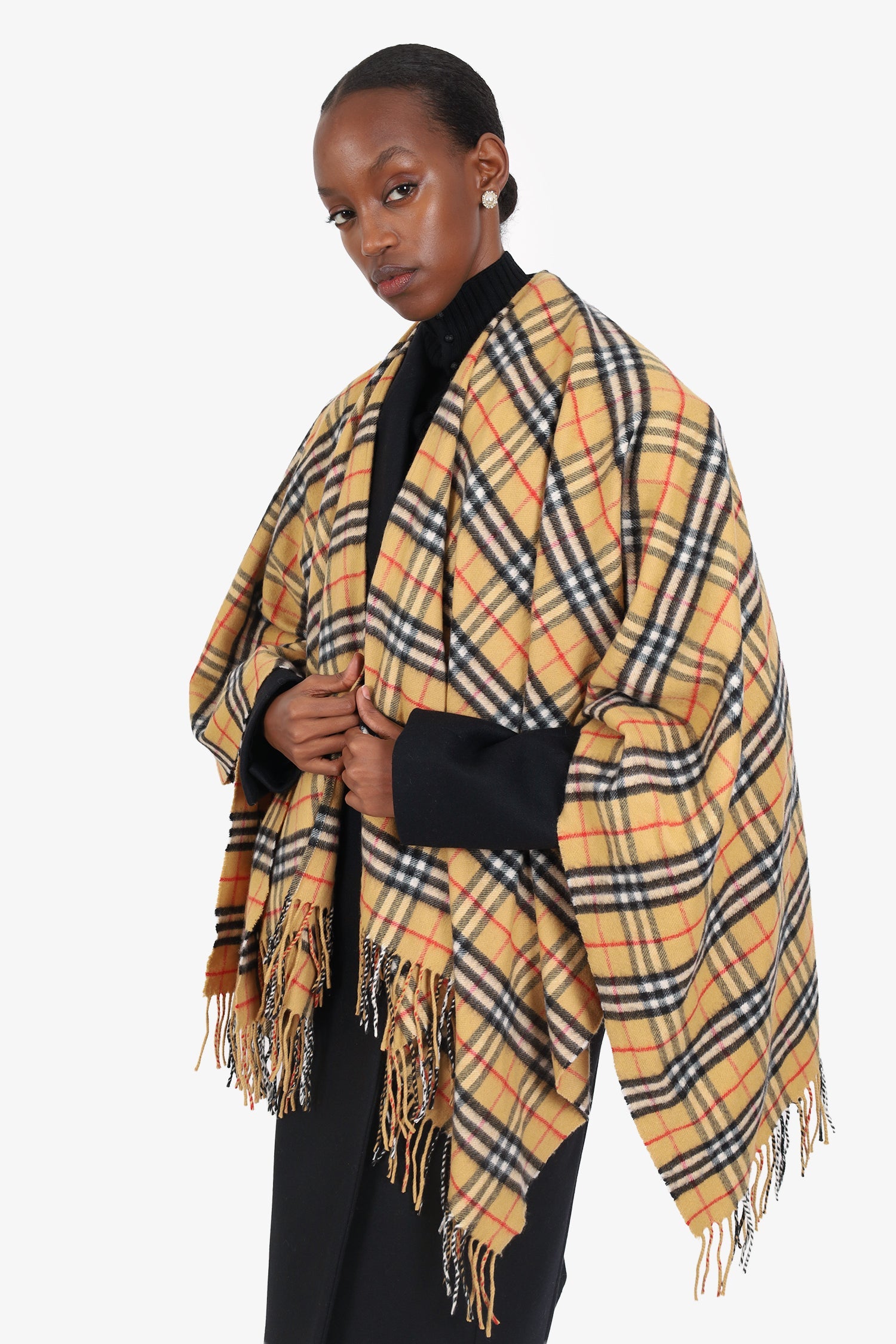 Burberry Beige Check Wool/Cashmere Fringed Cape. Fringe ends. Tonal stitching.