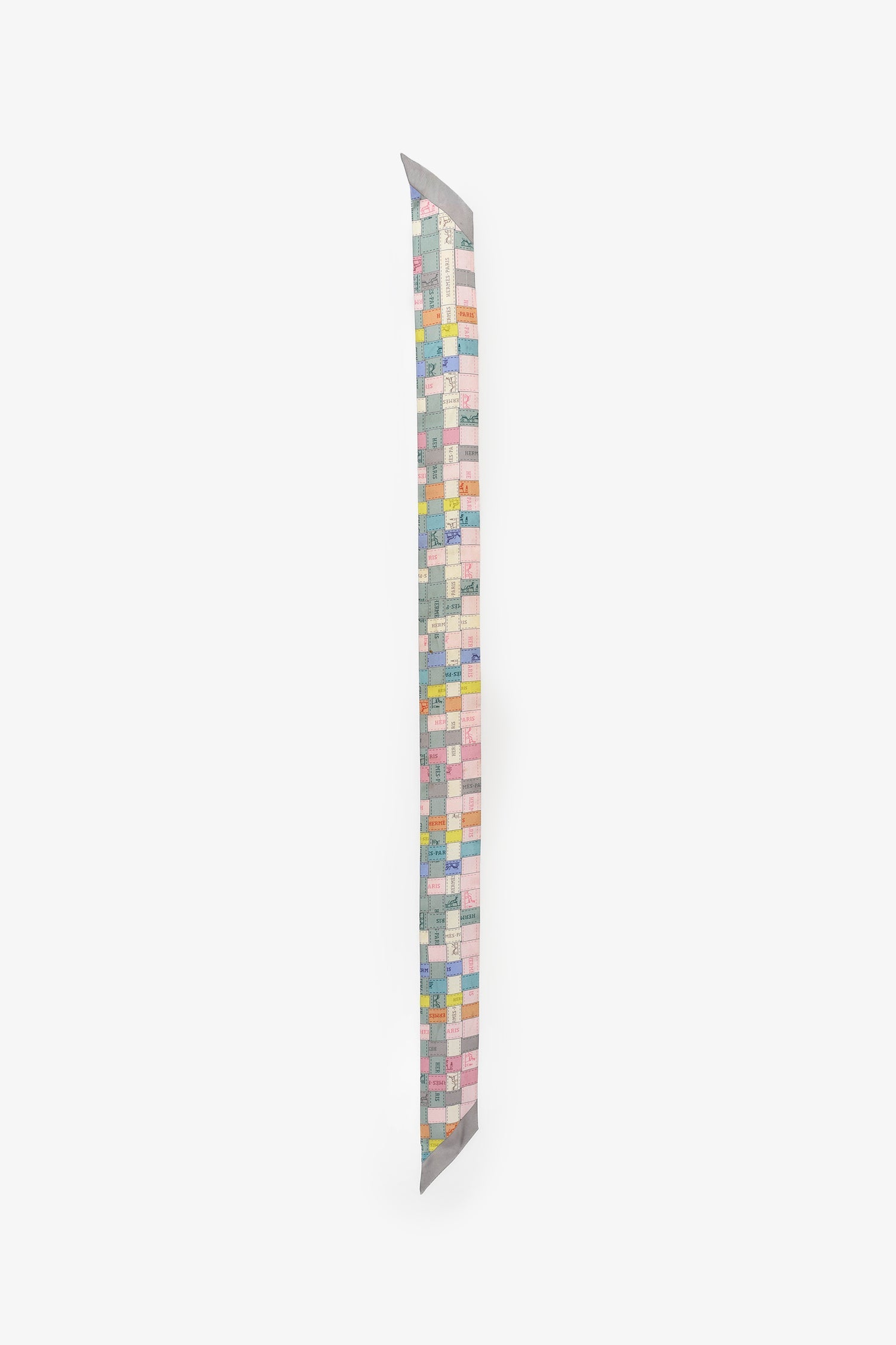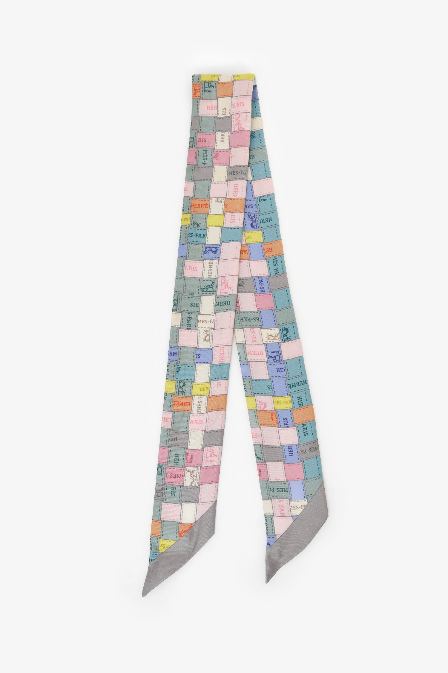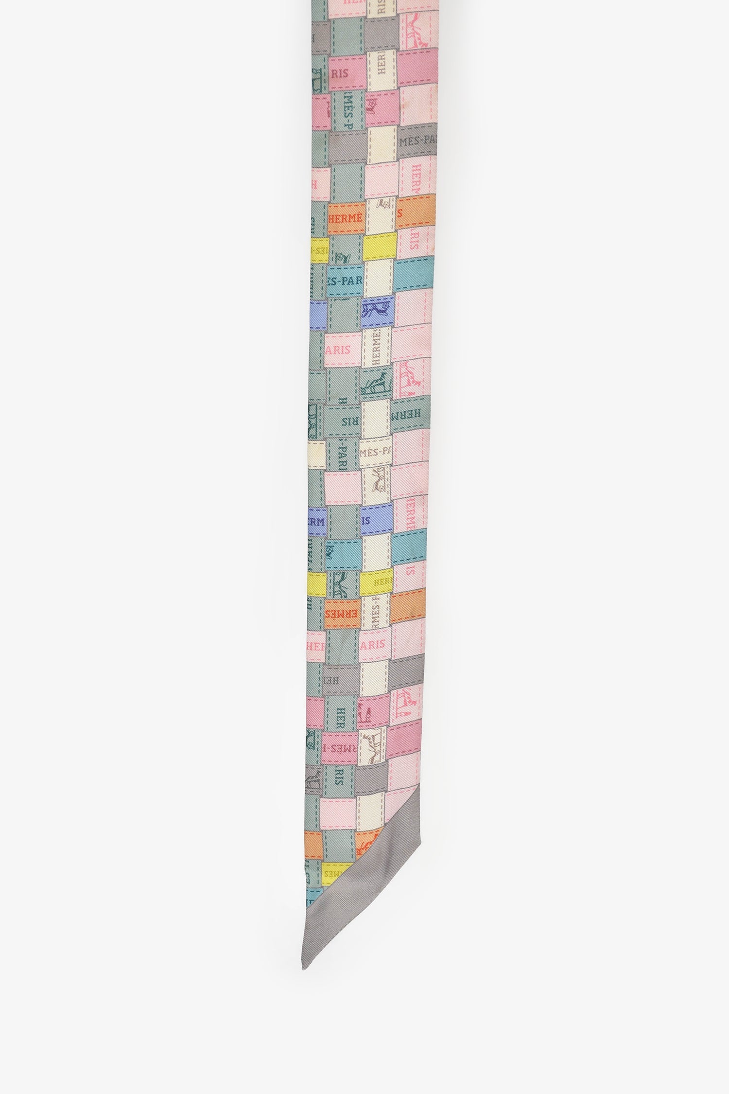 Hermès Blue/Pink Silk Woven Printed Twilly. Tonal stitching.