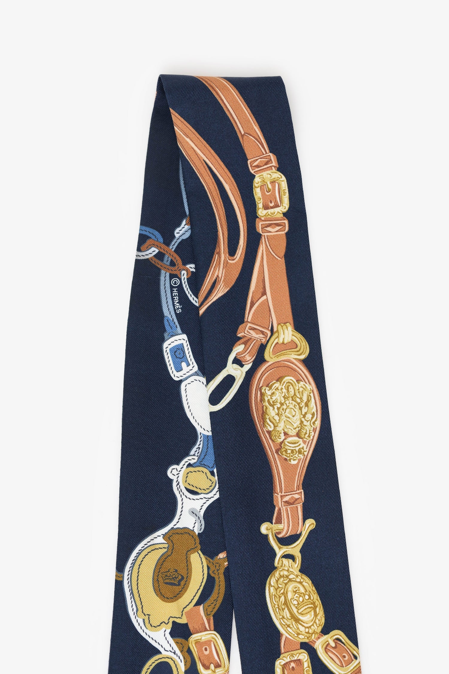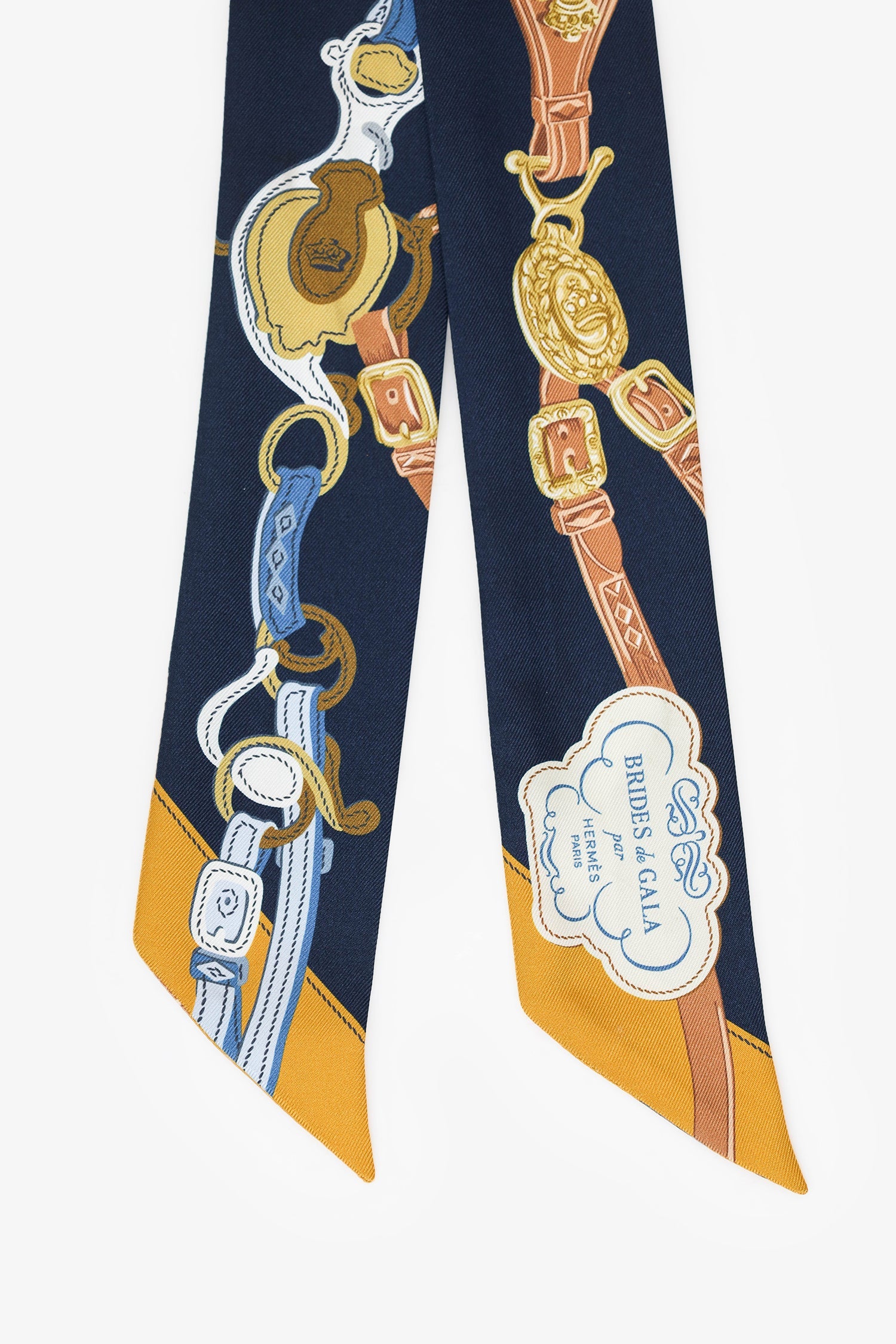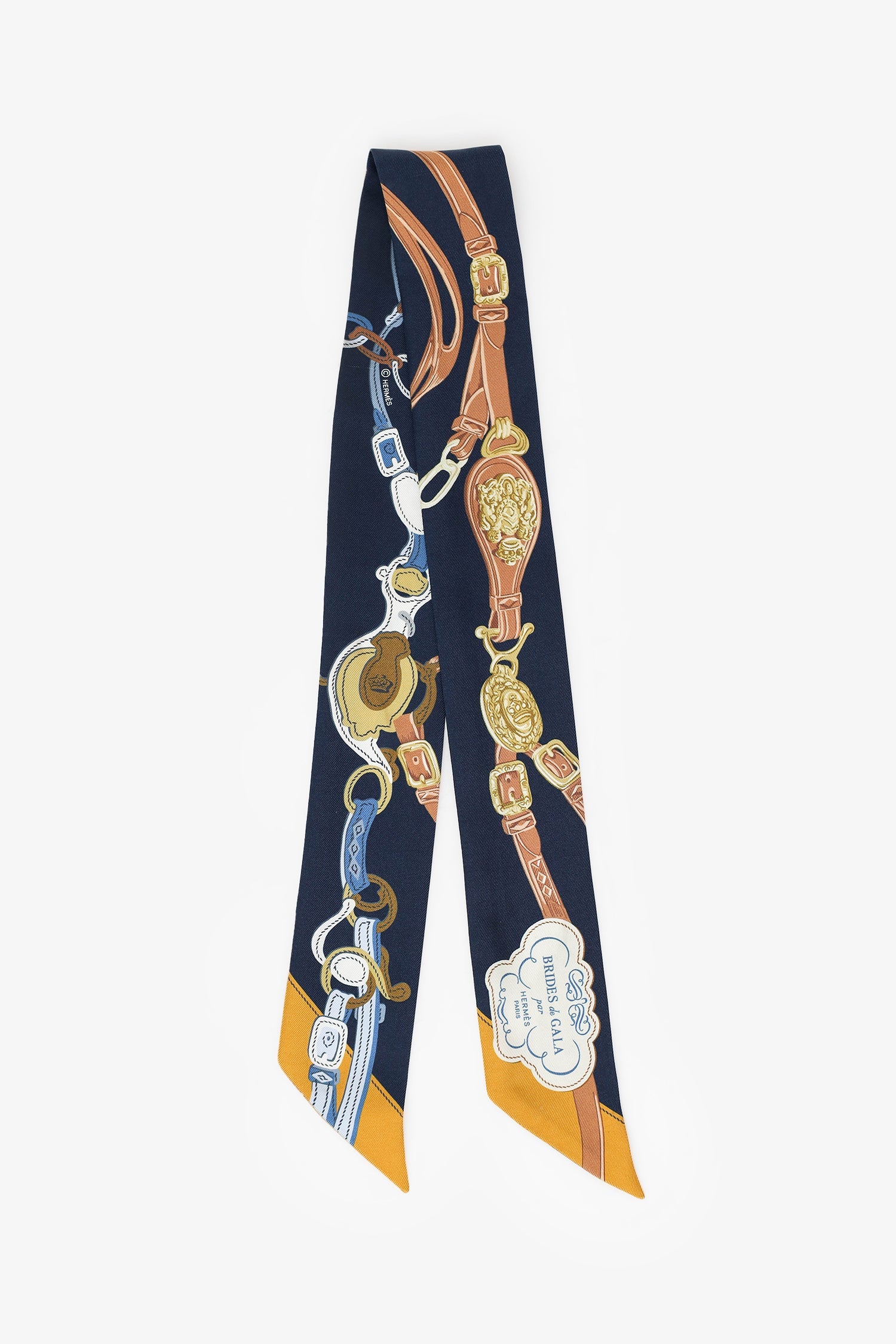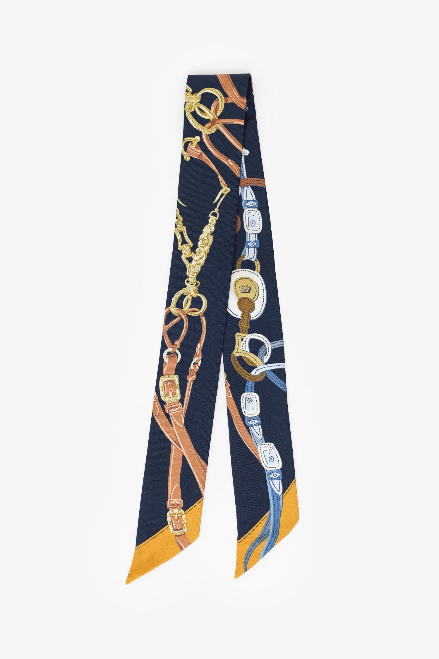 Hermès Blue/Yellow Silk 'Cavalcades' Twilly. Tonal stitching.