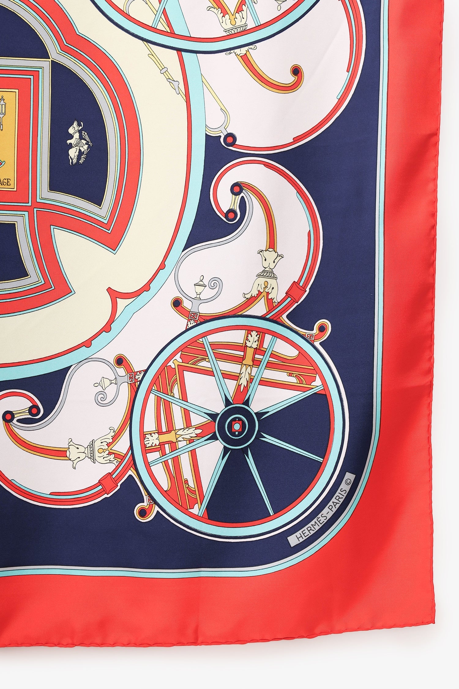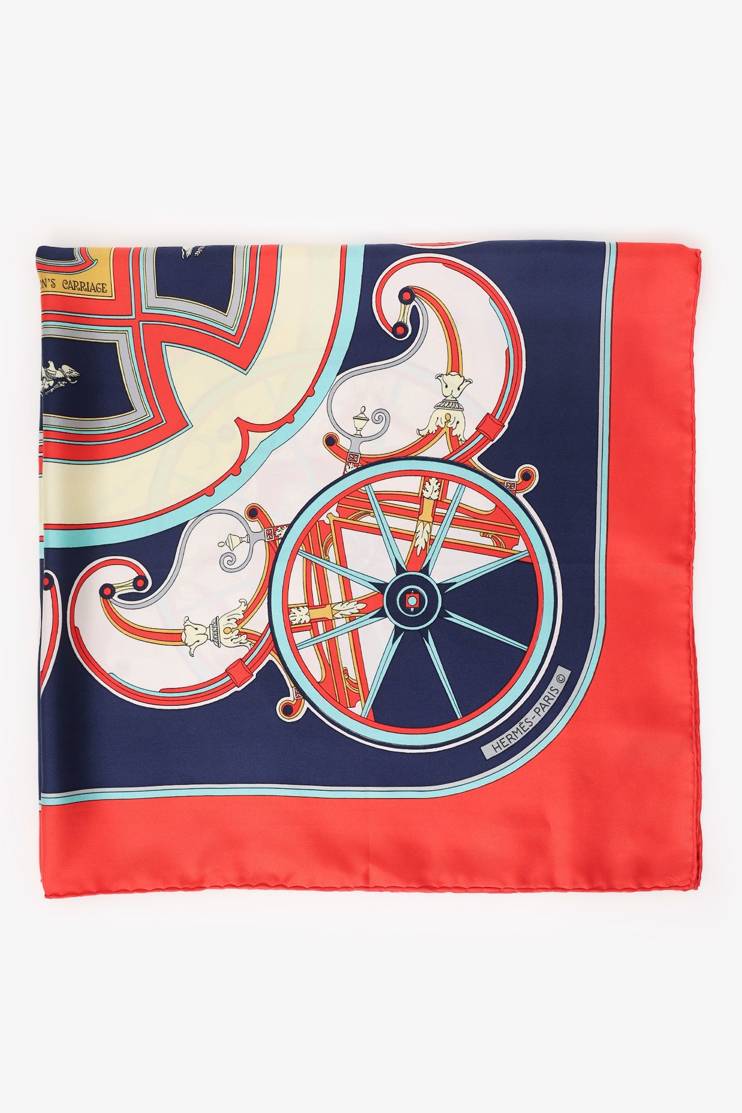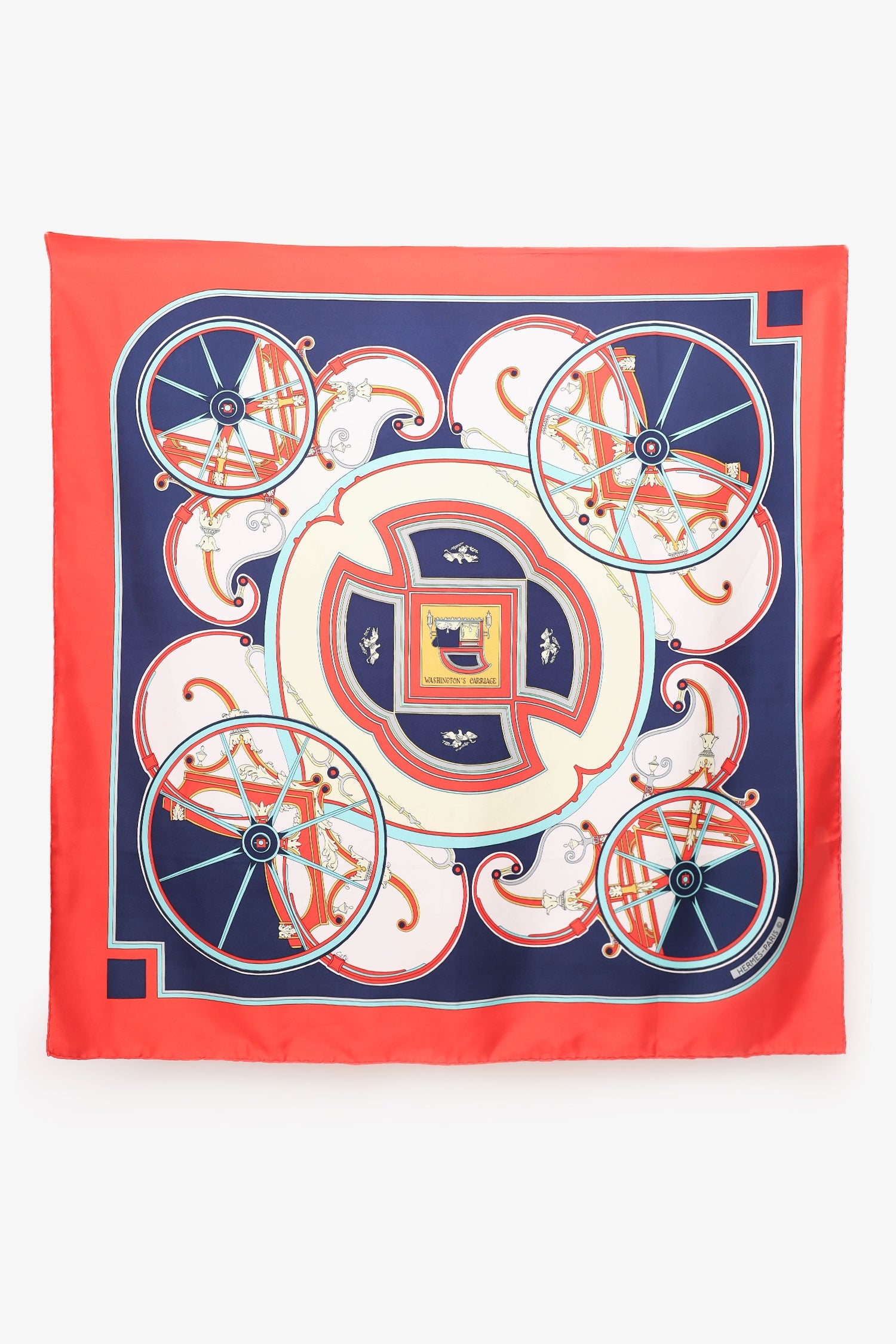 Hermès Red Silk 'Washington's Carriage' Scarf. Tonal stitching.