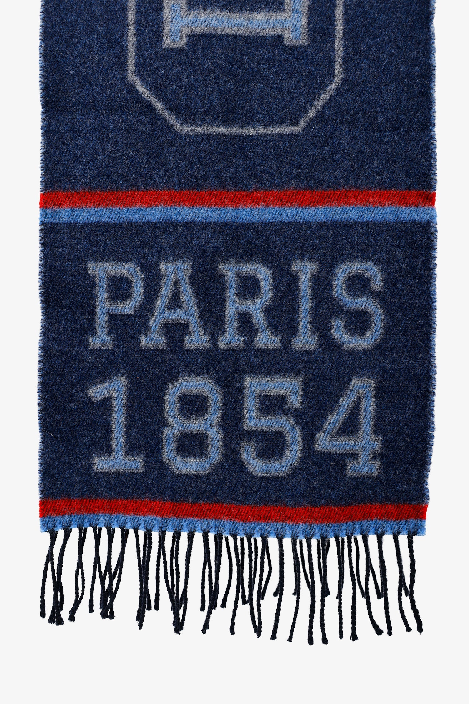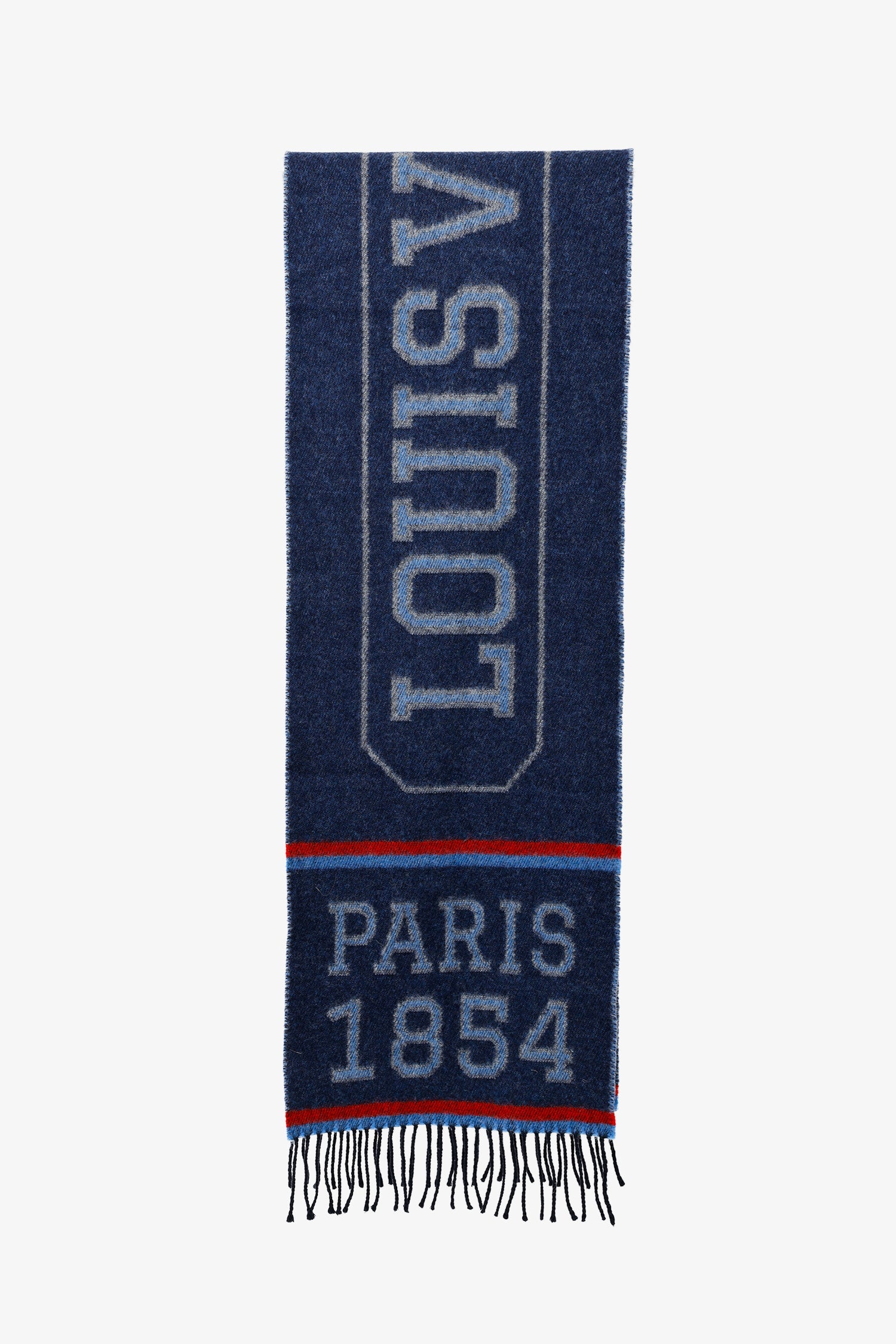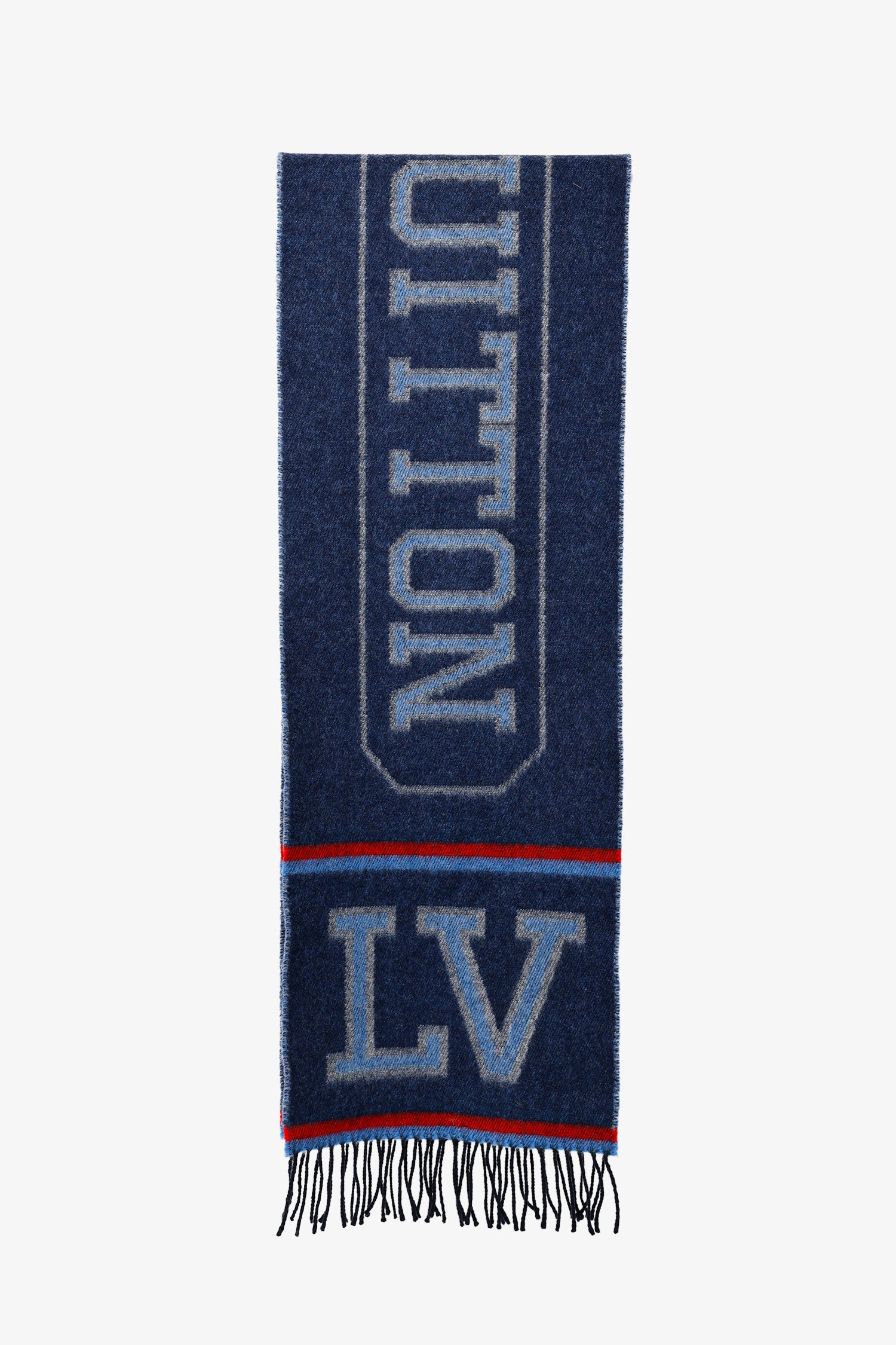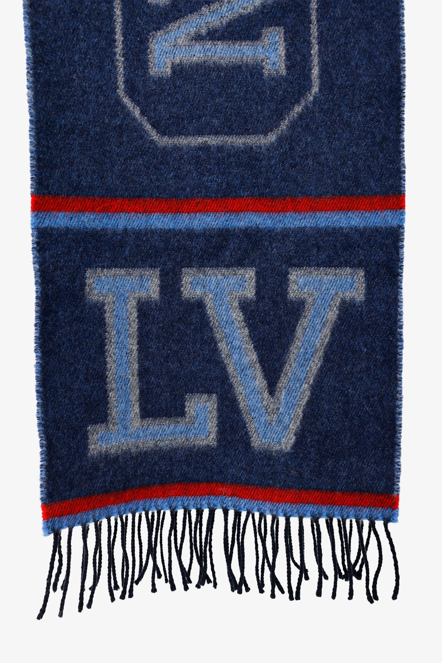 Louis Vuitton Navy/Red Wool/Cashmere Logo Fringe Scarf. Tonal stitching.