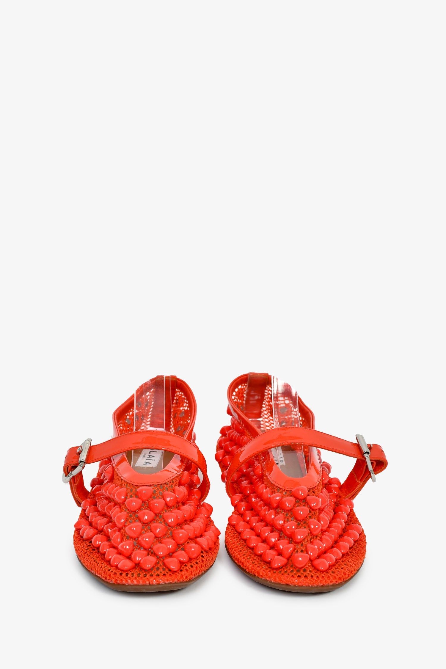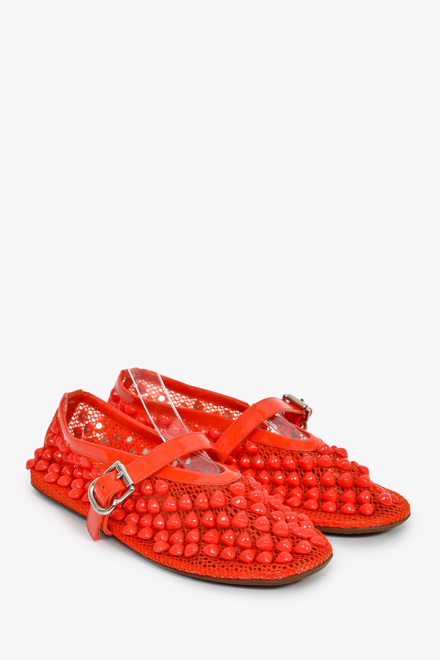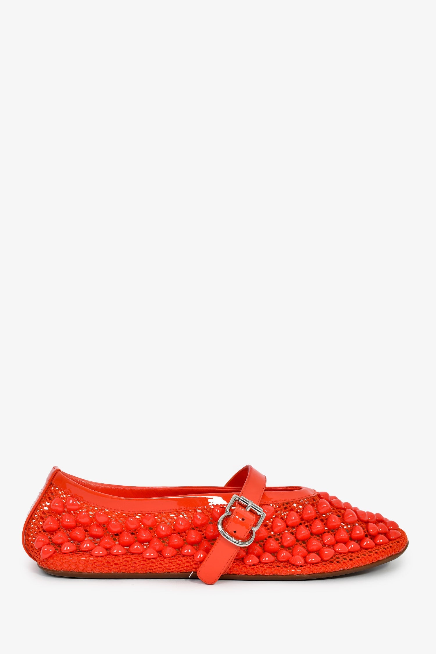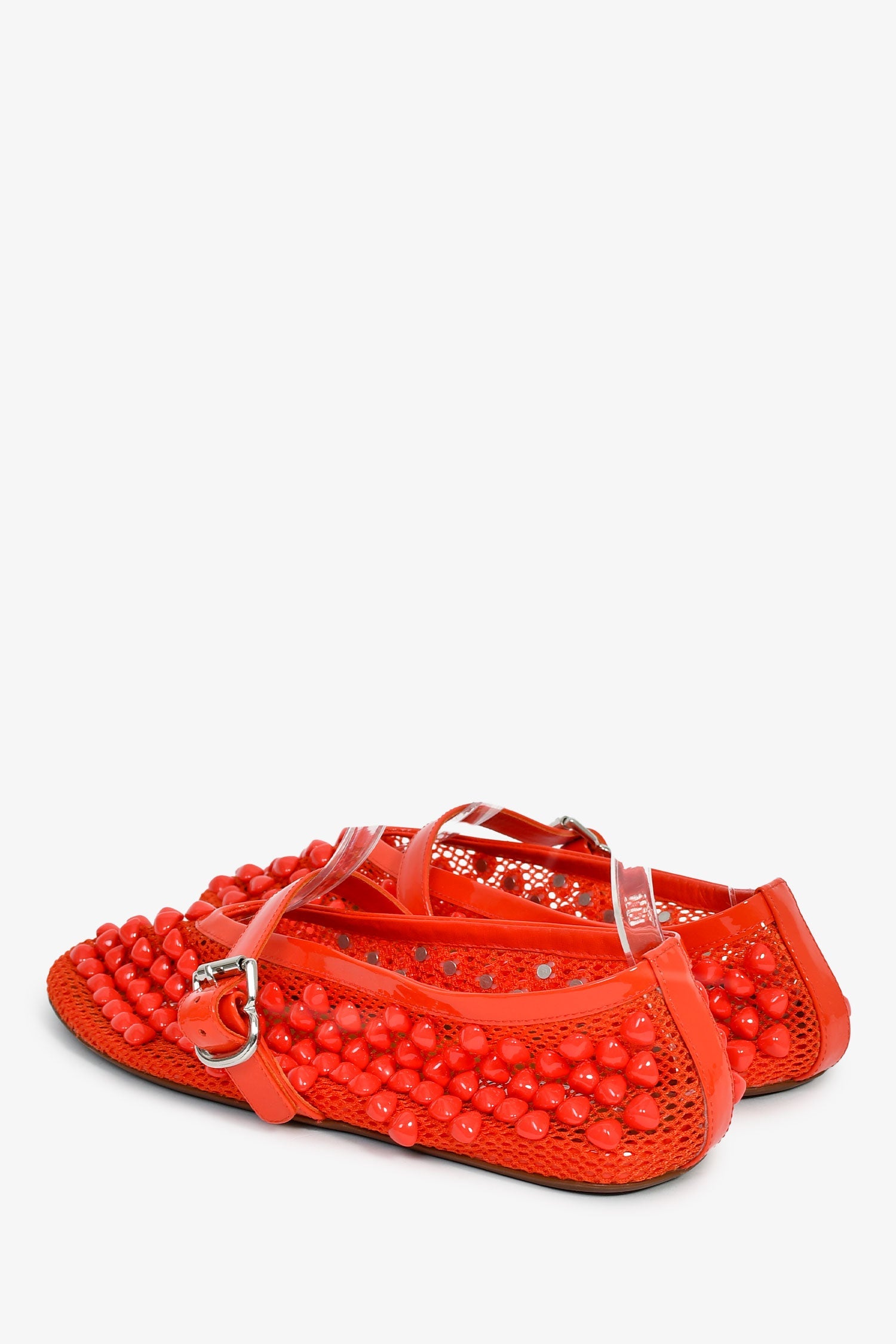 Alaia Red Beaded Ballet Flats. Round toe. Leather insoles. Silver-tone hardware. Tonal stitching.