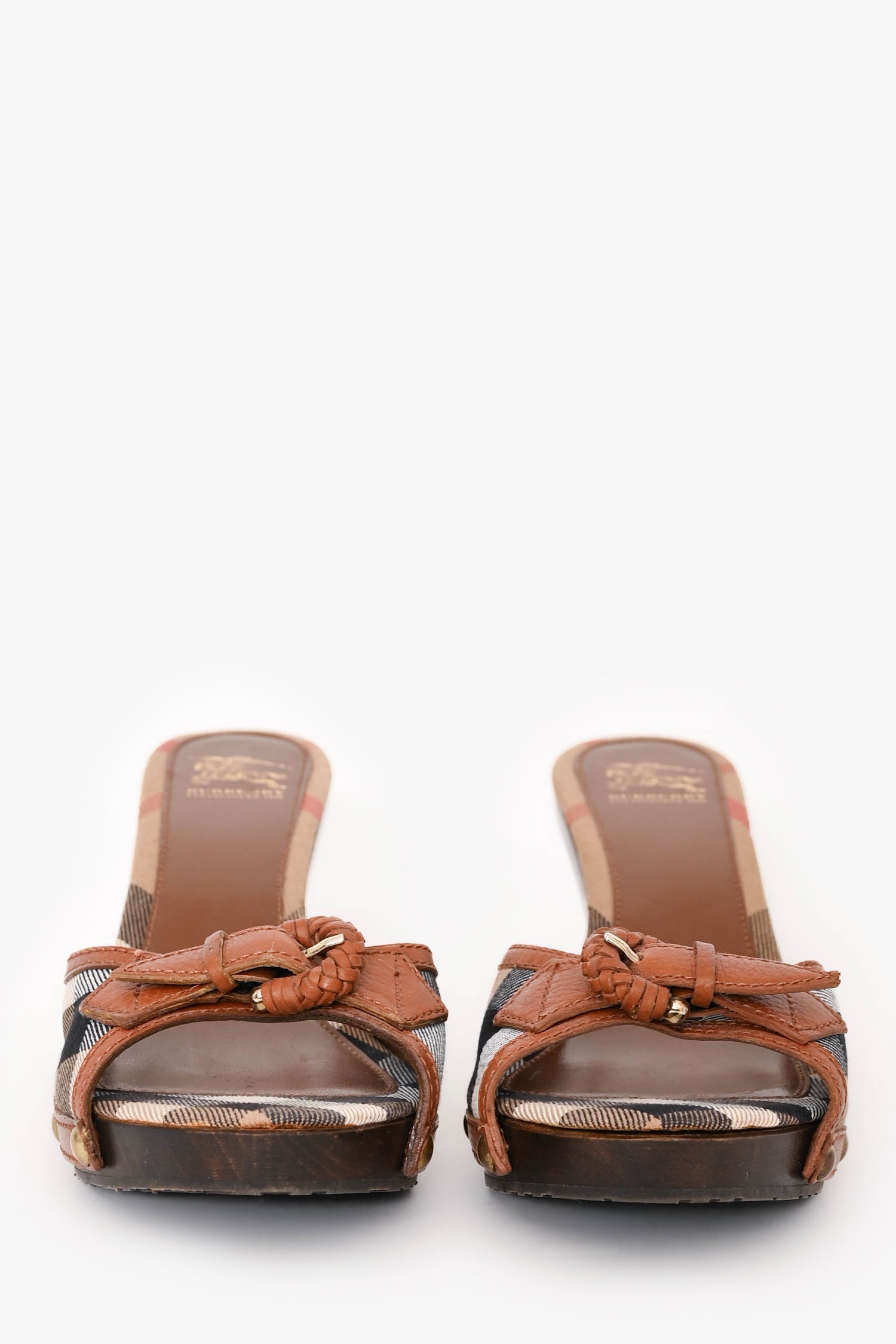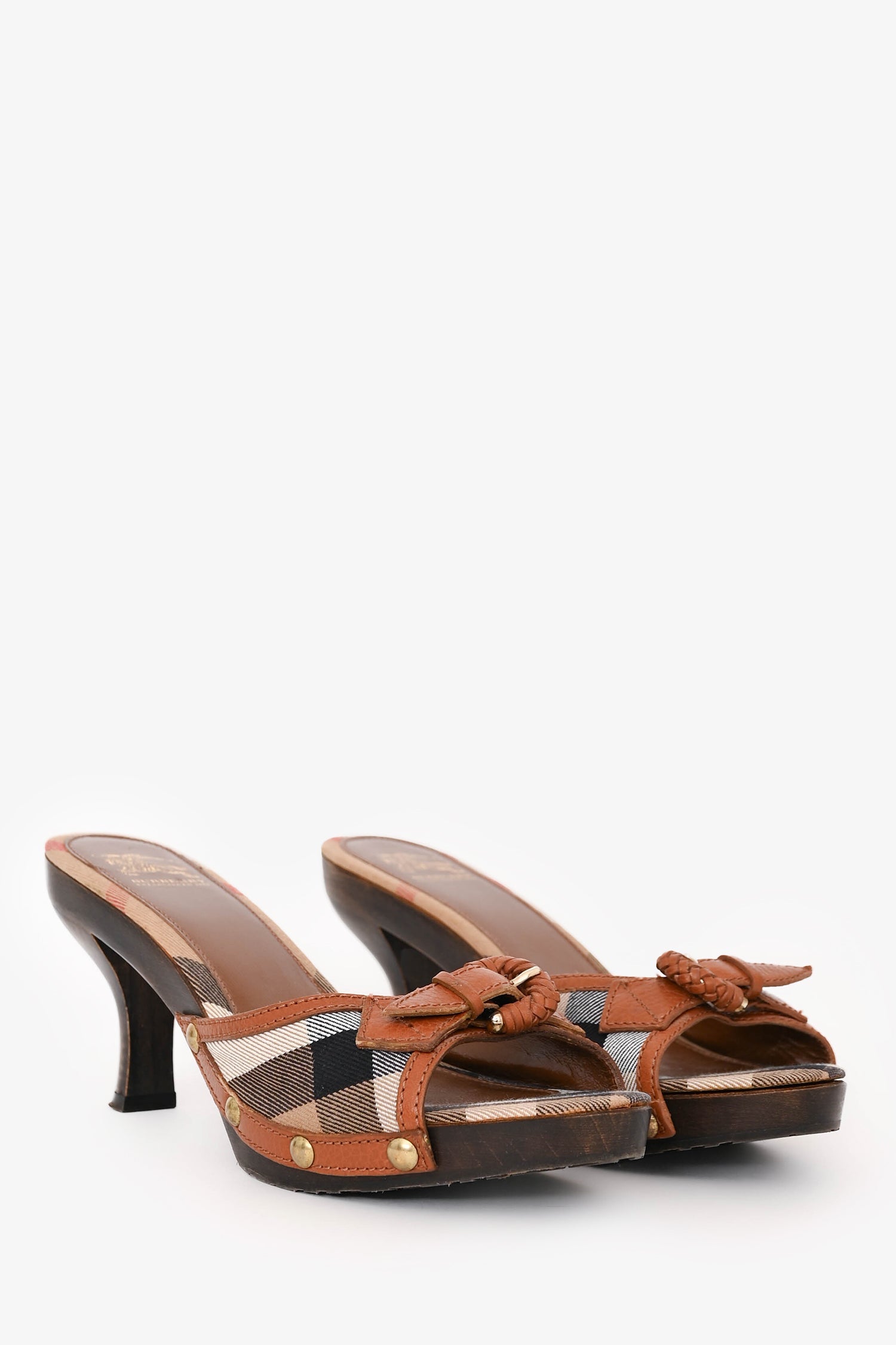Burberry Nova Check/Wooden Peep Toe Clogs. Slip-on. Gold-tone hardware. Tonal Stitching.