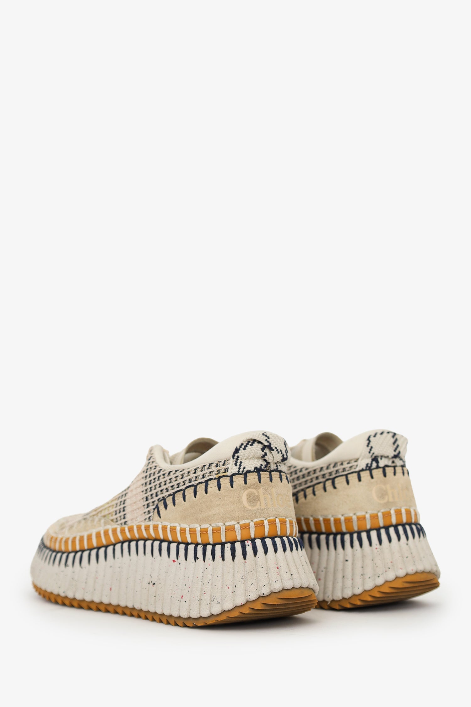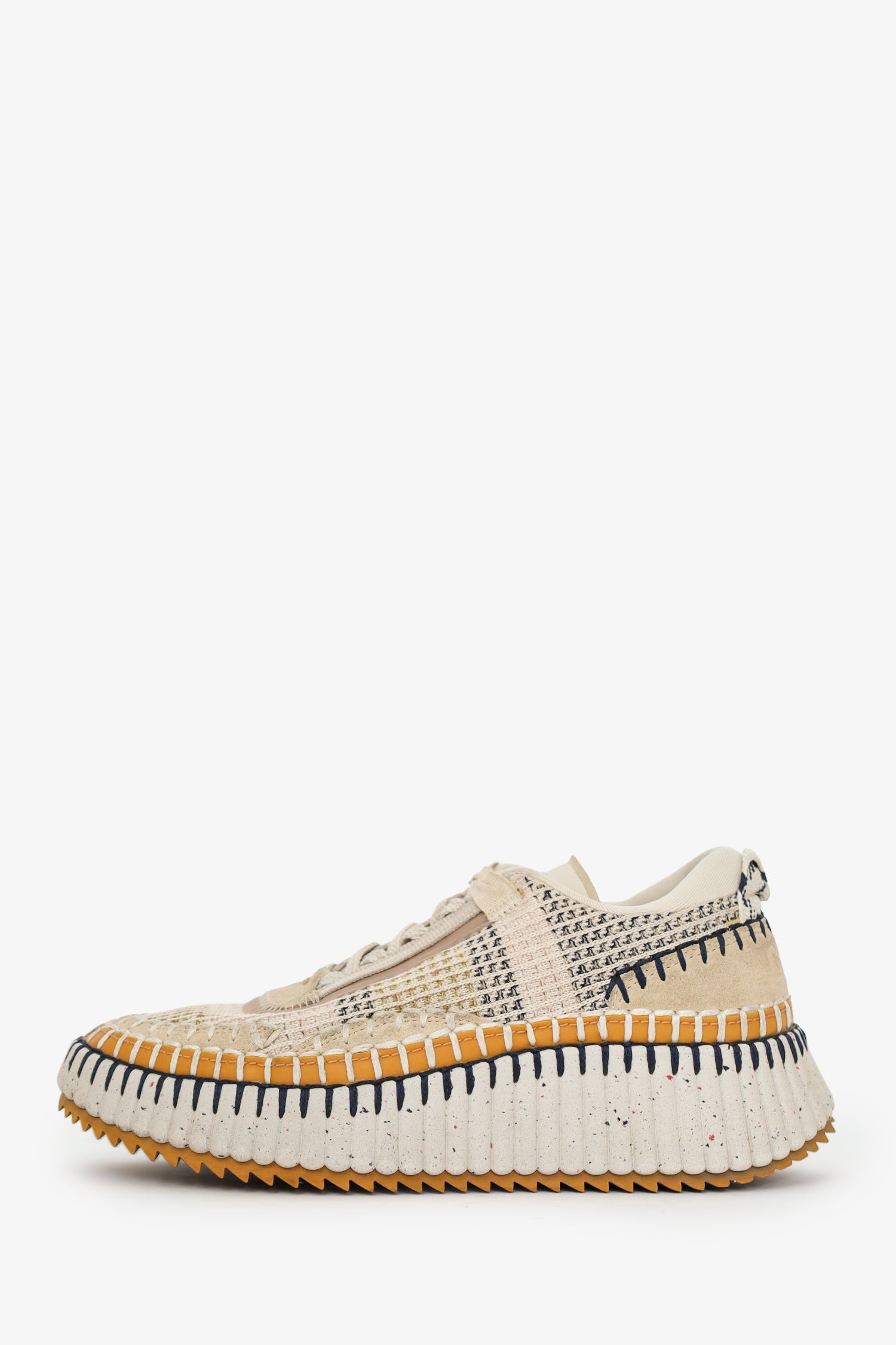 Chloe Beige Multicolour Knit 'Nama' Sneakers. Slip-on. Round toe. Front lace-up closure. Lined interior. Contrast and tonal stitching. Tonal stitching.