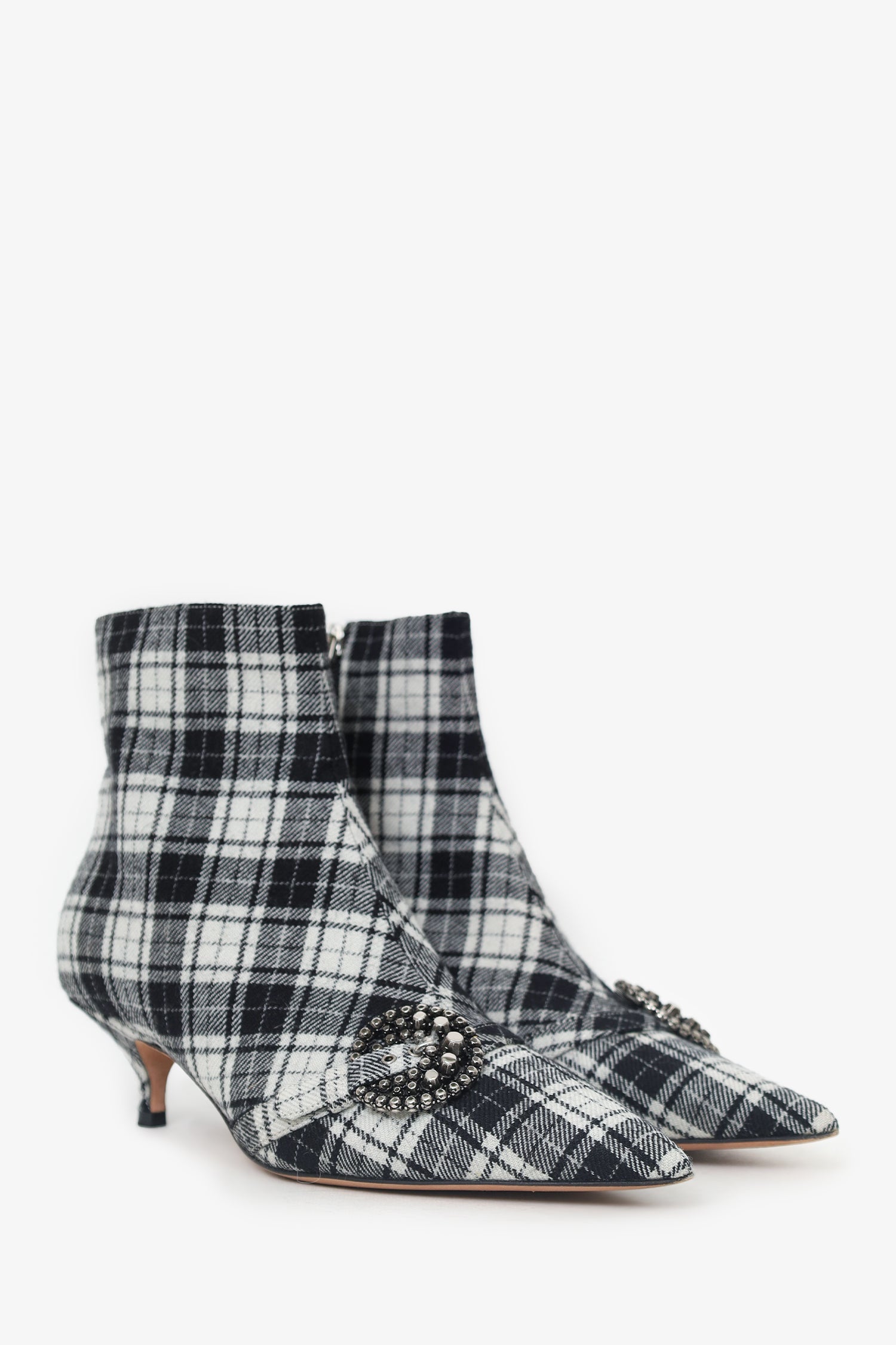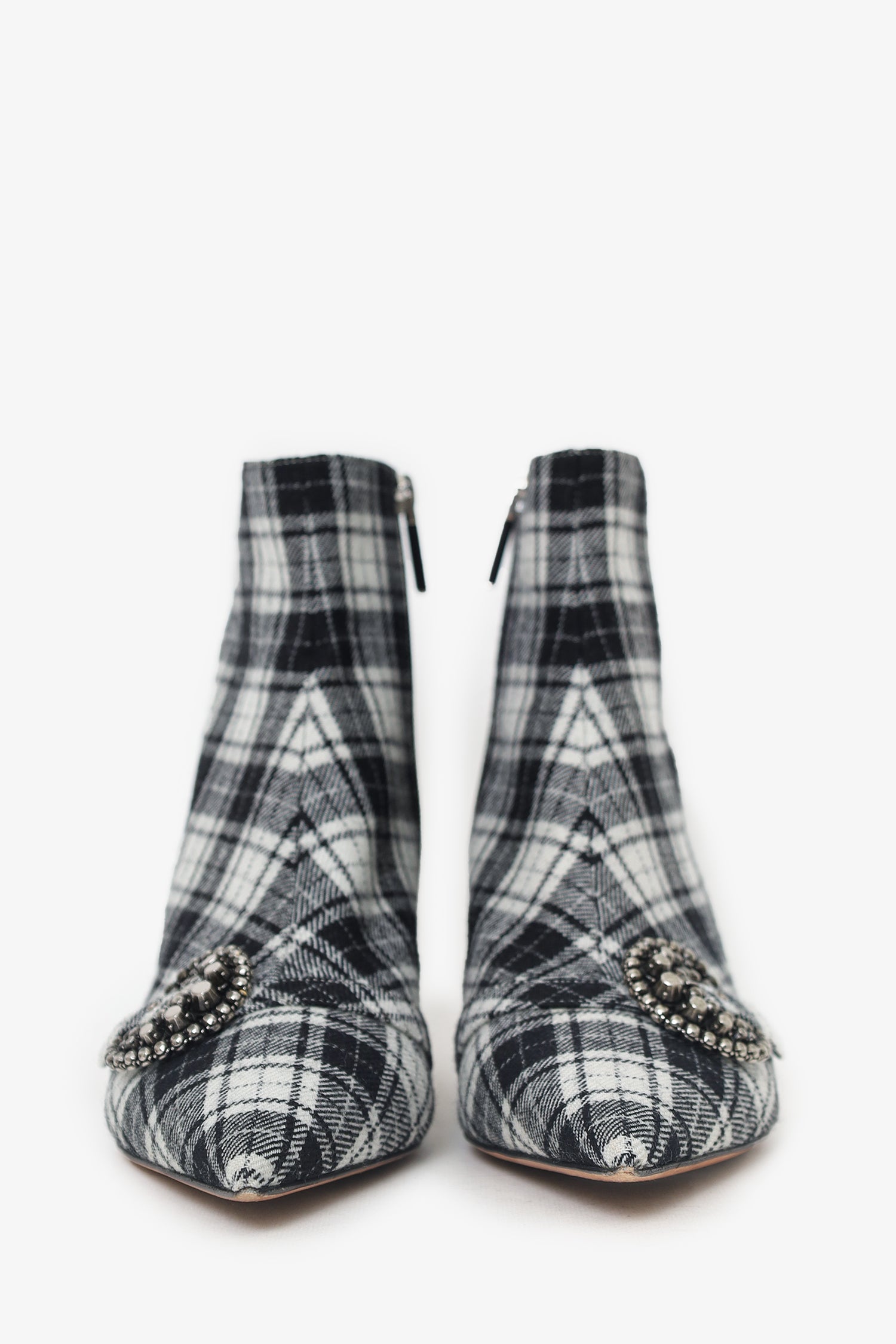 Christian Dior Black/White Plaid 'Dior Gang' Tartan Ankle Boots. Pull-on. Pointed toe. Side zip closure. Buckle embellishment on vamp. Leather lined interior. Silver-tone hardware. Tonal stitching.