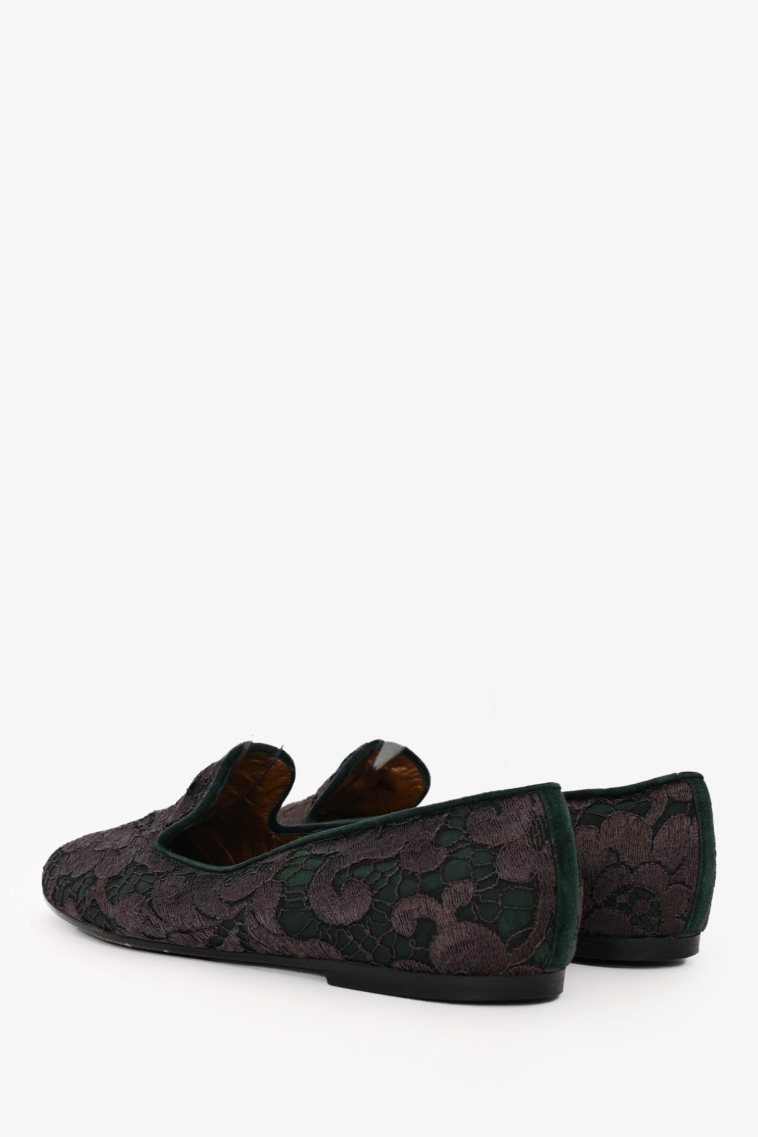 Diego Della Valle Green/Grey Lace Flats. Slip-on. Almond toe. Metallic interior. Tonal stitching.