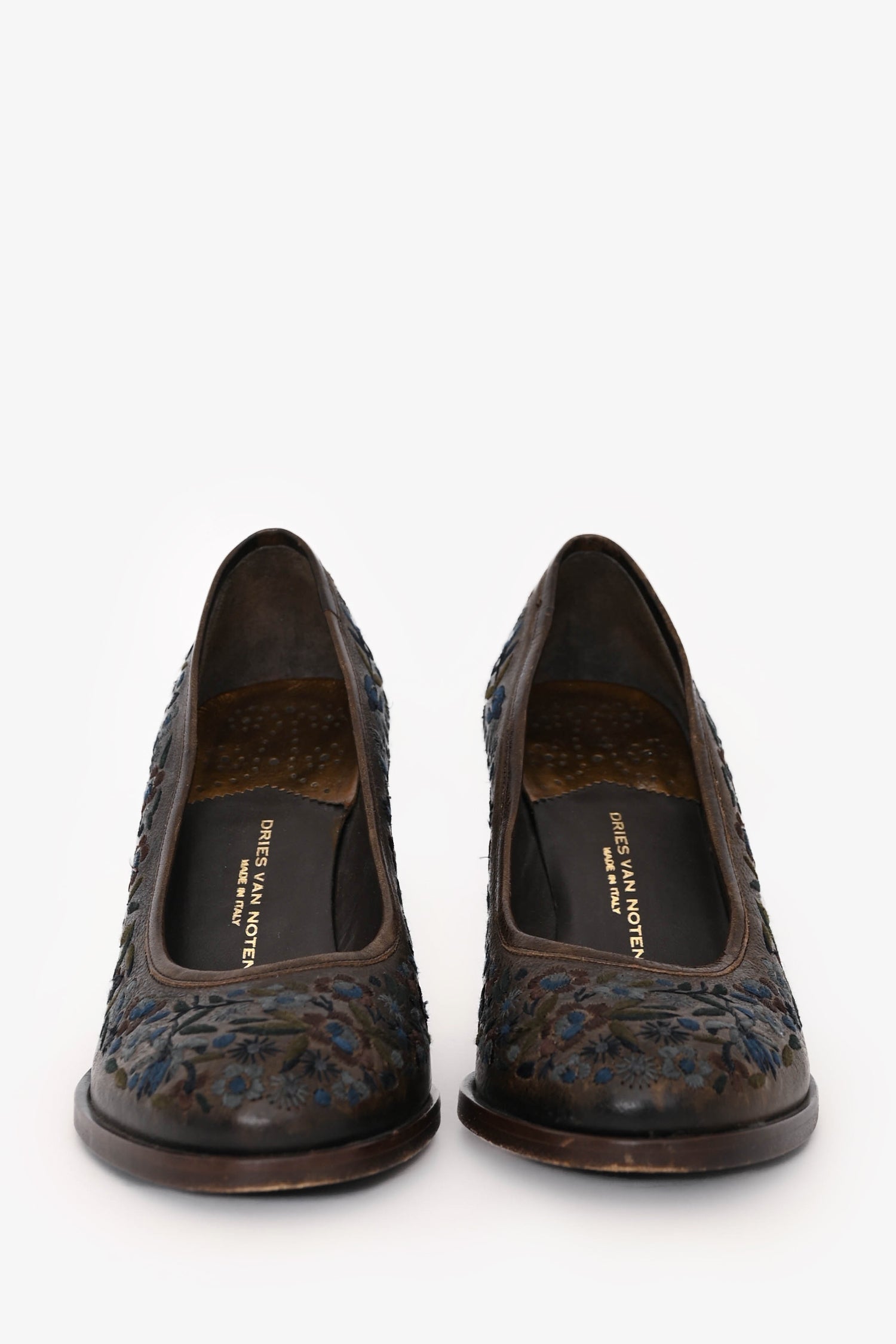 Dries Van Noten Brown Leather Embroidered Pumps. Slip-on. Round-toe. Leather insole. Tonal stitching.
