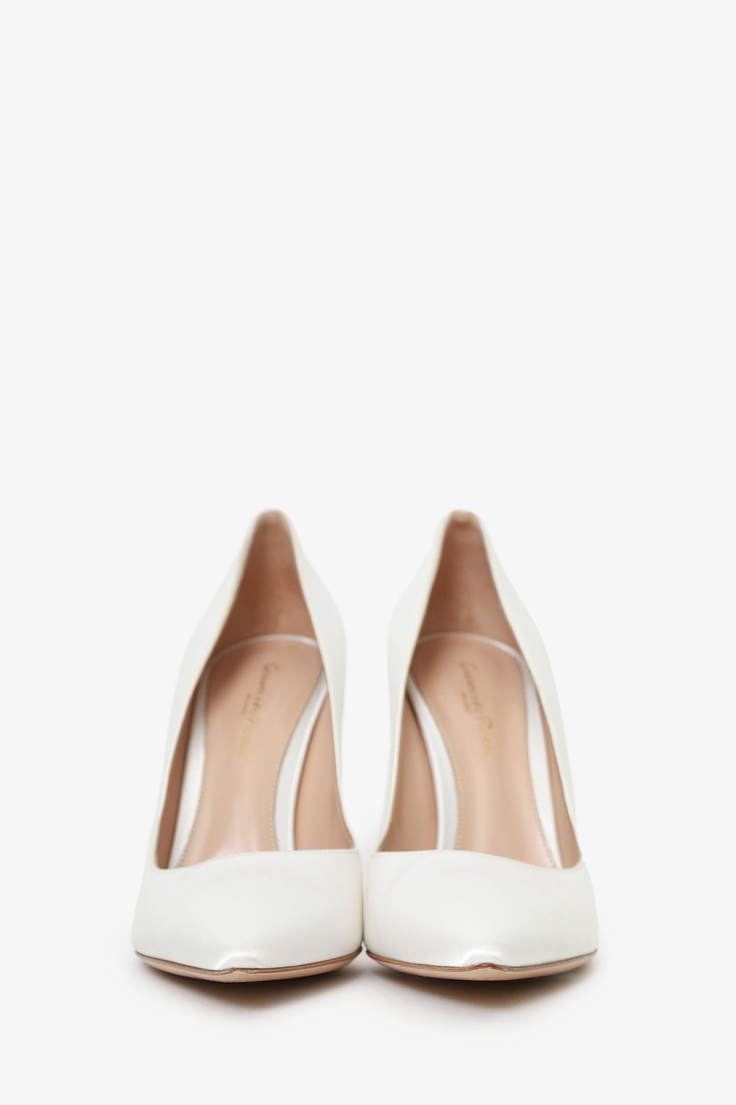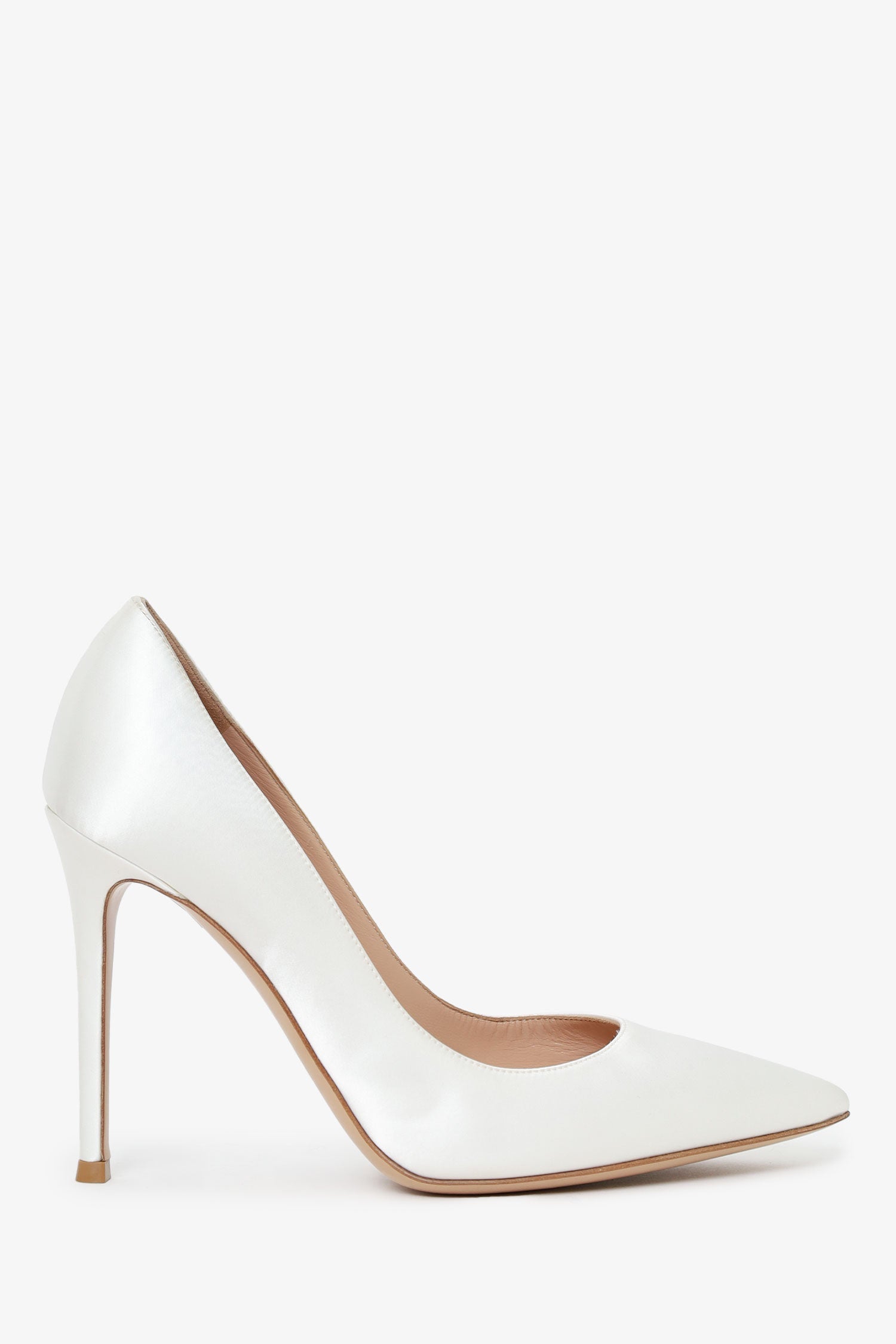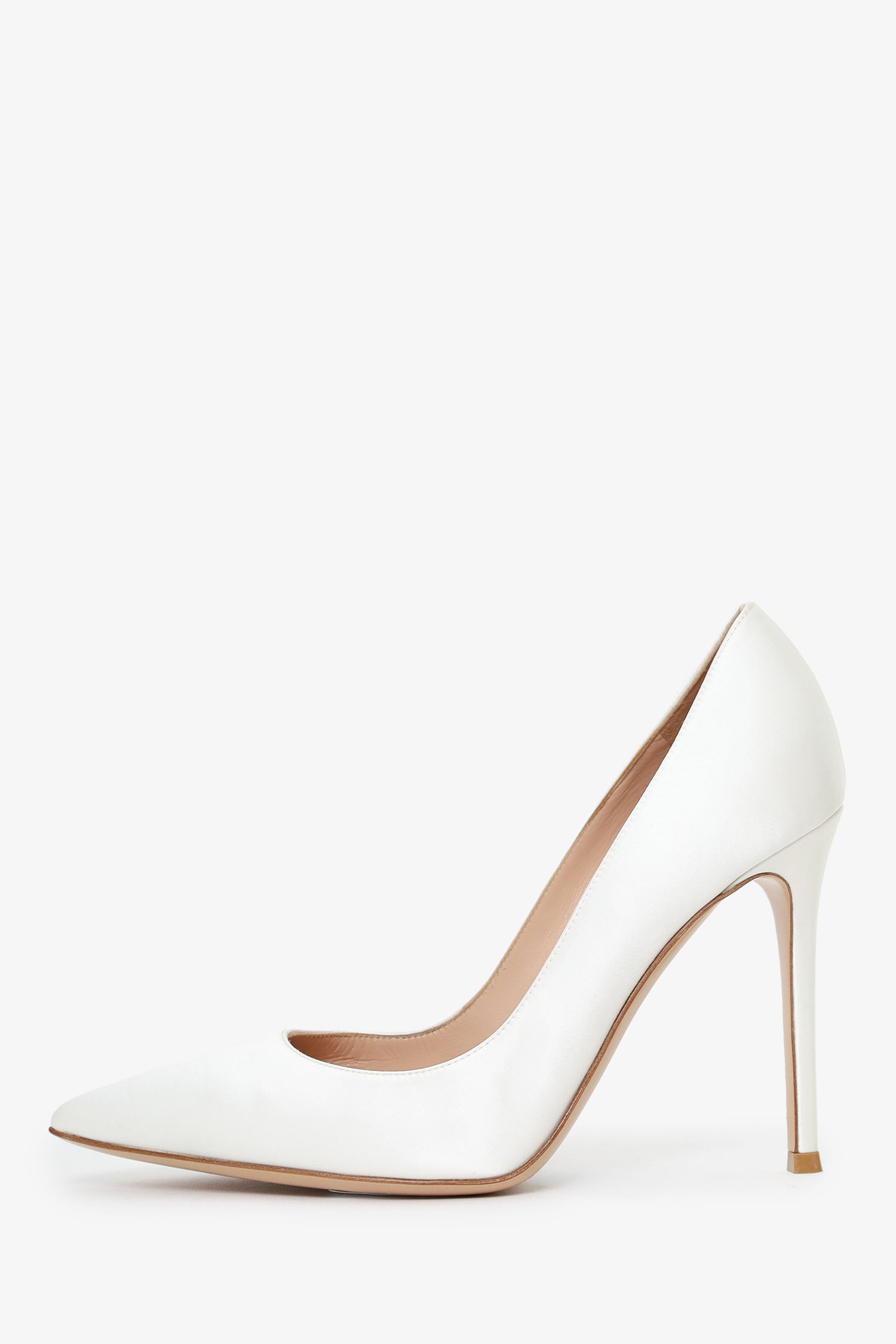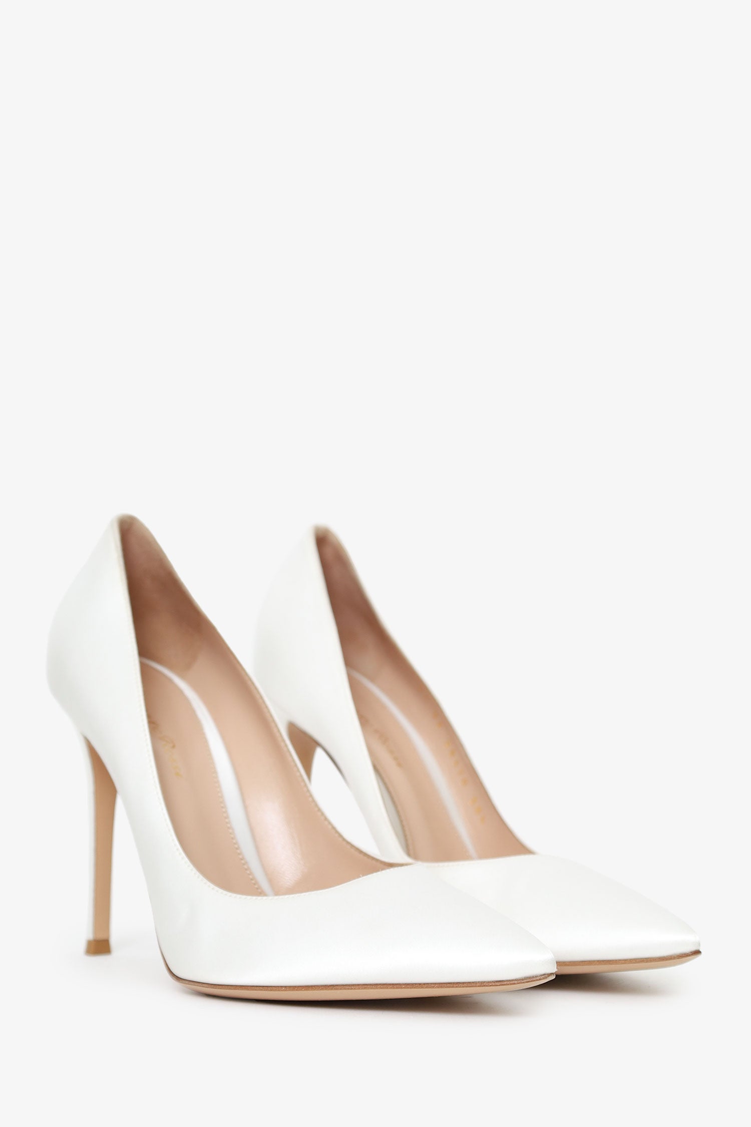 Gianvito Rossi White Satin Pointed Toe Heels. Pointed-toe. Leather-lined interior. Tonal stitching.