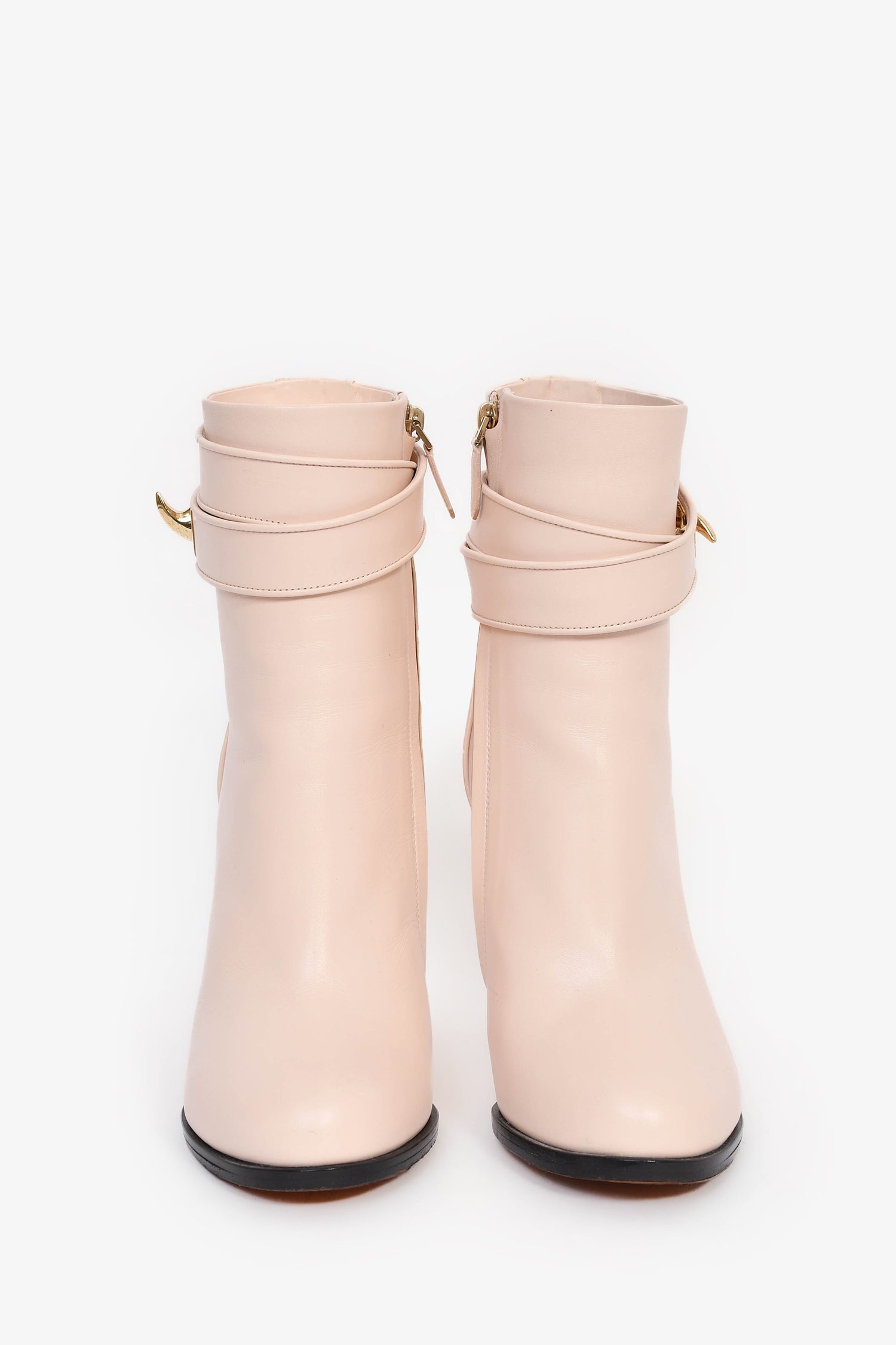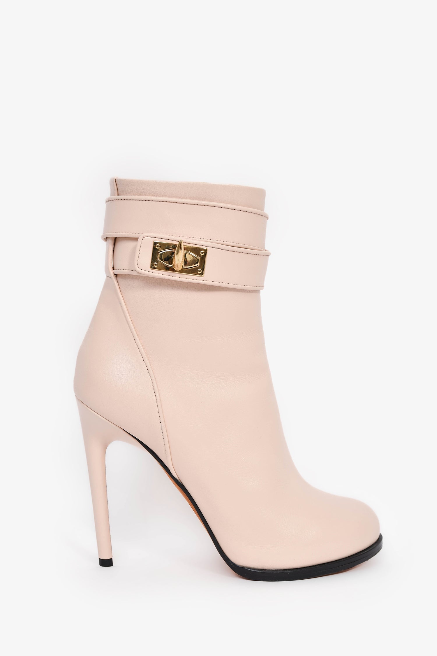 Givenchy Blush Pink Heeled Ankle 'Shark' Boots. Pull-on. Round toe. Side zip and flip-lock closure. Gold-tone hardware. Tonal stitching.