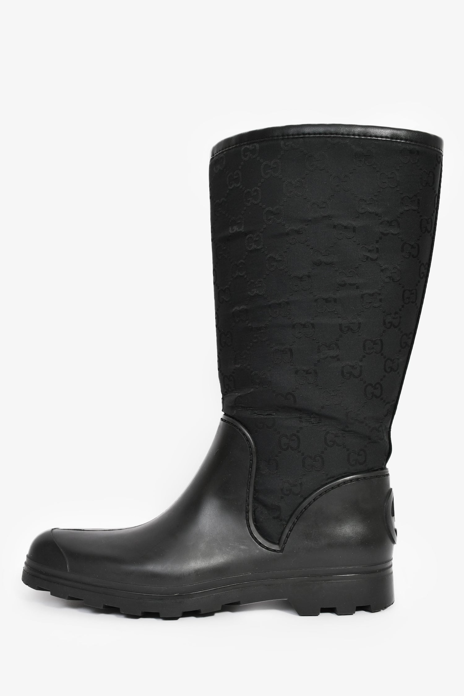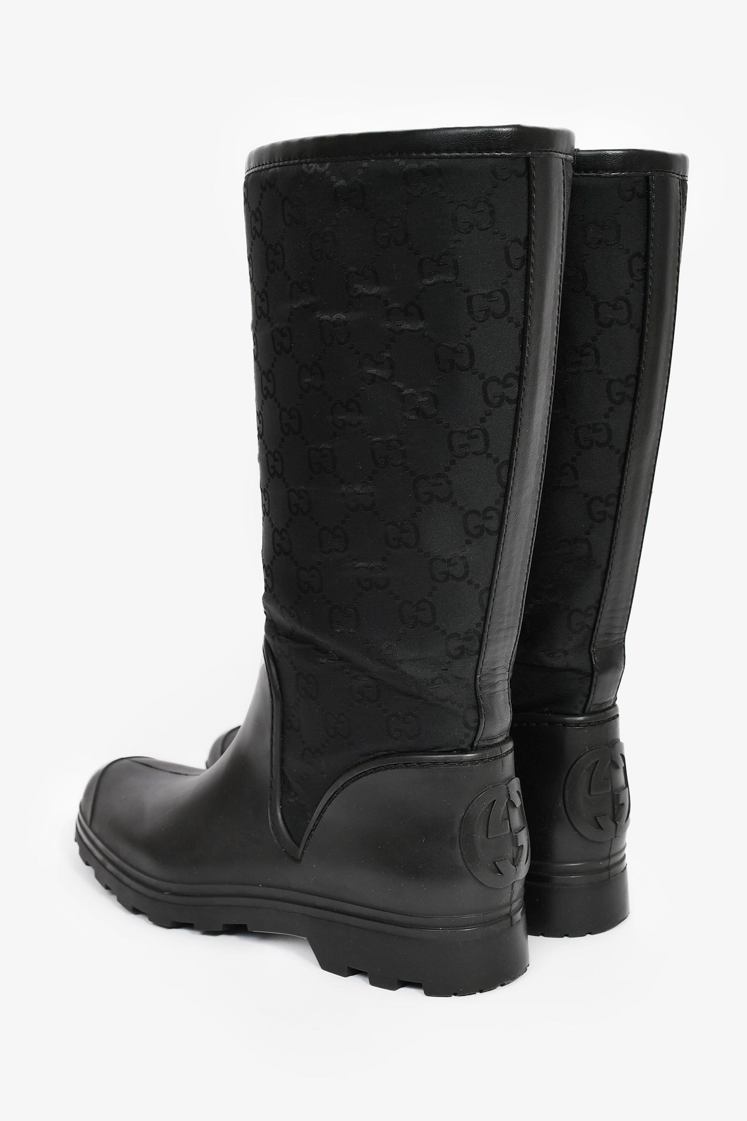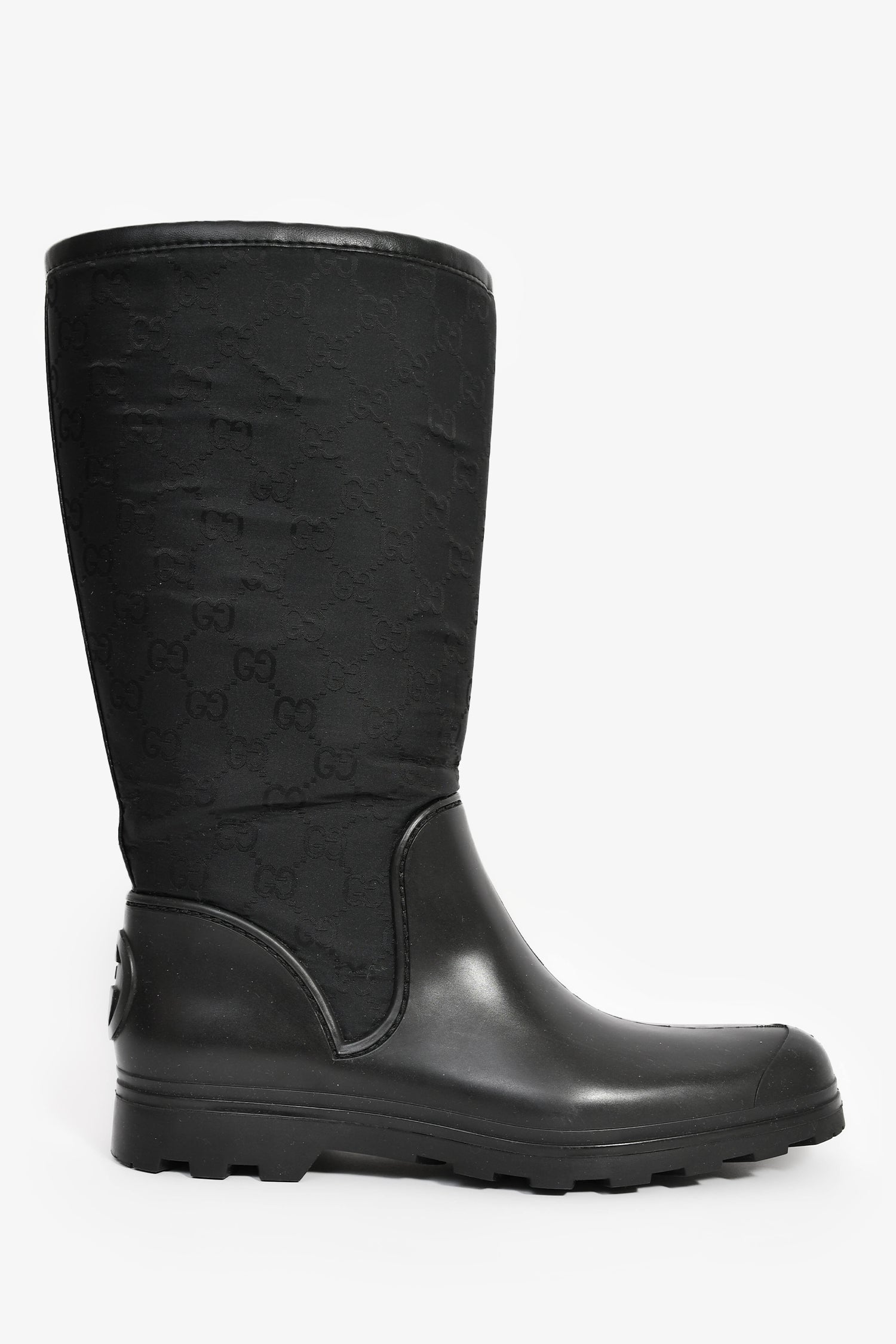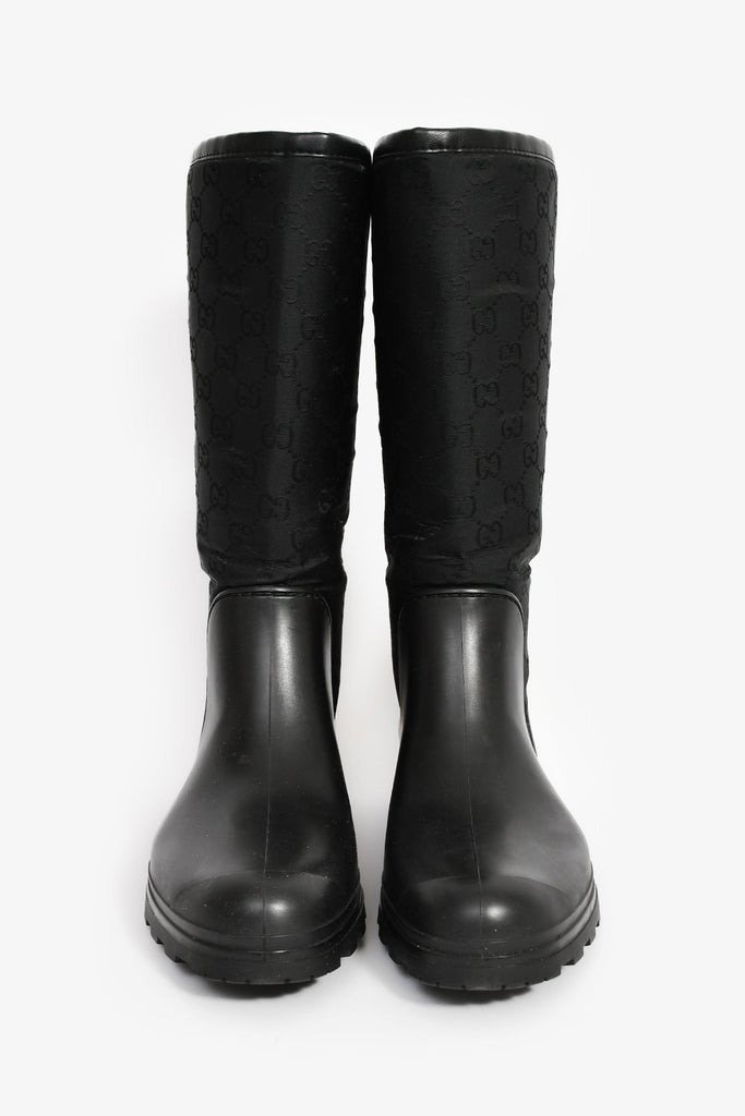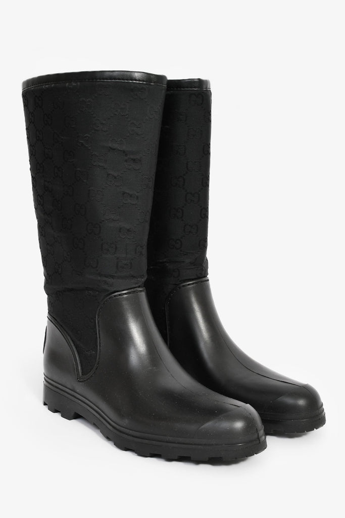Gucci Black GG Supreme Rubber/Canvas Rain Boots. Pull-on. Round toe. Tonal stitching.