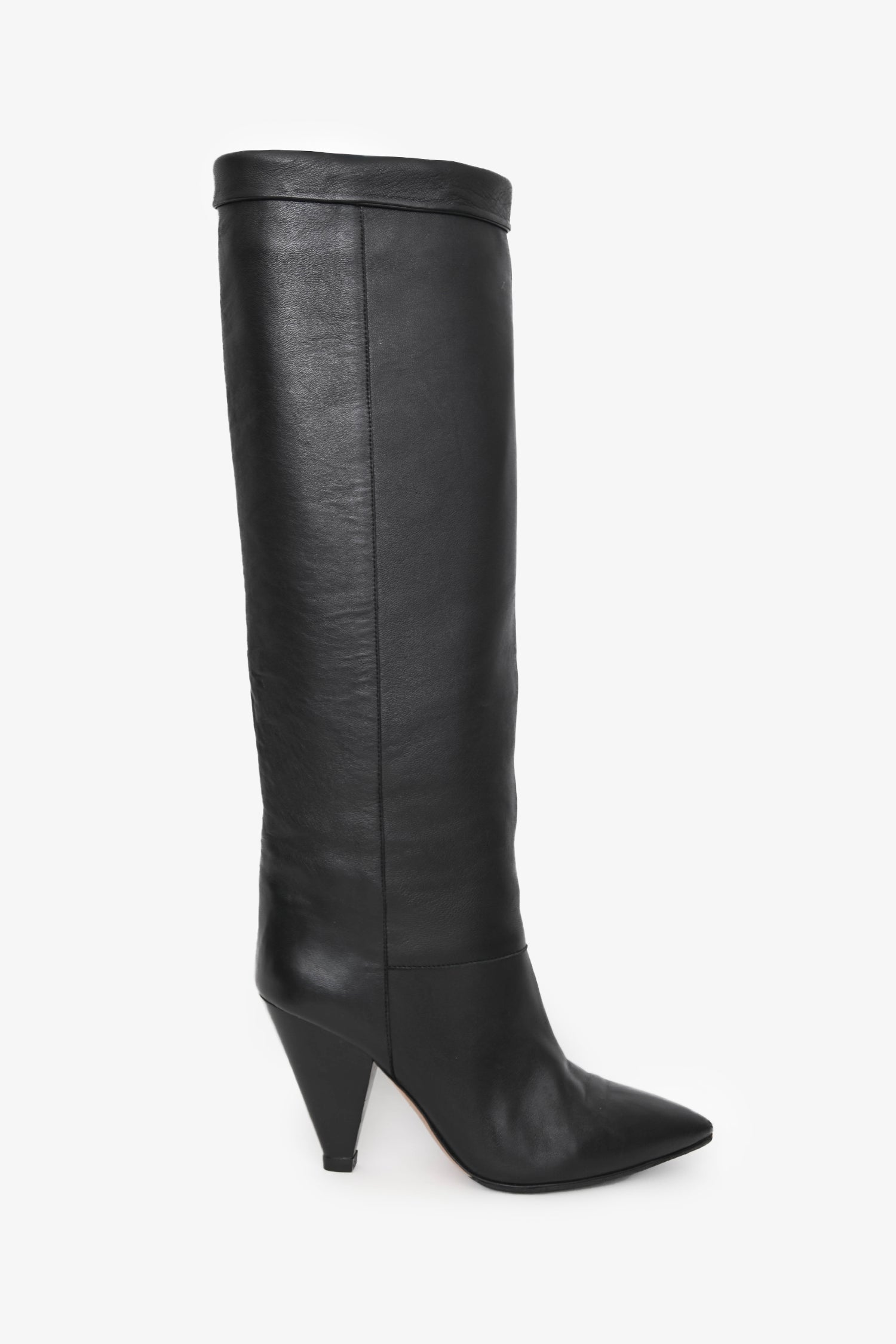 Isabel Marant Black Leather Conic Heel Tall Boots. Pointed toe. Leather insoles. Tonal stitching.