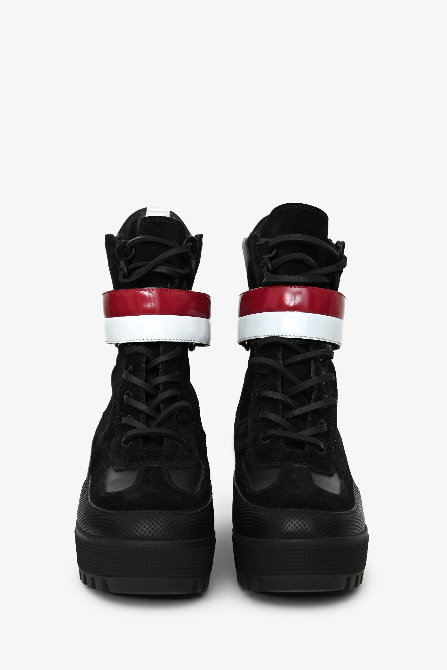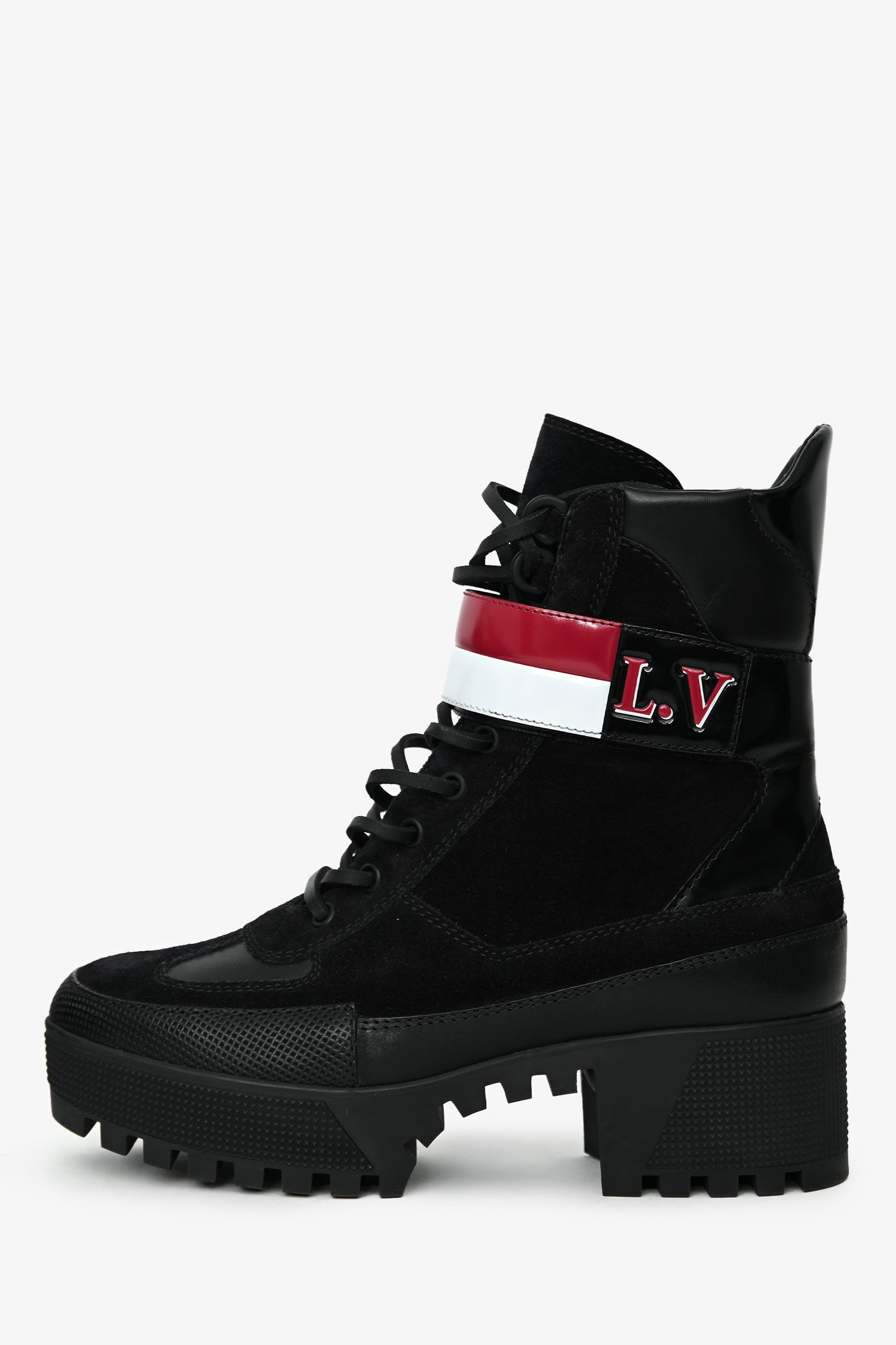 Louis Vuitton Black Suede Striped Combat 'Laureate' Boots.Pull-on. Round toe. Lace-front closure. Rubber soles. Gold-tone hardware. Tonal stitching.