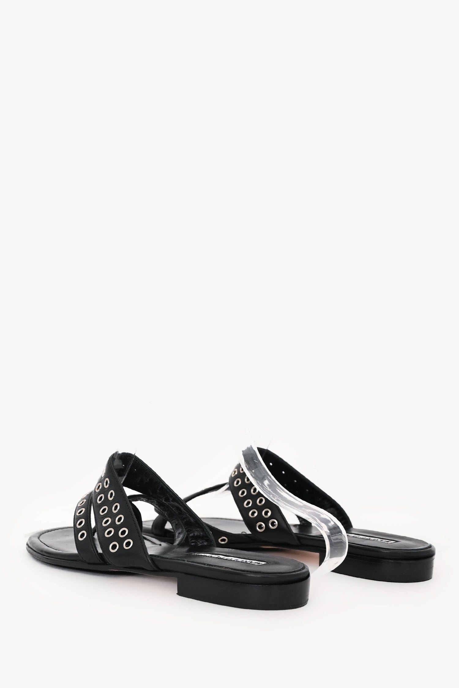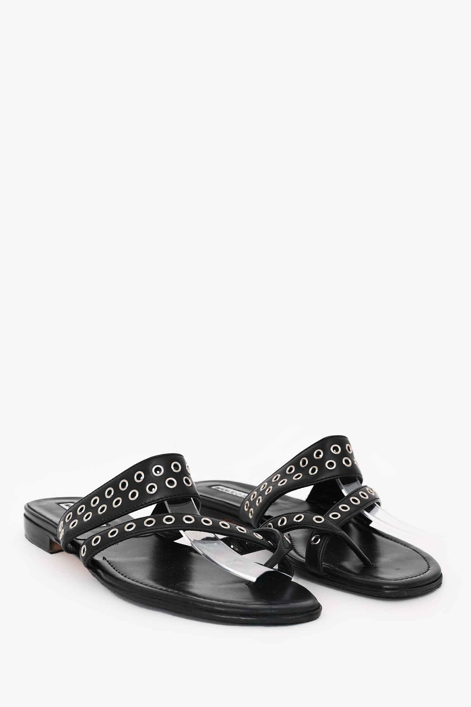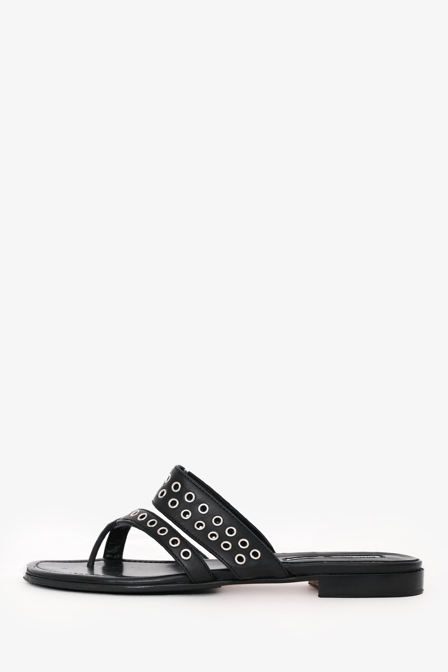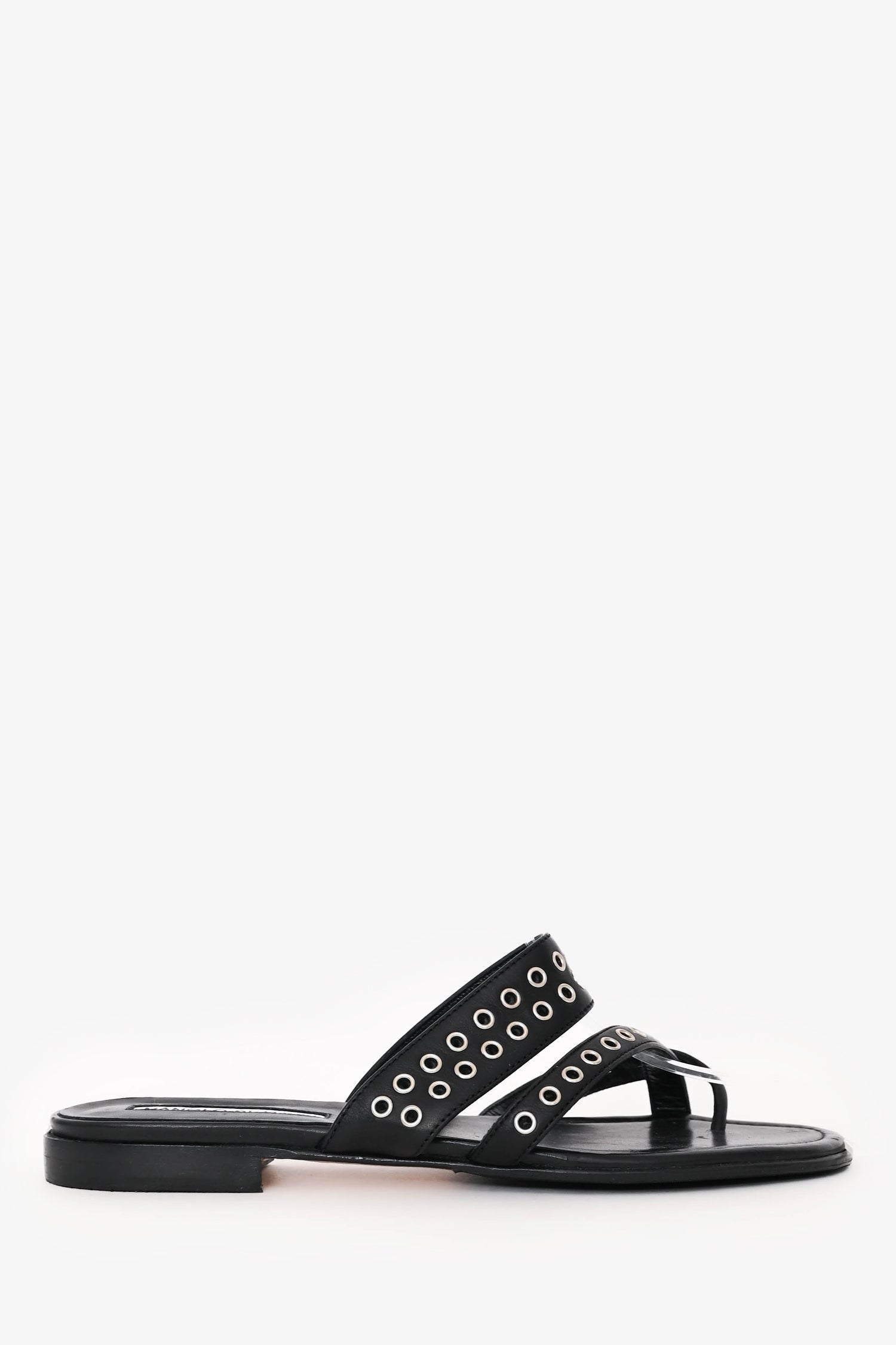 Manolo Blahnik Black Leather Gromet Flats. Slip-on. Dual straps accented with silver-tone grommet detailing. Open toe. Tonal stitching.