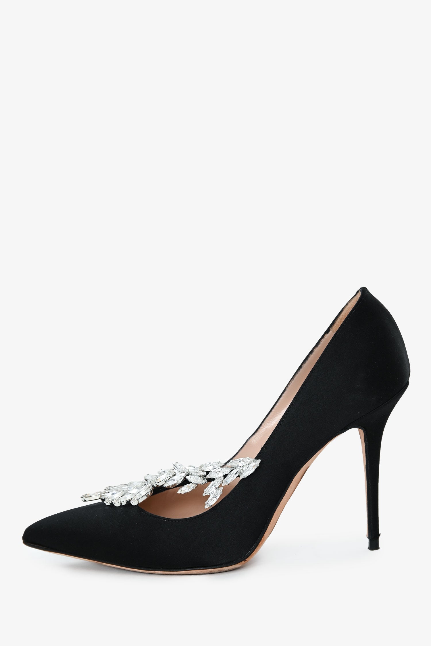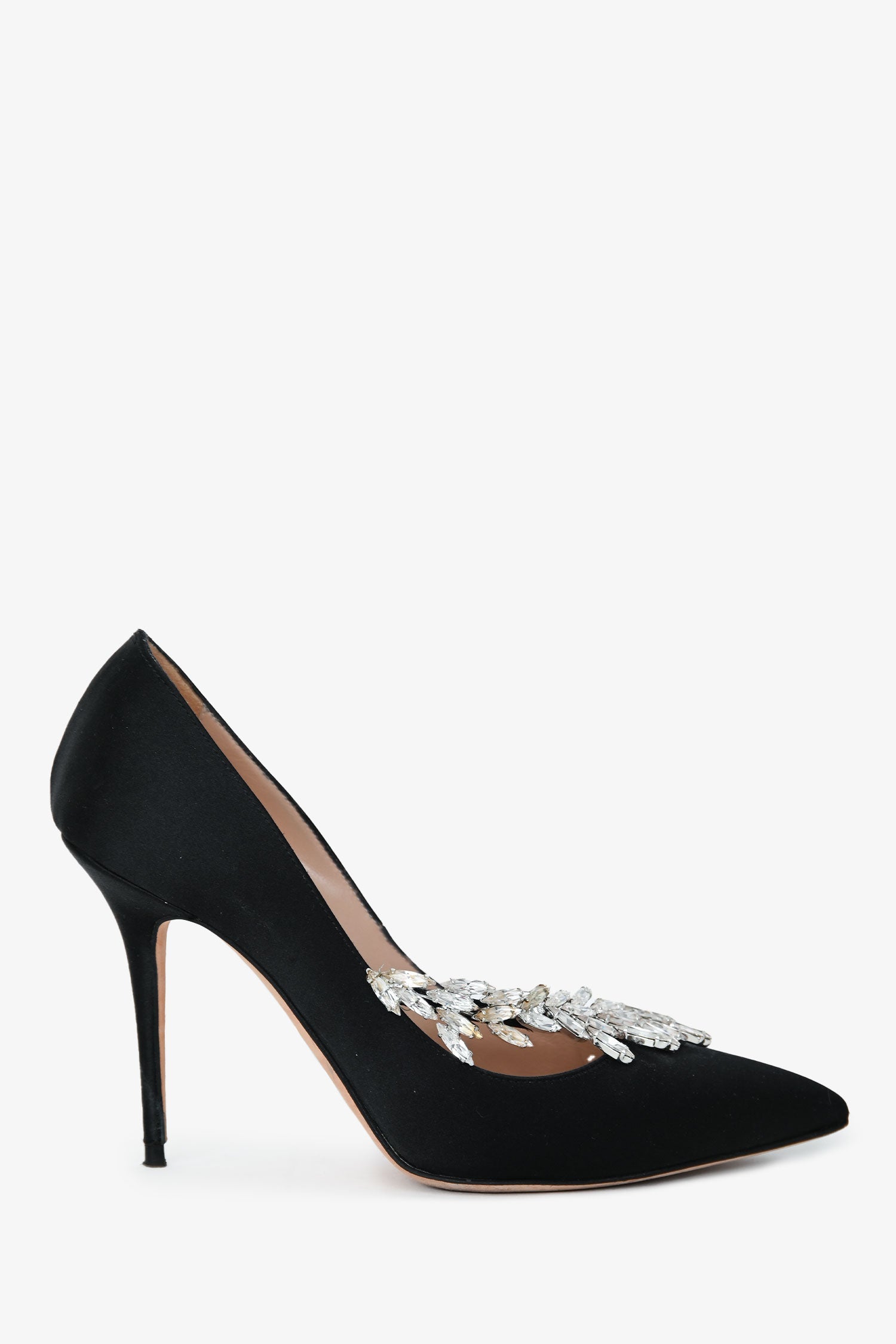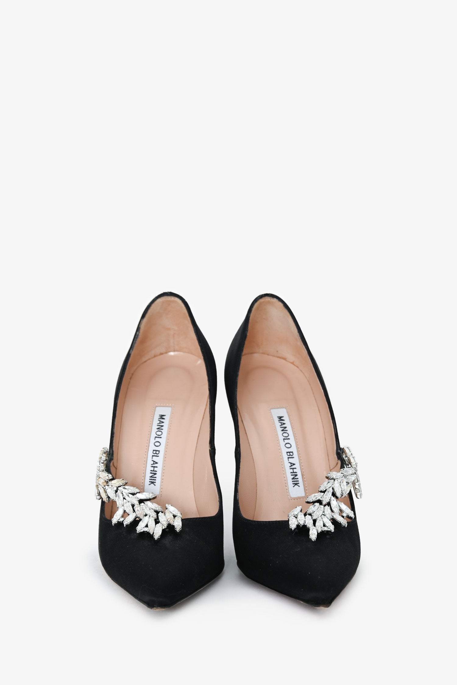 Manolo Blahnik Black Satin Crystal Embellished Heels. Pointed toes. Leather insoles. Silver-tone hardware. Tonal stitching.