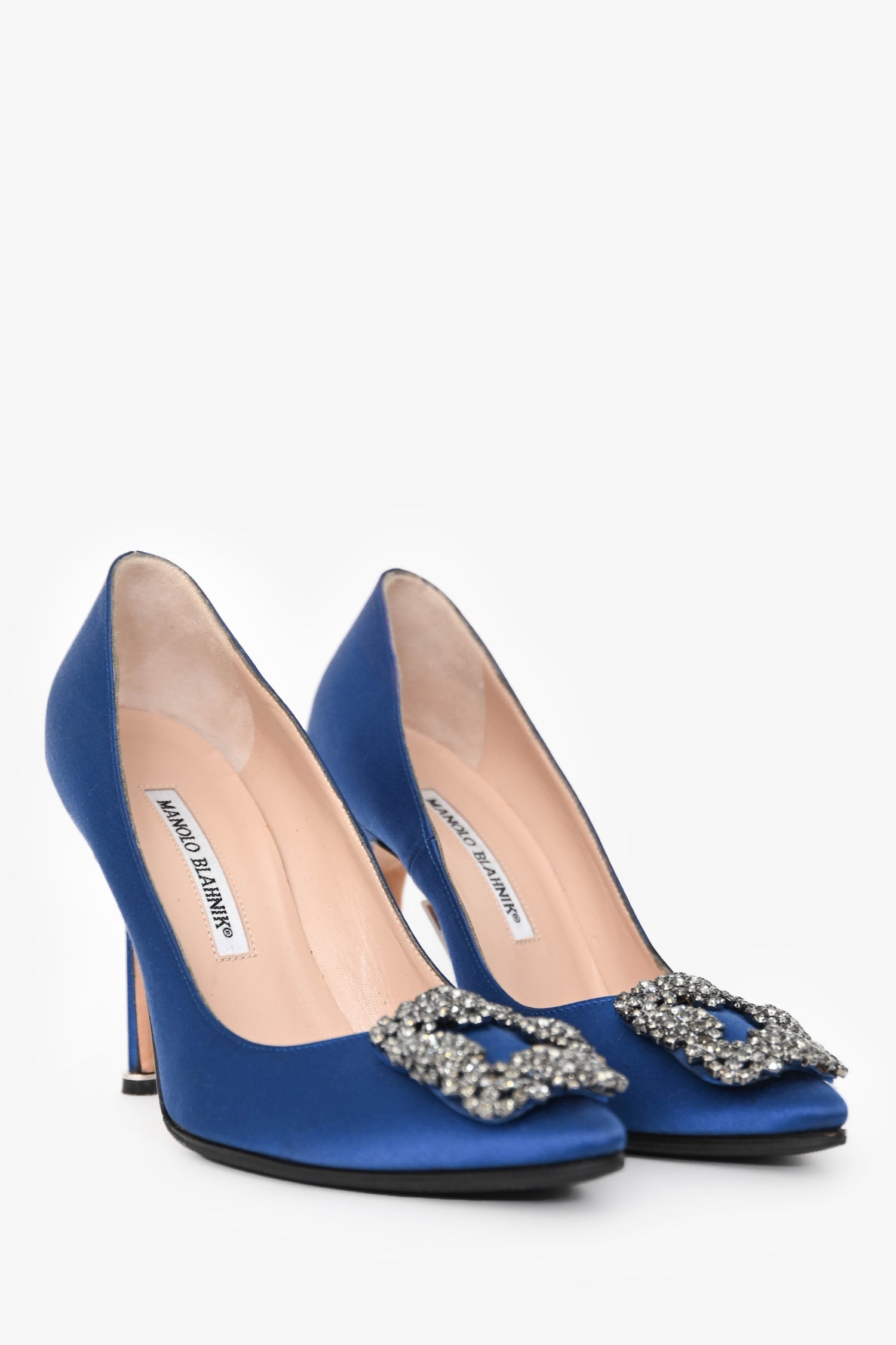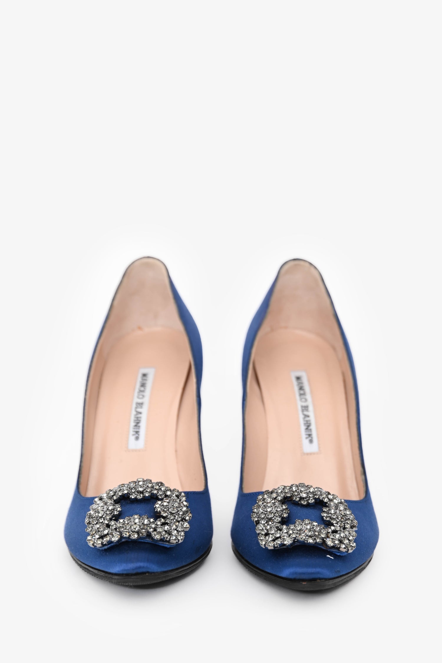 Manolo Blahnik Blue Satin Crystal Embellished Hangisi Heels Size 36.5