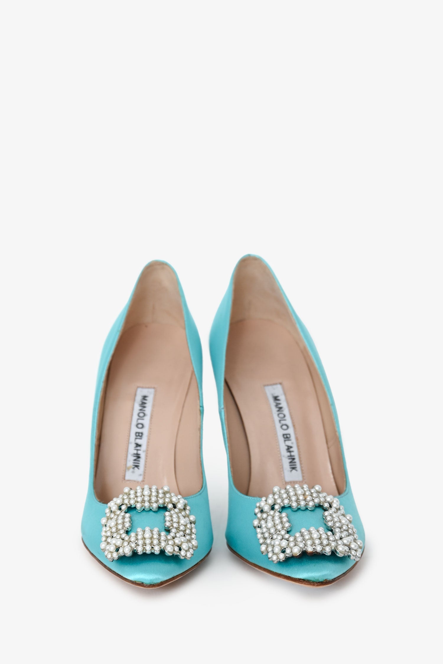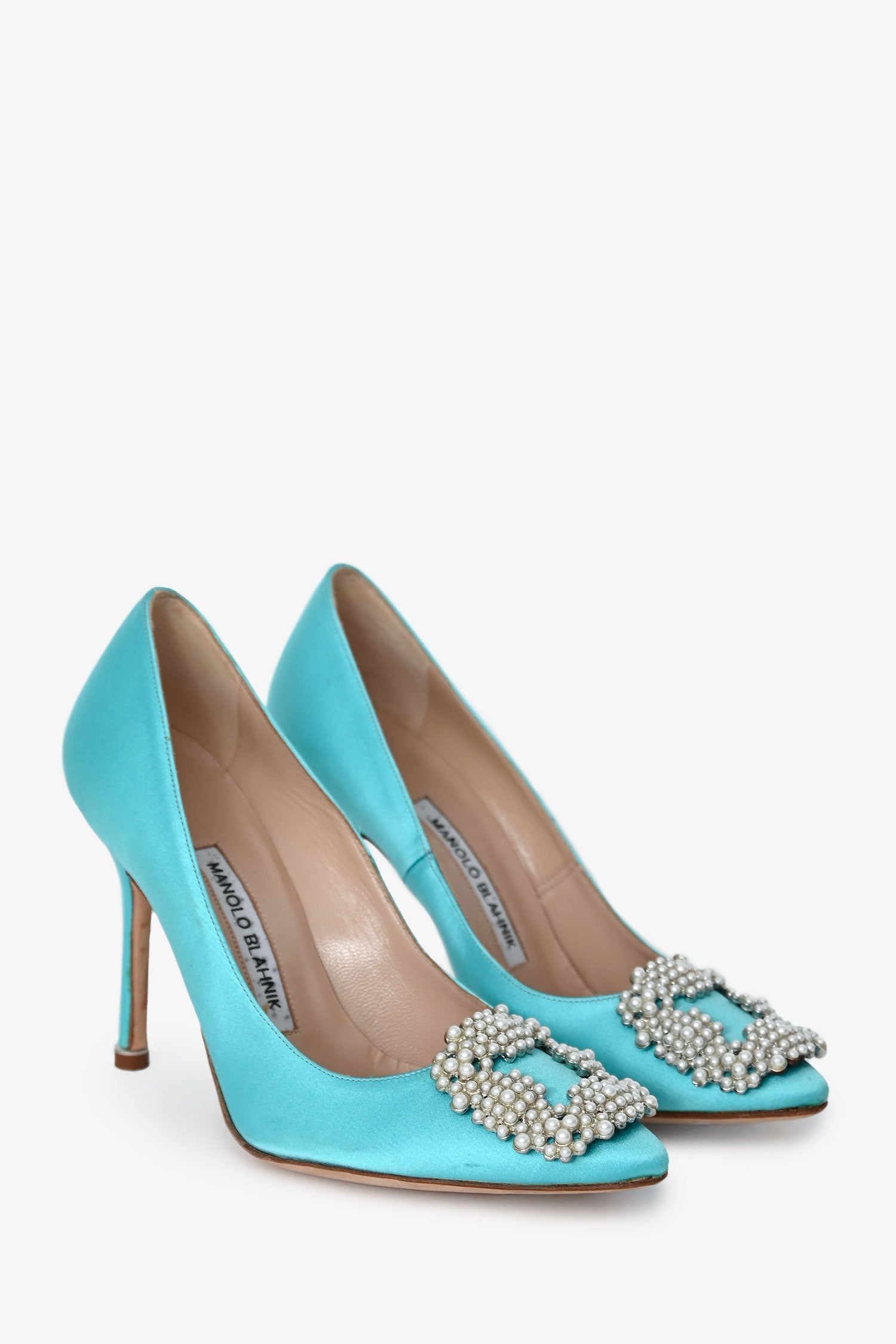 Manolo Blahnik Blue Satin Faux Pearl Hangisi Heels. Pointed toes. Leather insoles. Faux pearls and gold-tone hardware. Tonal stitching.