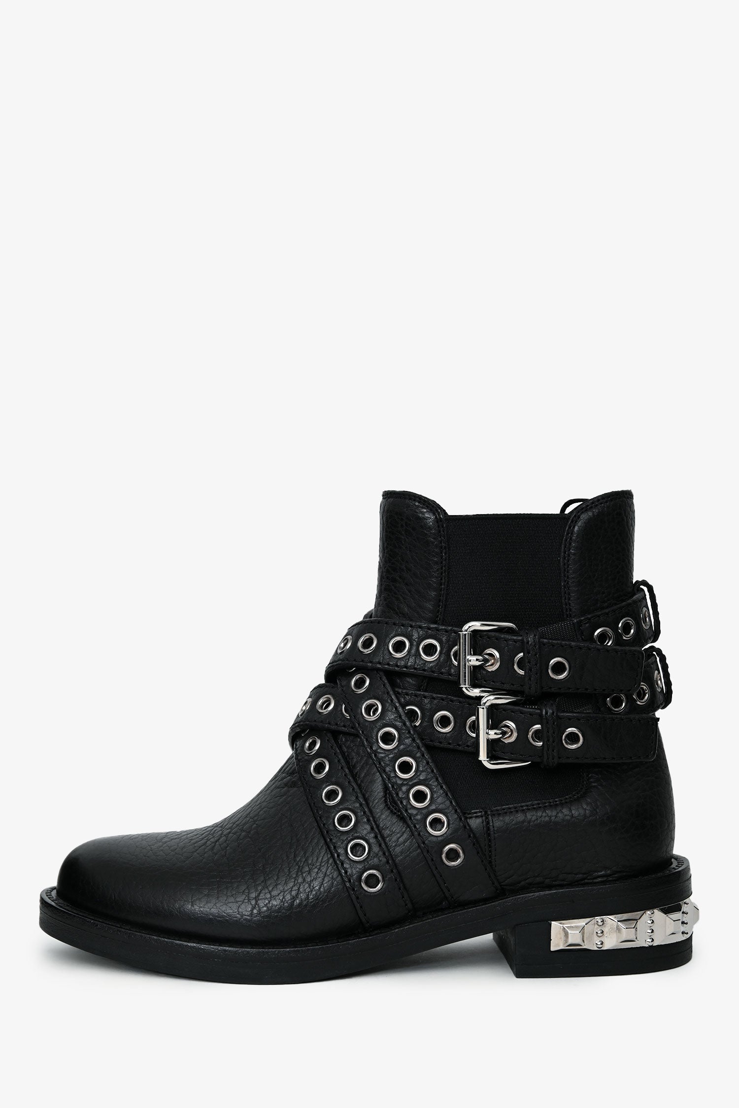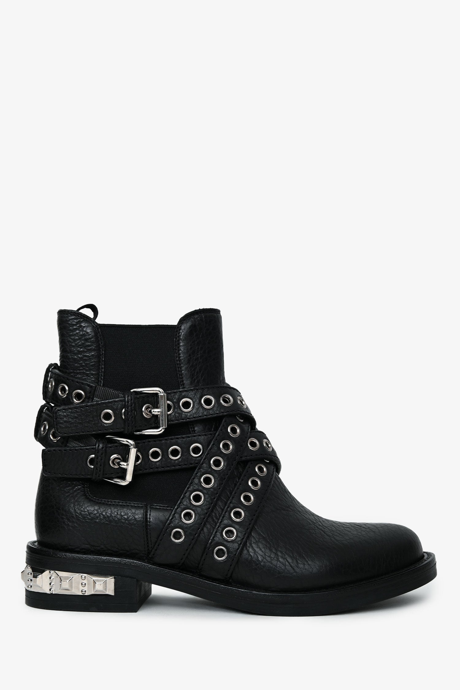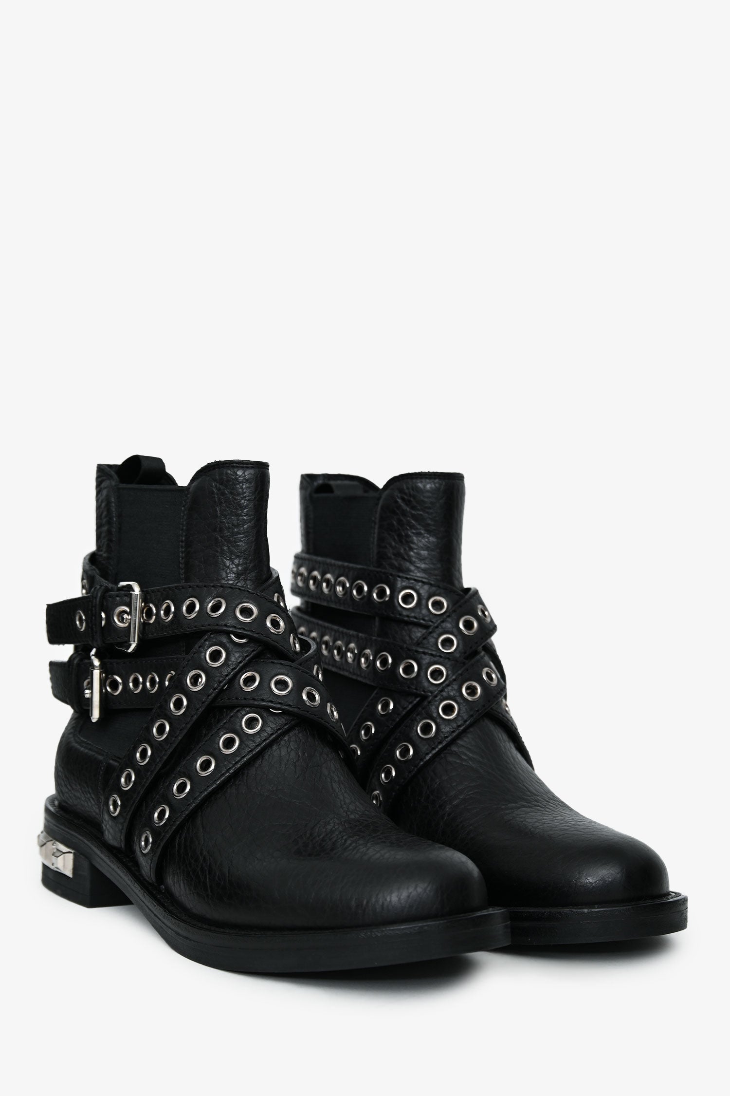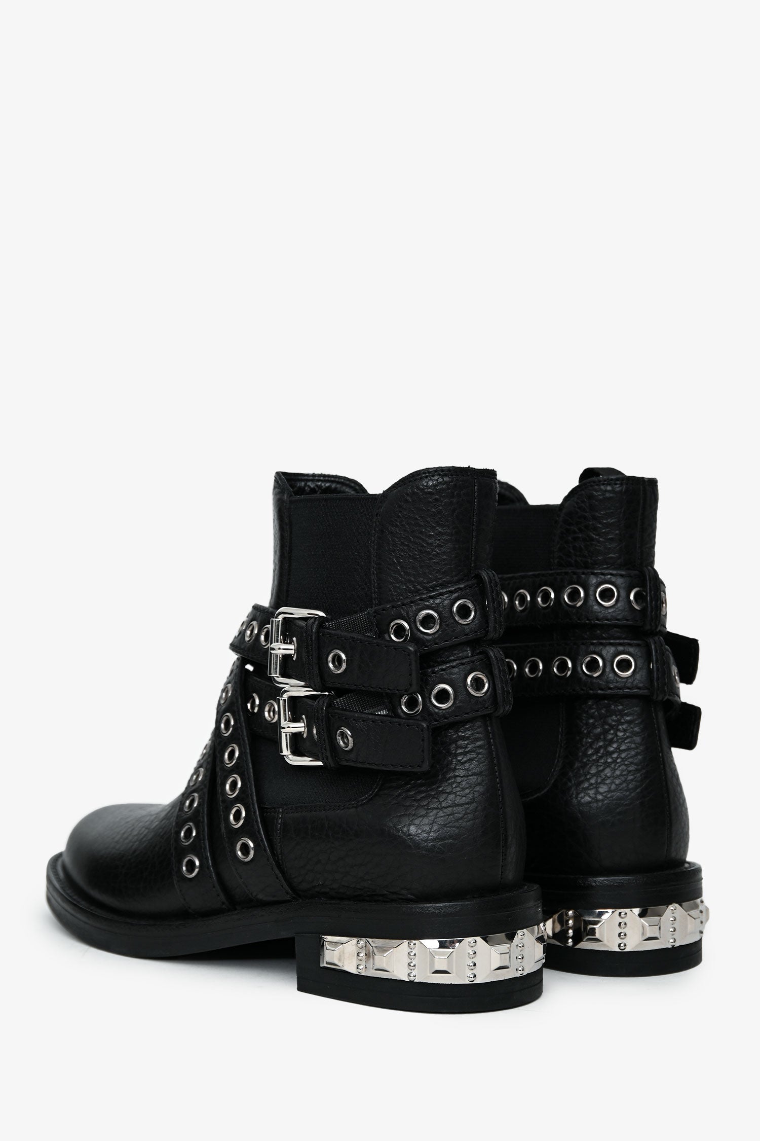 Miu Miu Black Grained Leather Eyelet Buckled Ankle Boots. Adjustable double buckle detail. Round toe. Leather insole. Elasticized side detailing. Stud detailing on the heel. Silver-tone hardware. Tonal stitching.