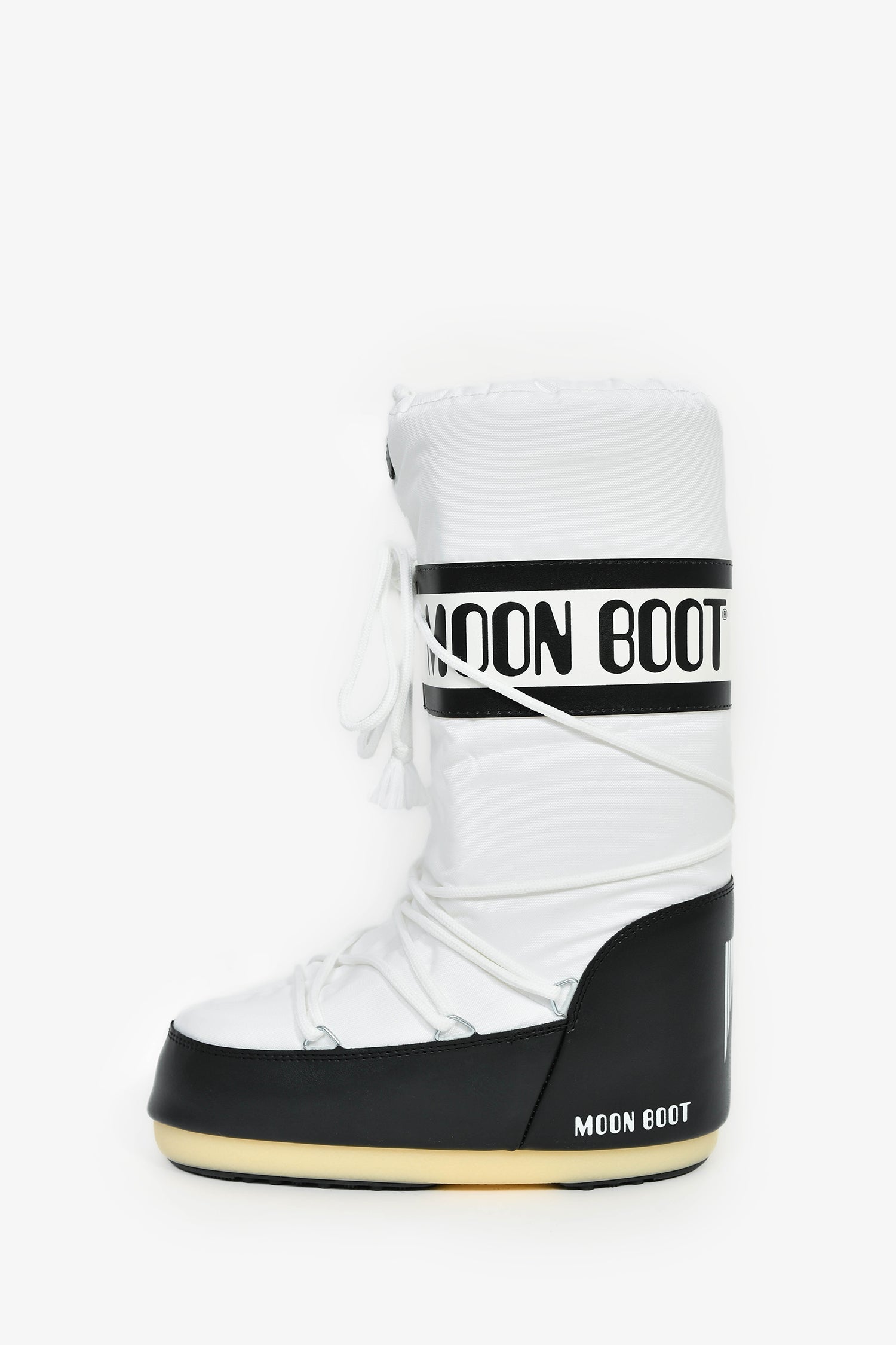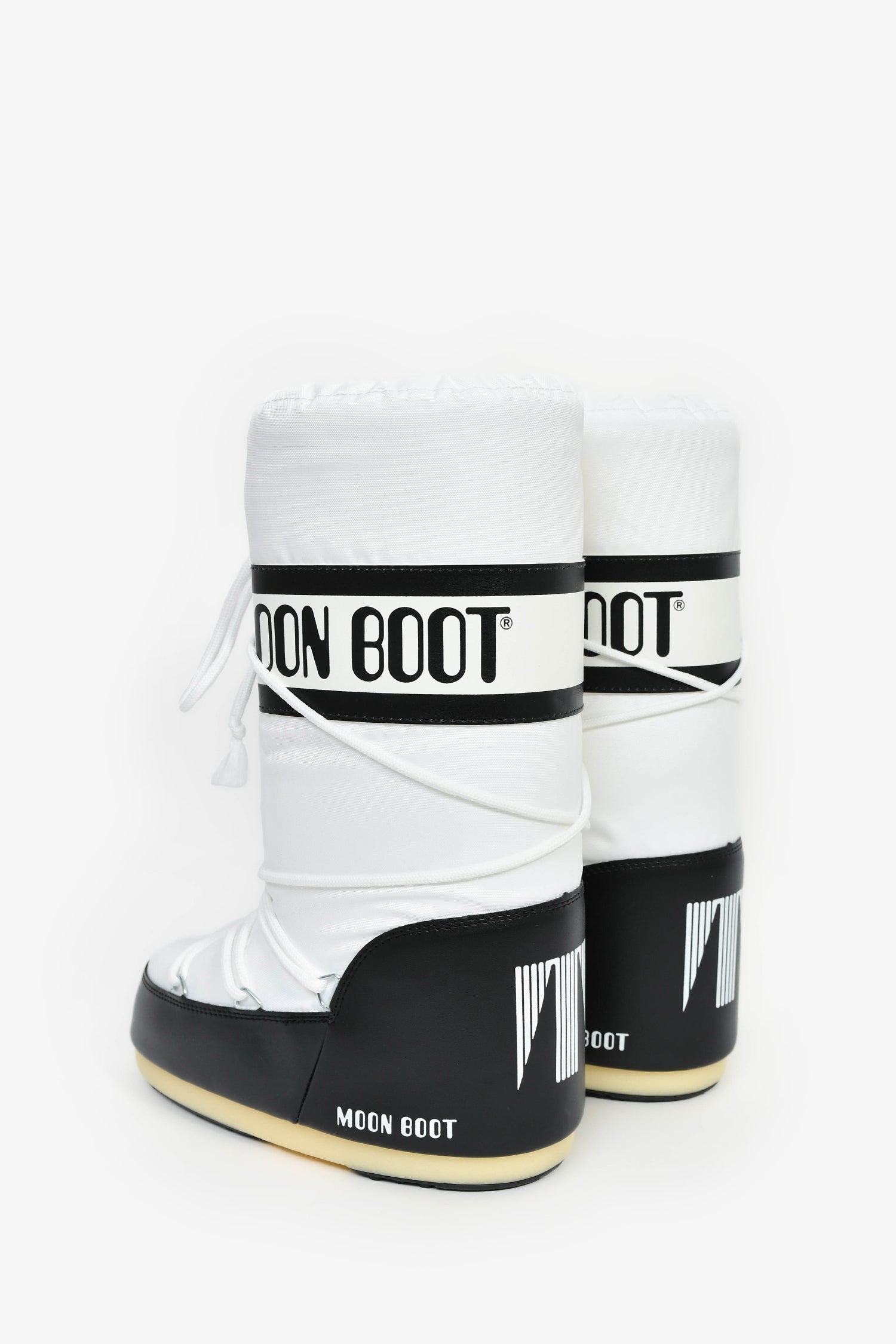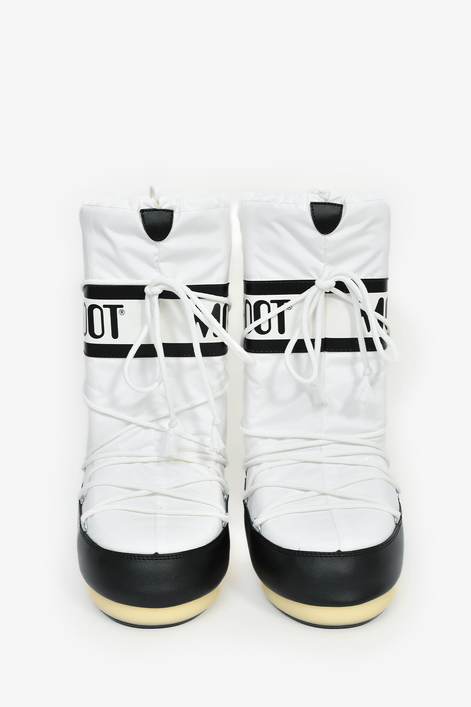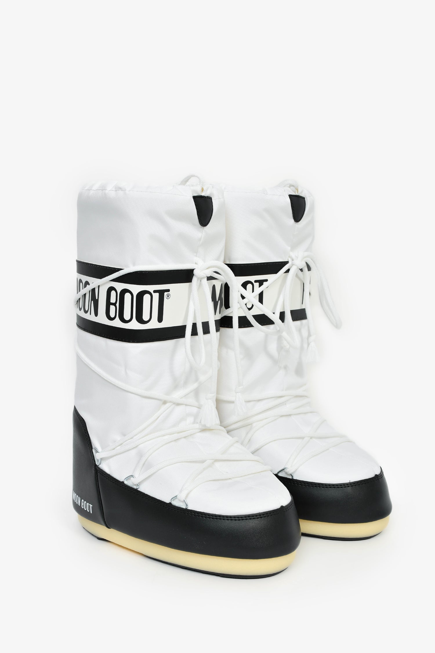 Moon Boot White Nylon Logo Tie Up Boots. Round toe. Front wrap-around lace-up closure. Silver-tone hardware. Tonal stitching.