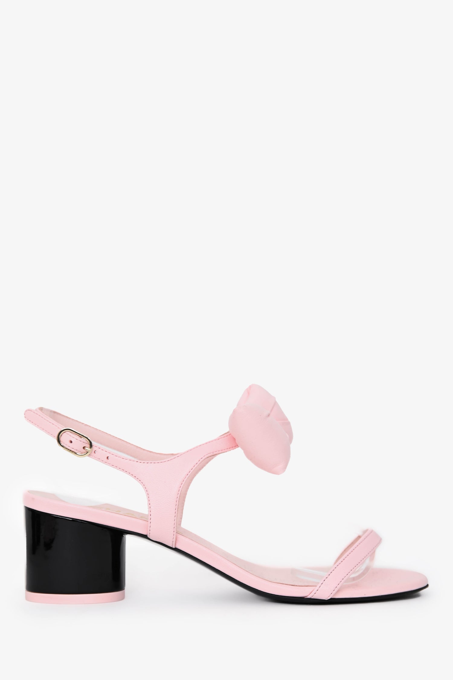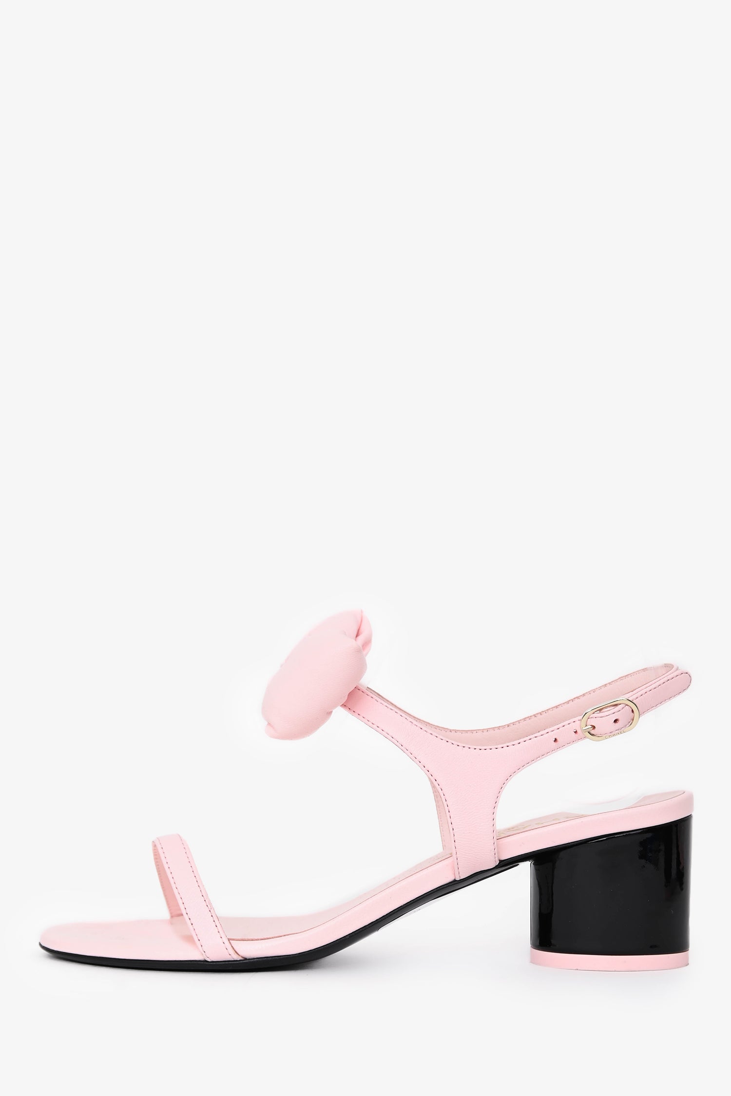 Pre-Loved Chanel™ 2025 Pink Lambskin Bow Sandals. Slip-on. Open, round toe. Adjustable slingback. Leather insole. Gold-tone hardware. Tonal stitching.