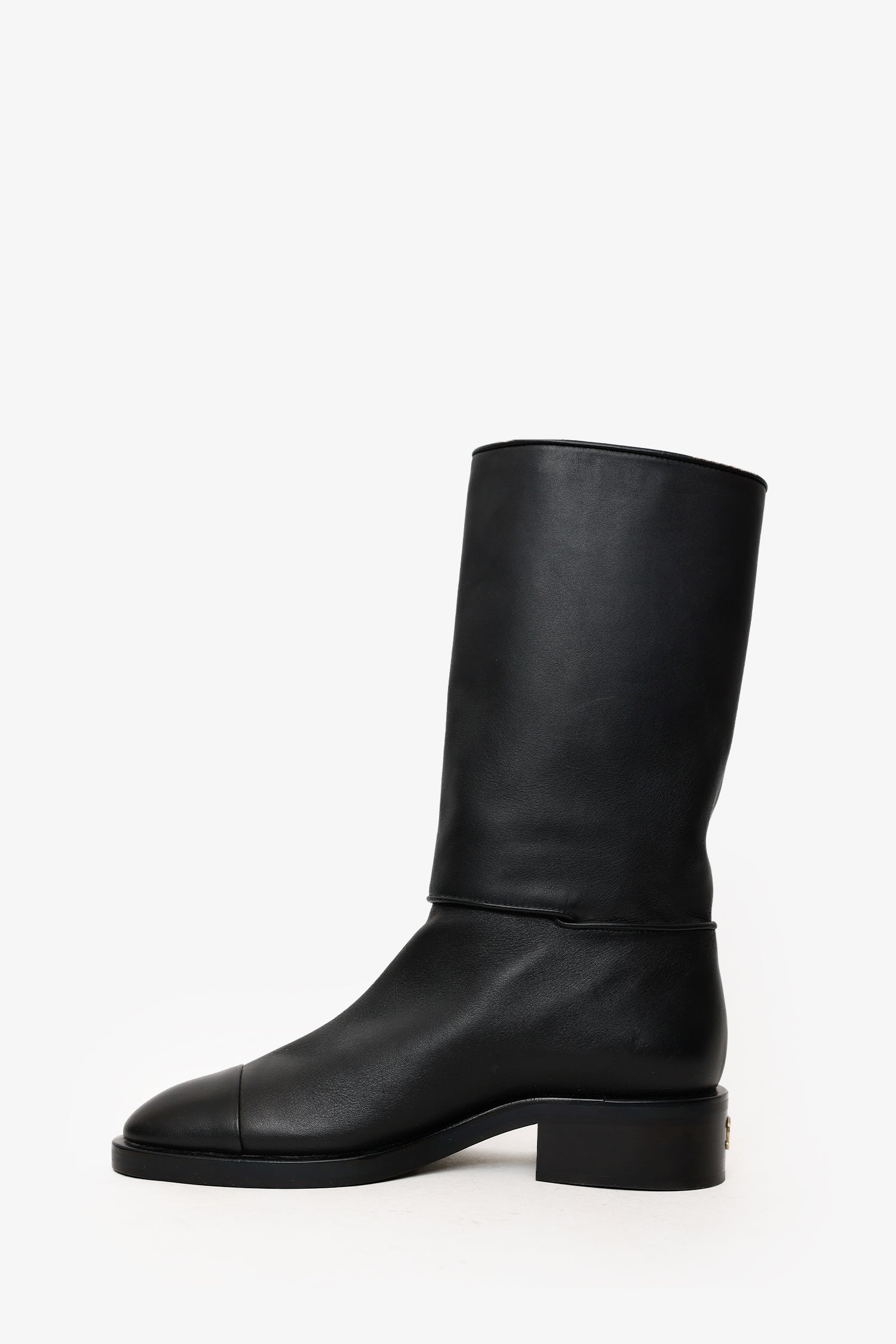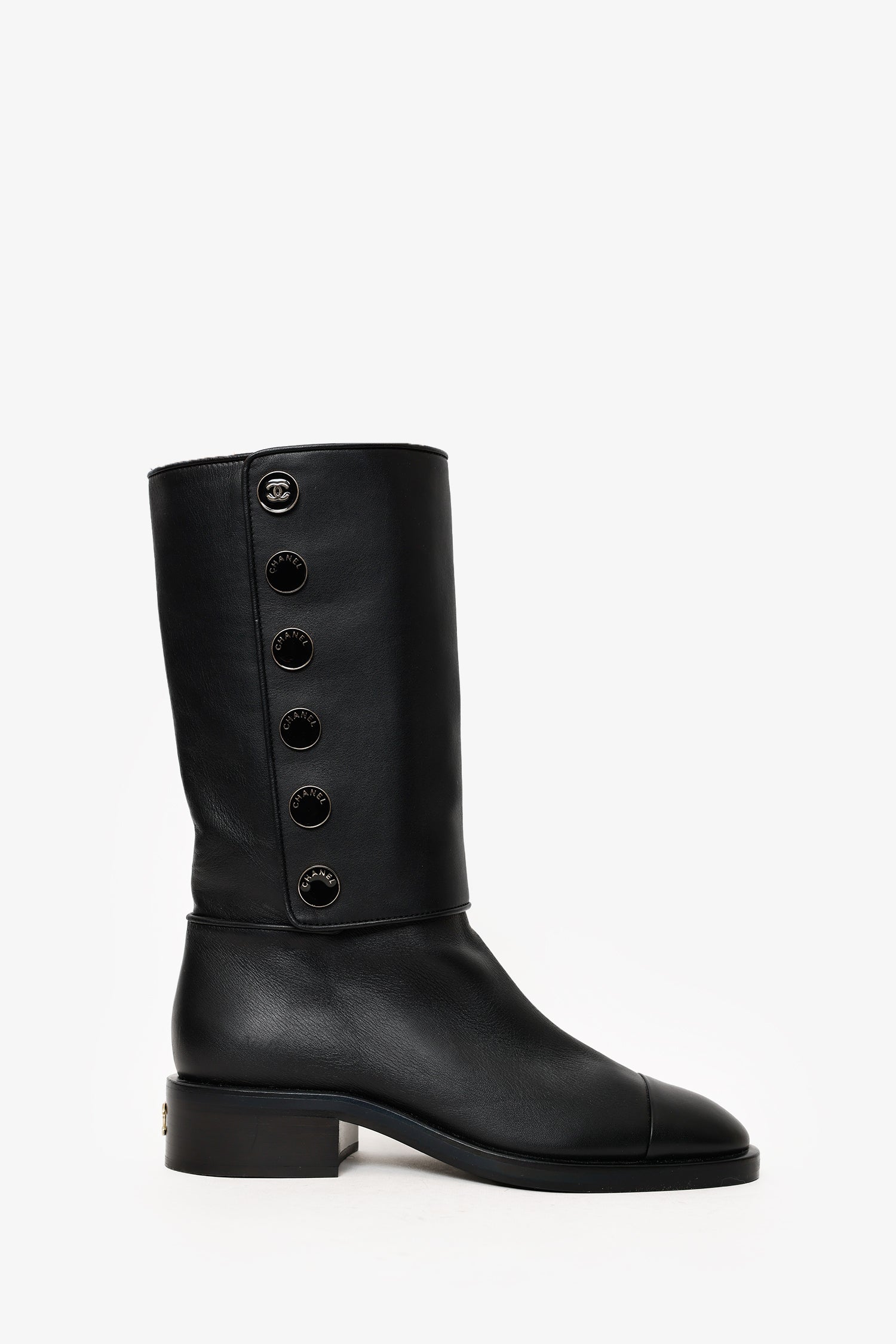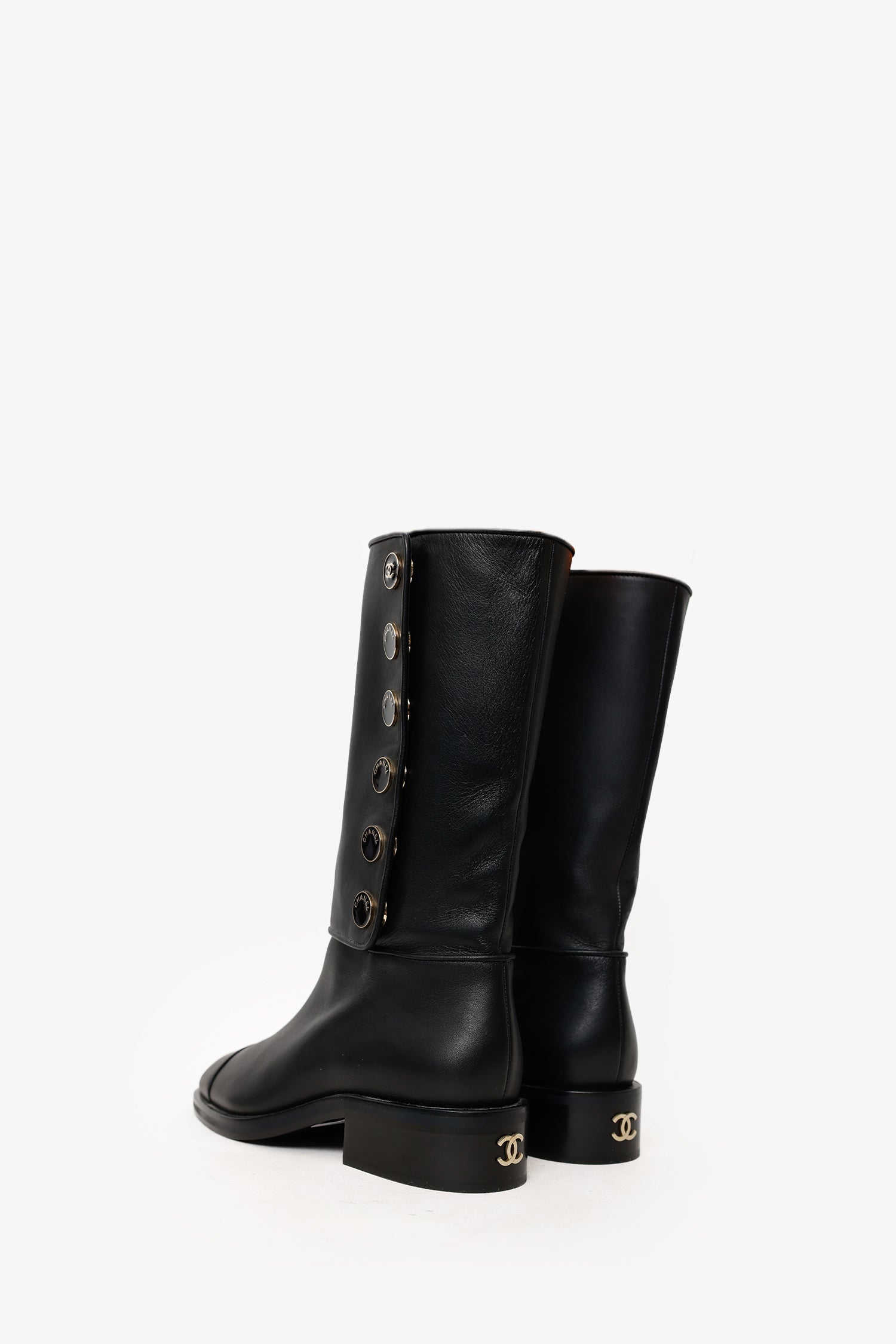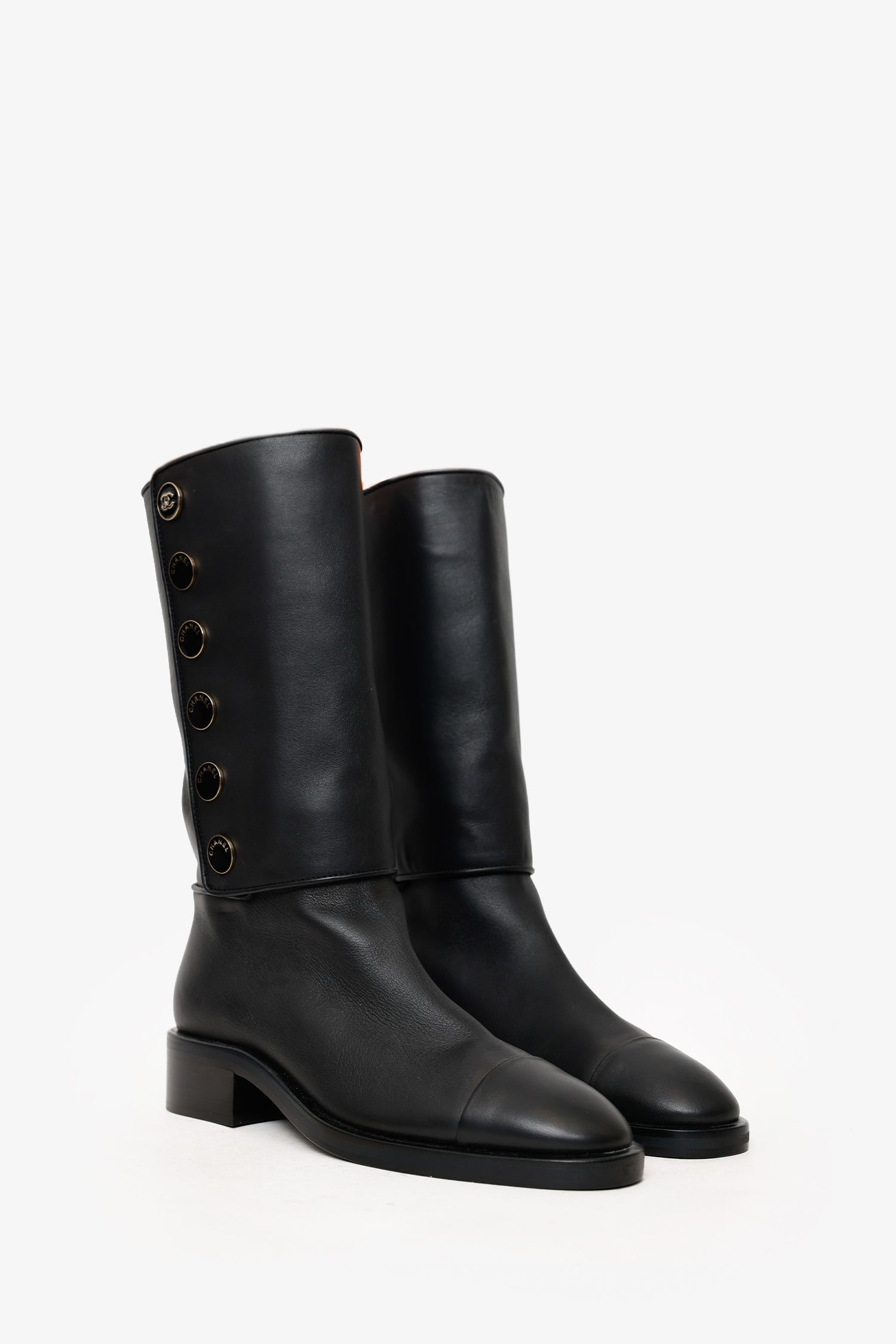 Pre-Loved Chanel™ Black Leather CC Biker Boots. Round neckline. Side fold-over flap with snap-button-up closure. Block heel. Lined interior. Gold-tone hardware. Tonal stitching.