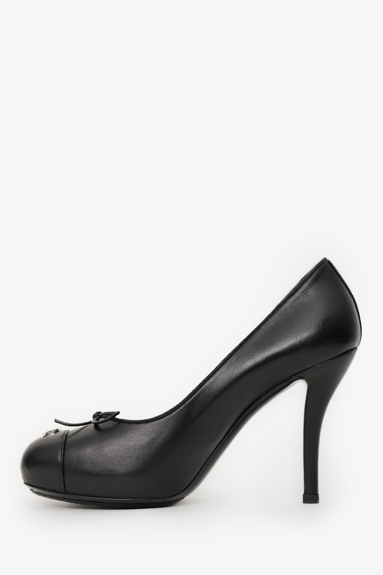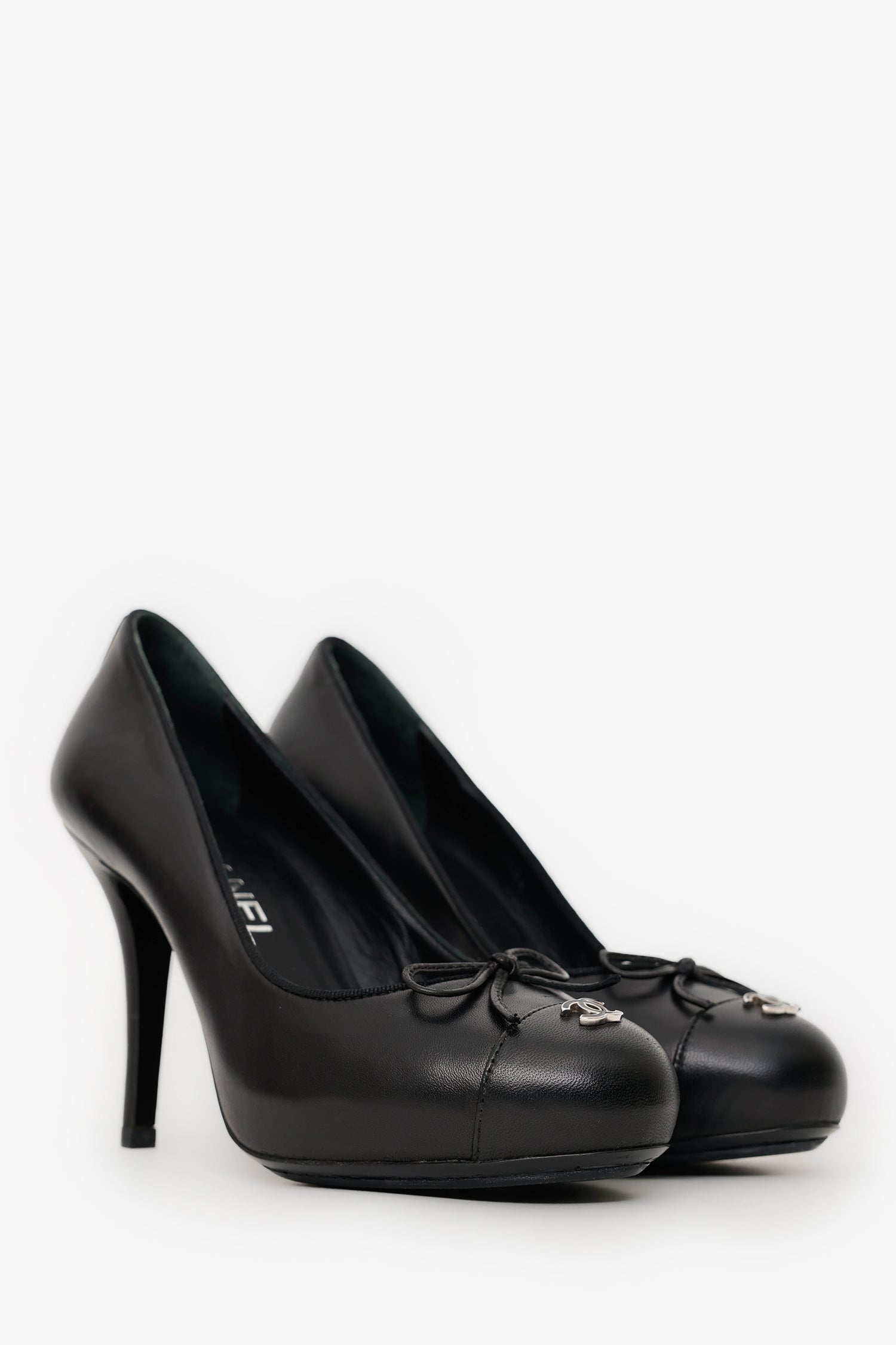Pre-Loved Chanel™ Black Leather CC Cap Toe Platform Pumps. Round toe. Lined interior. Silver-tone hardware. Tonal stitching.