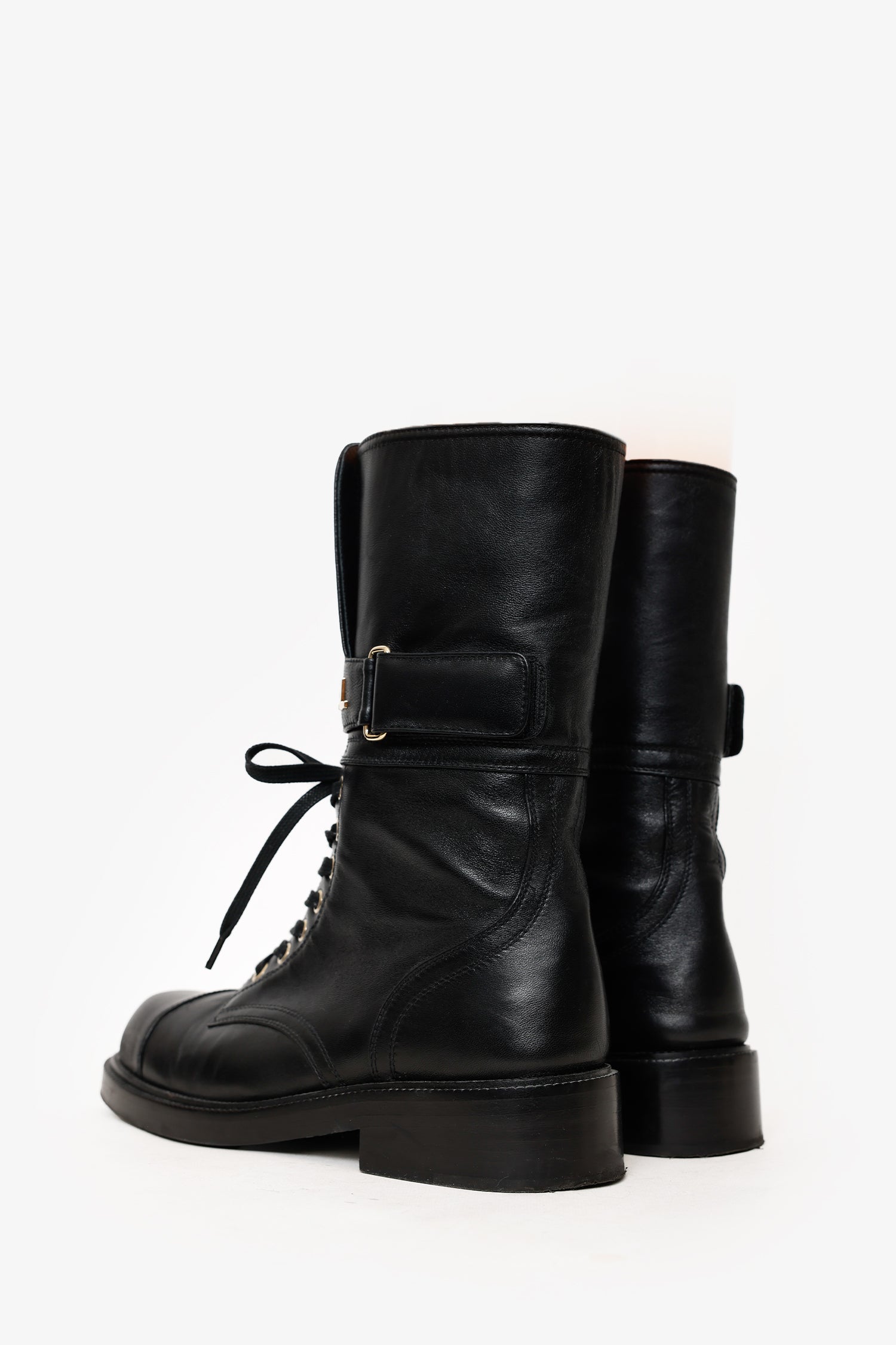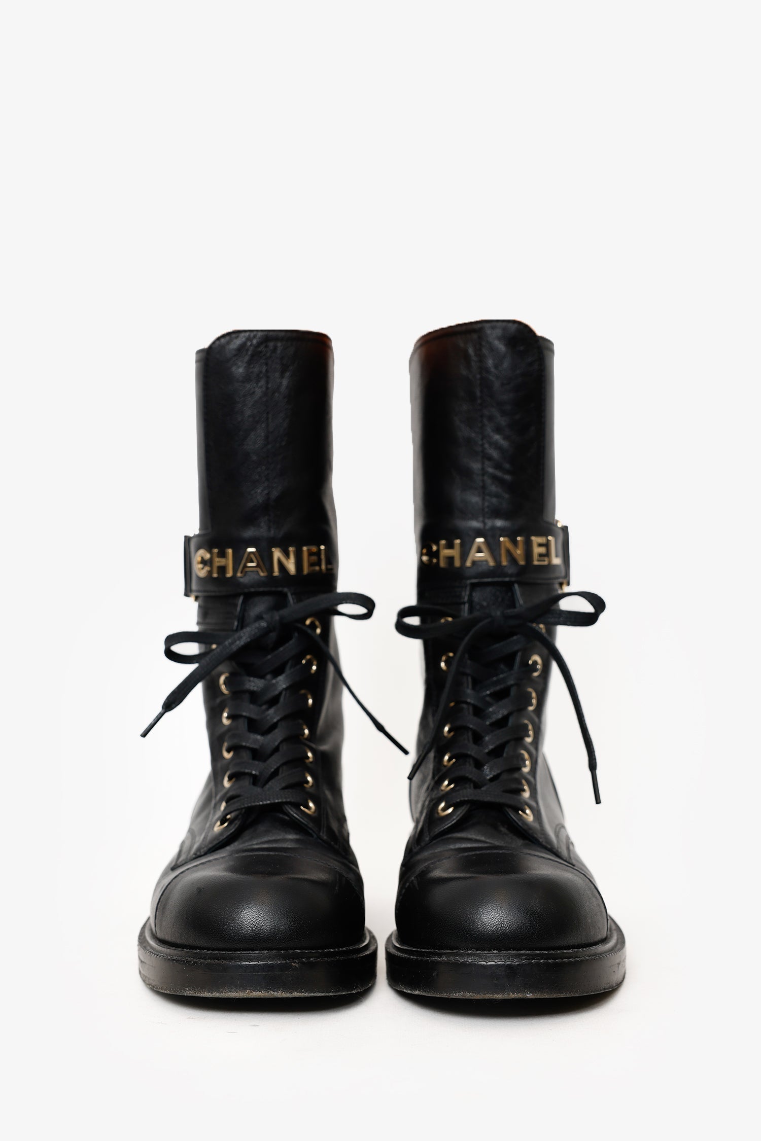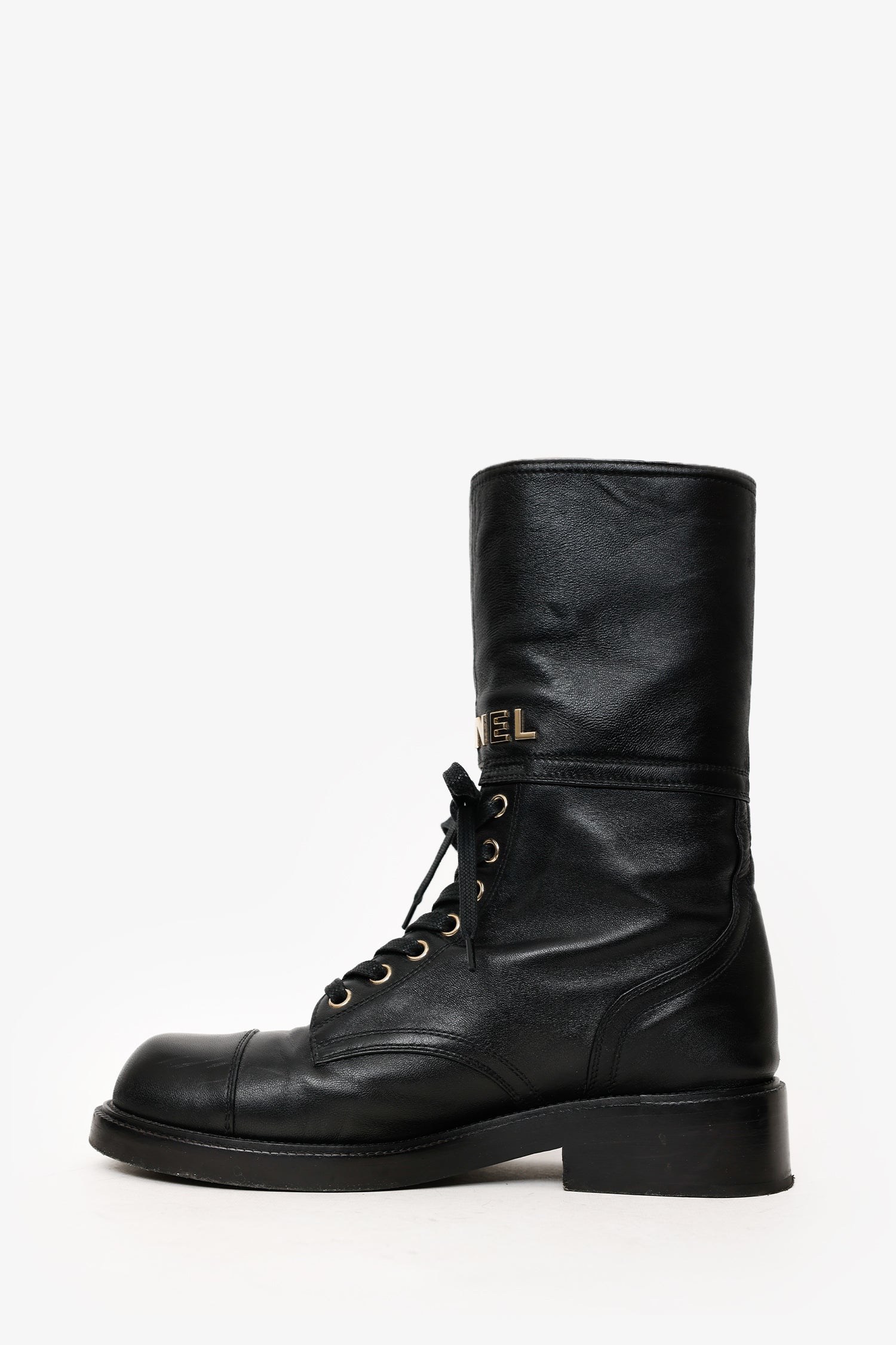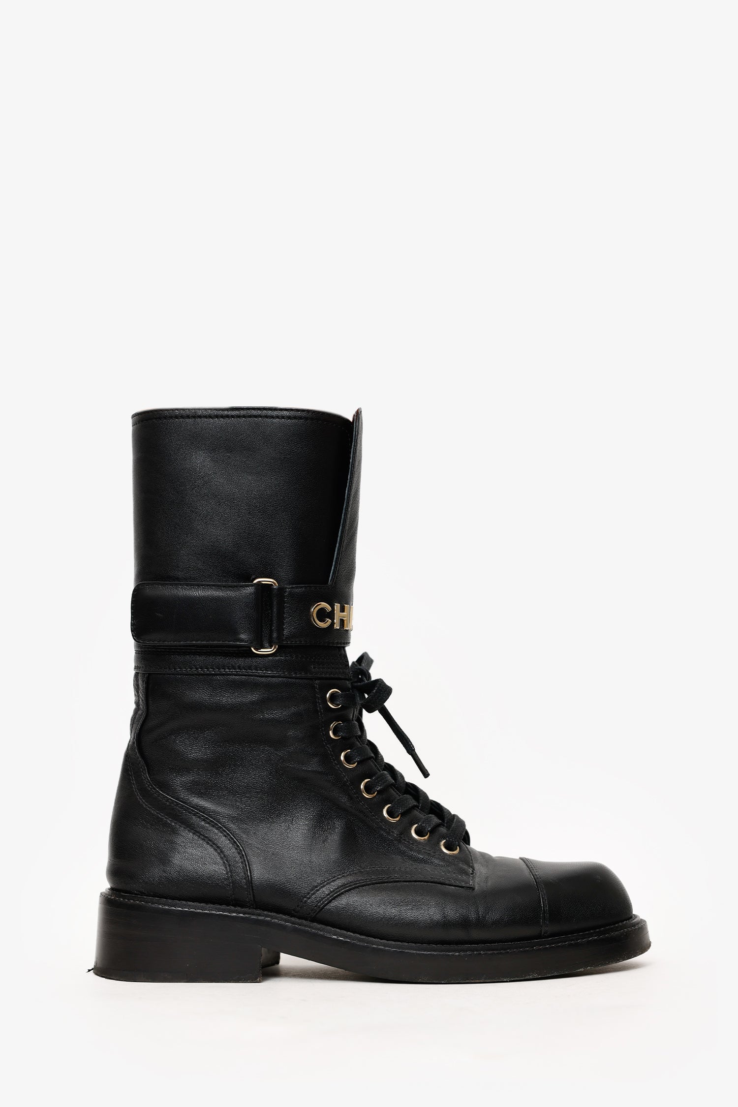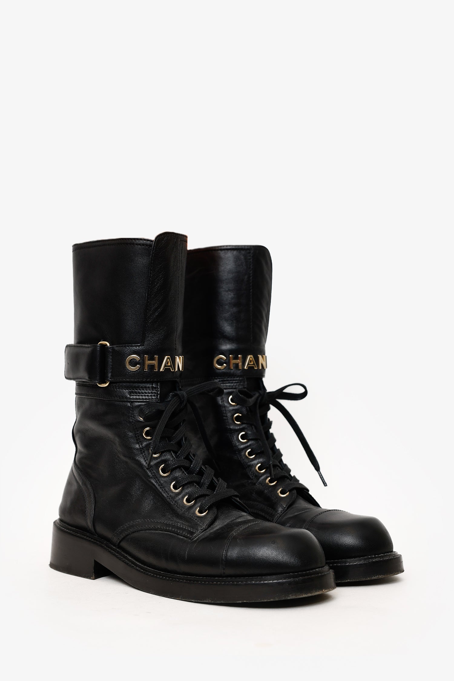 Pre-Loved Chanel™ Black Leather Combat Boots. Round toe. Front lace-up with velcro closure. Block heel. Leather-lined interior. Gold-tone hardware. Tonal stitching.