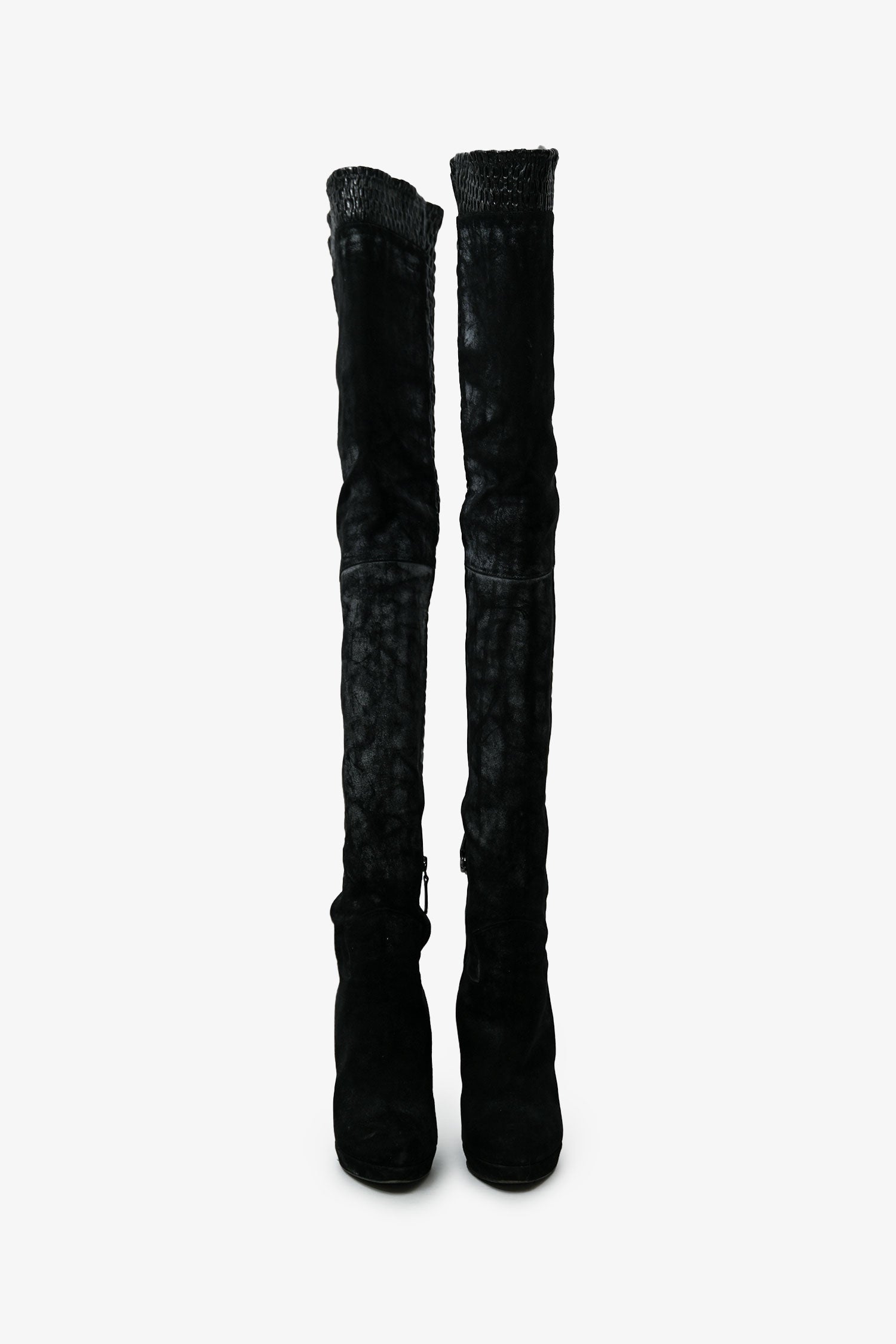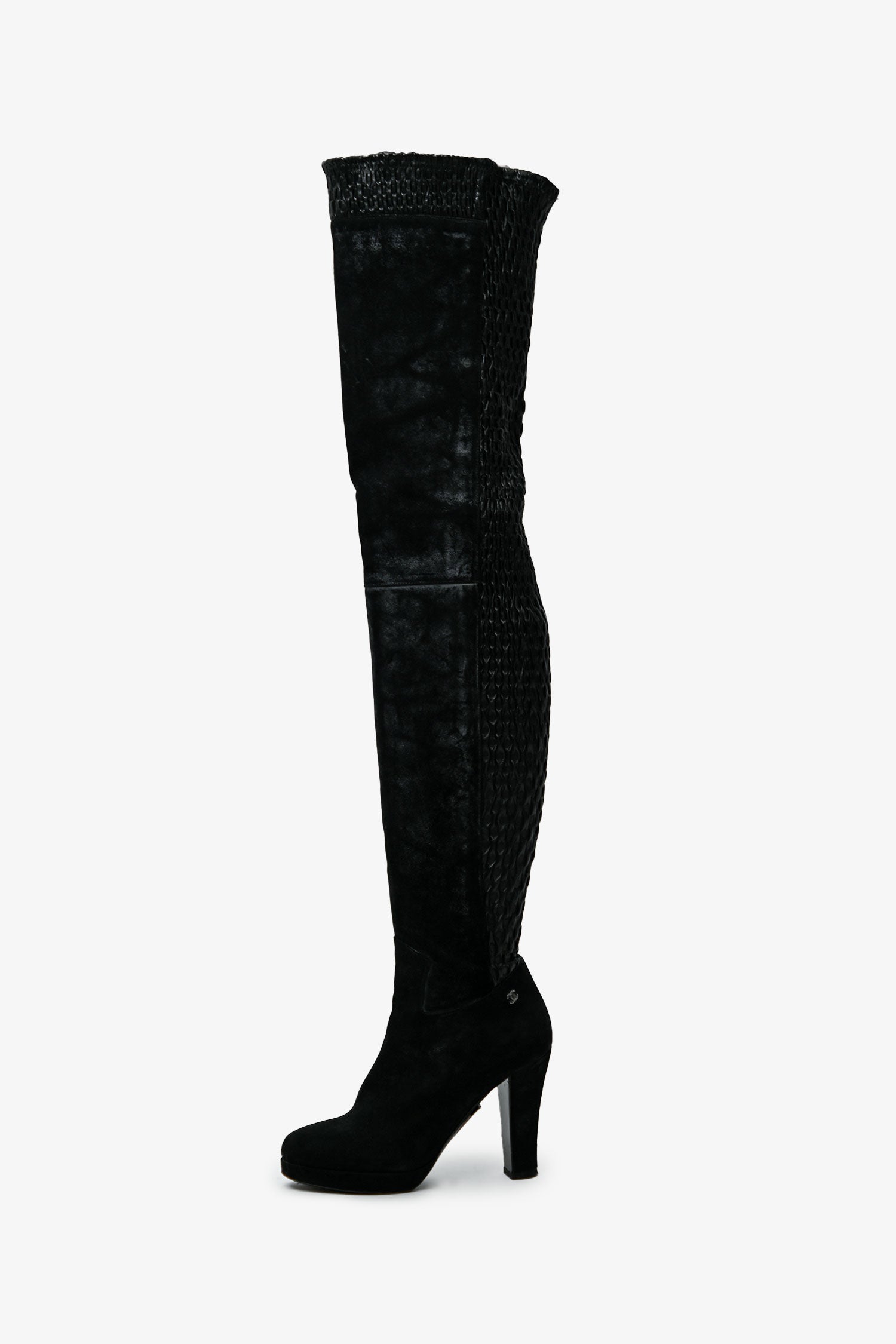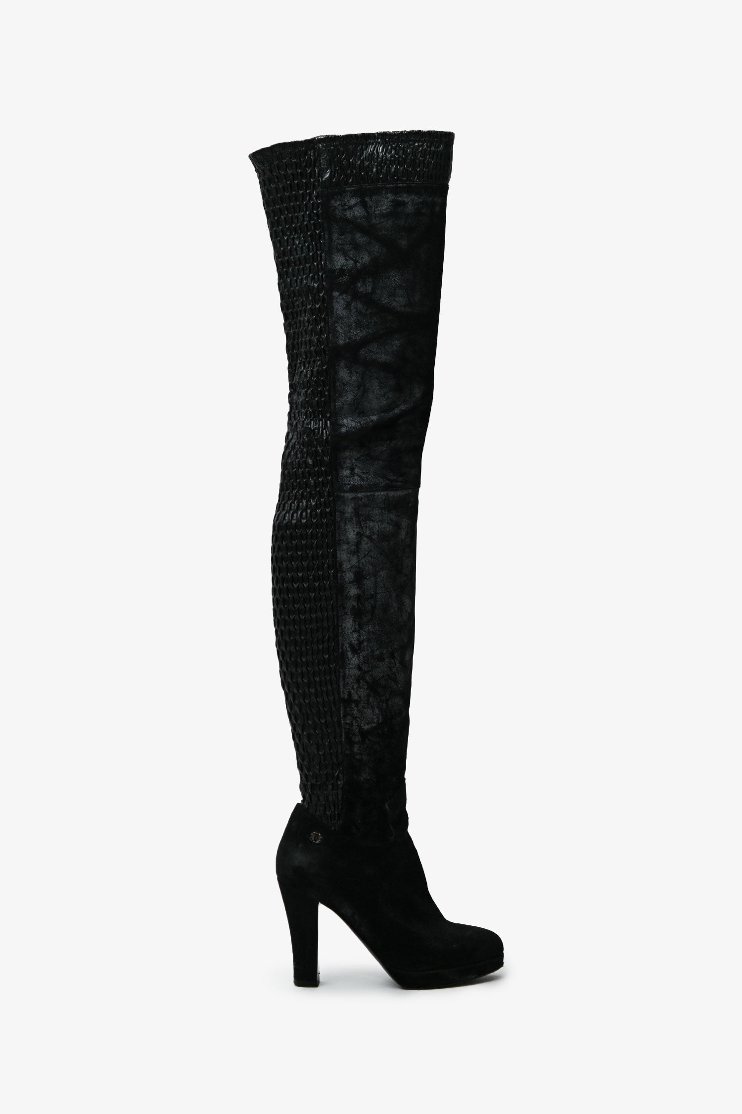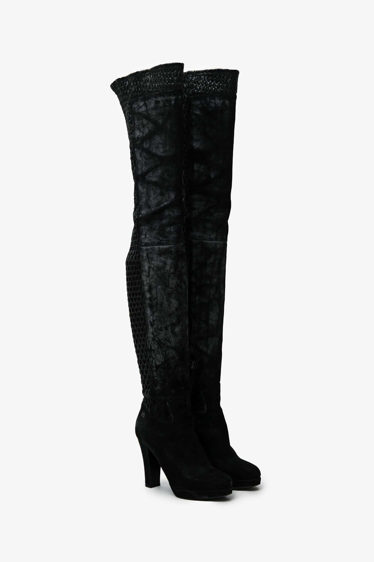 Pre-Loved Chanel™ Black Leather Distressed Textured Thigh High Boots. Round toe. Side zip closure. Silver-tone hardware. Tonal stitching.