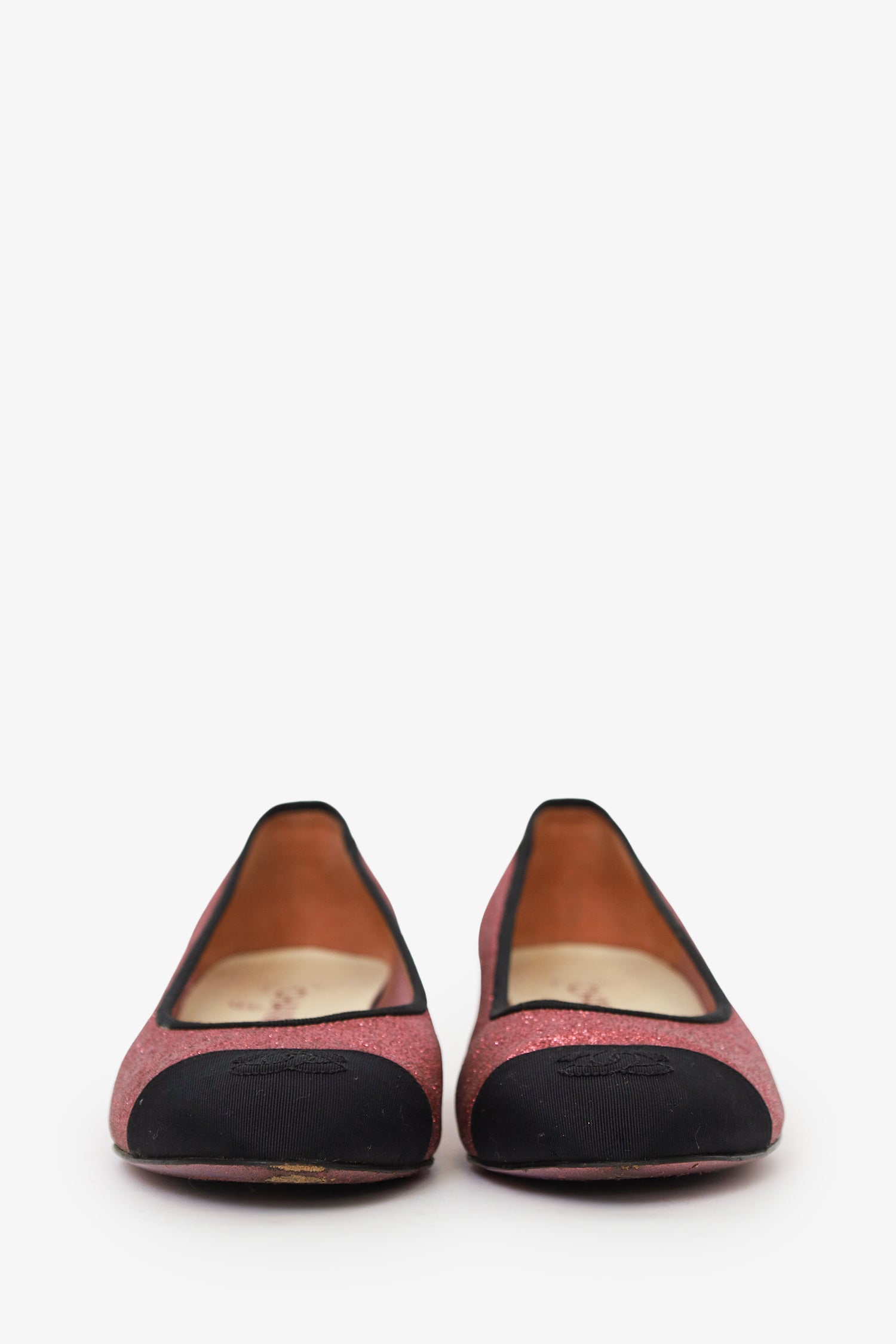 Pre-Loved Chanel™ Pink/Black Glitter Leather CC Ballerina Pumps. Round toe. Gold-tone hardware. Tonal stitching.