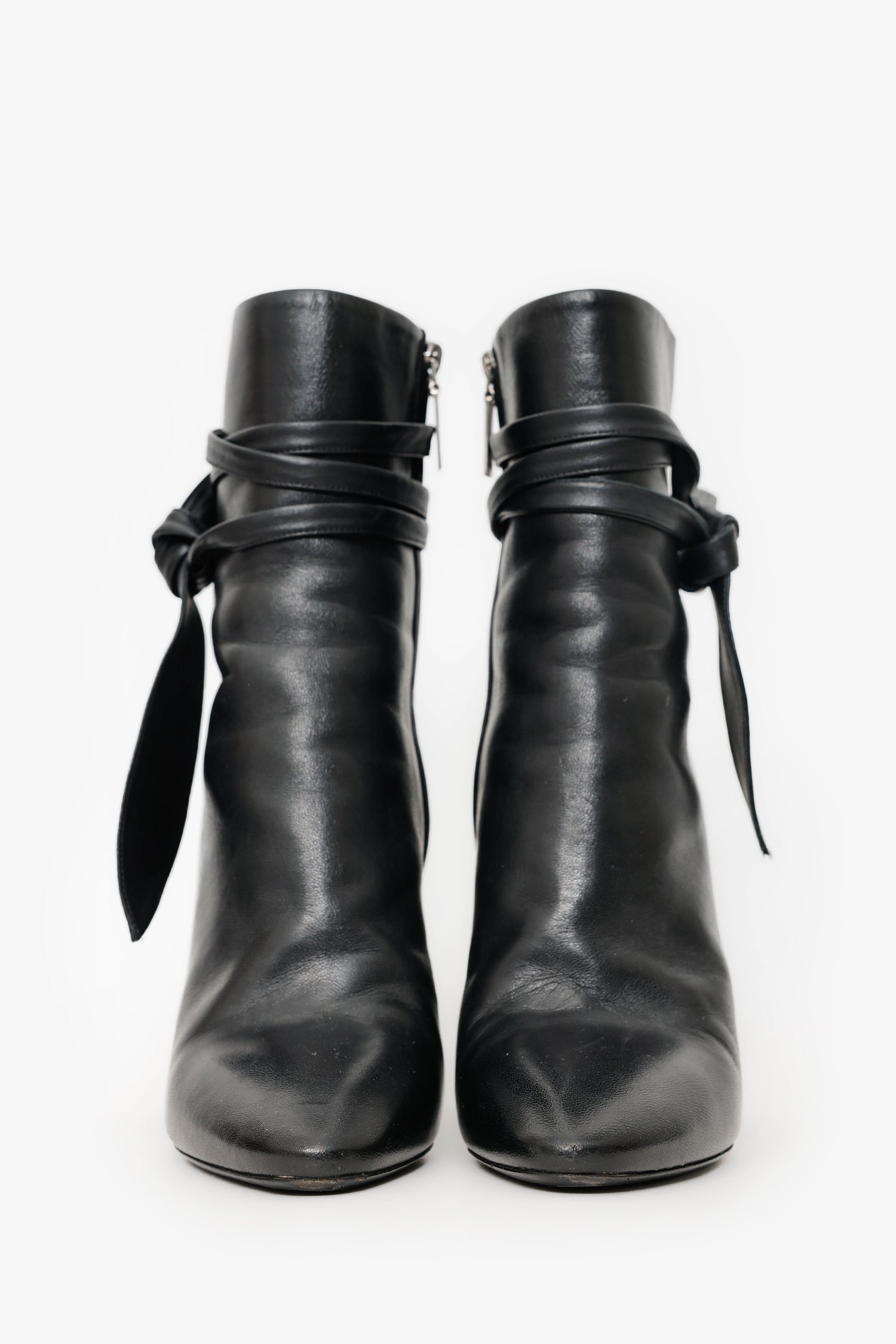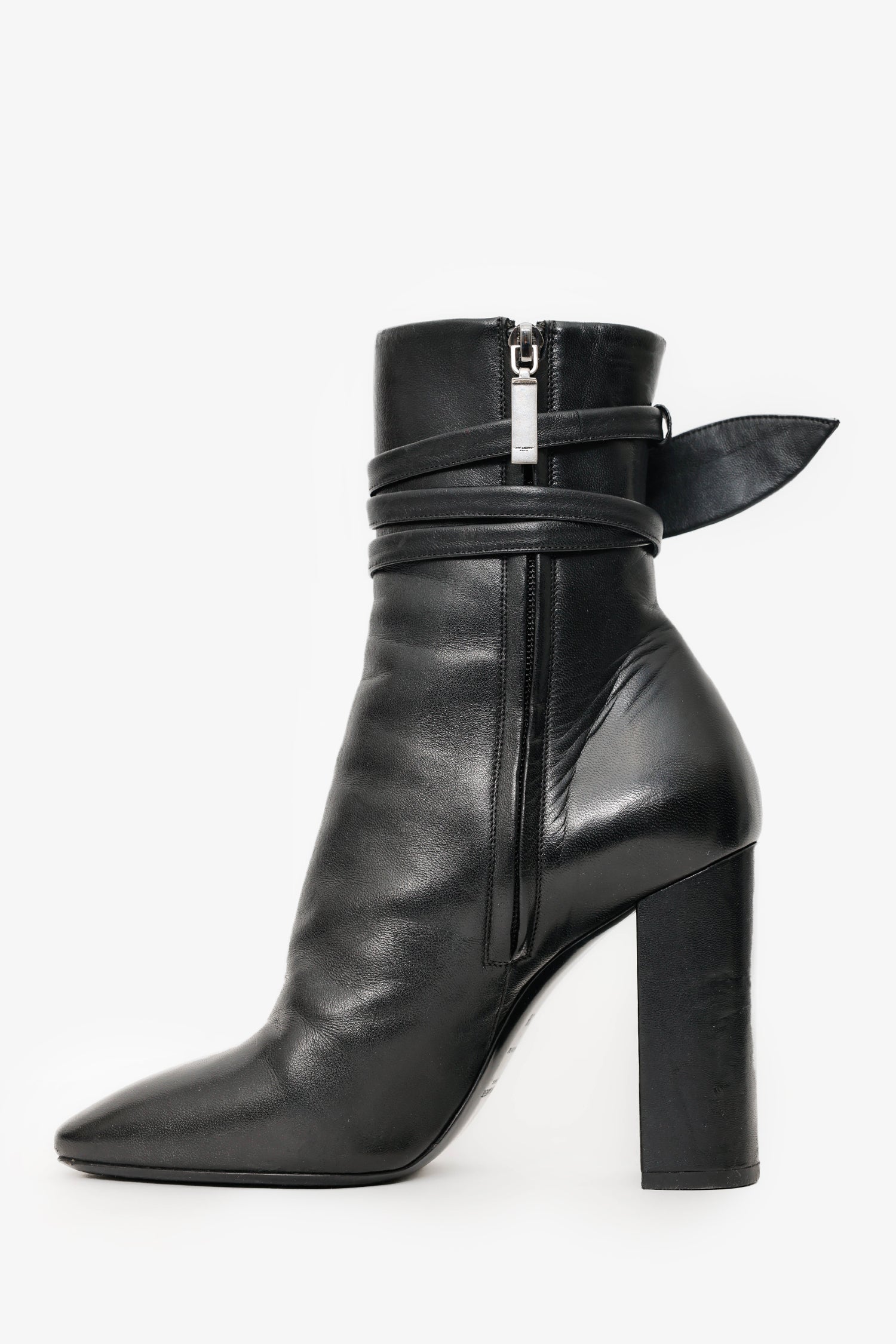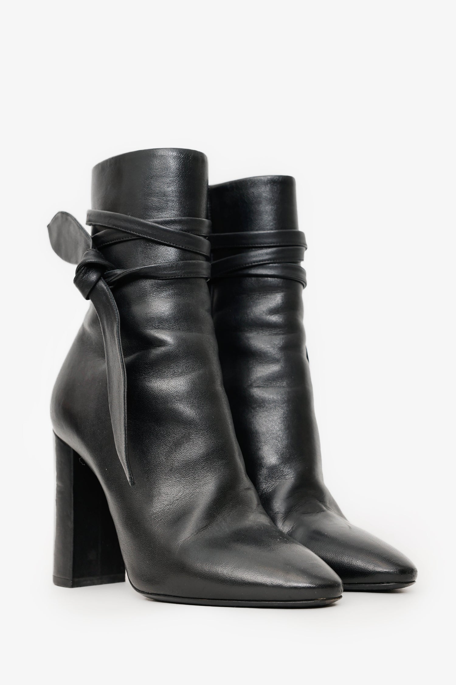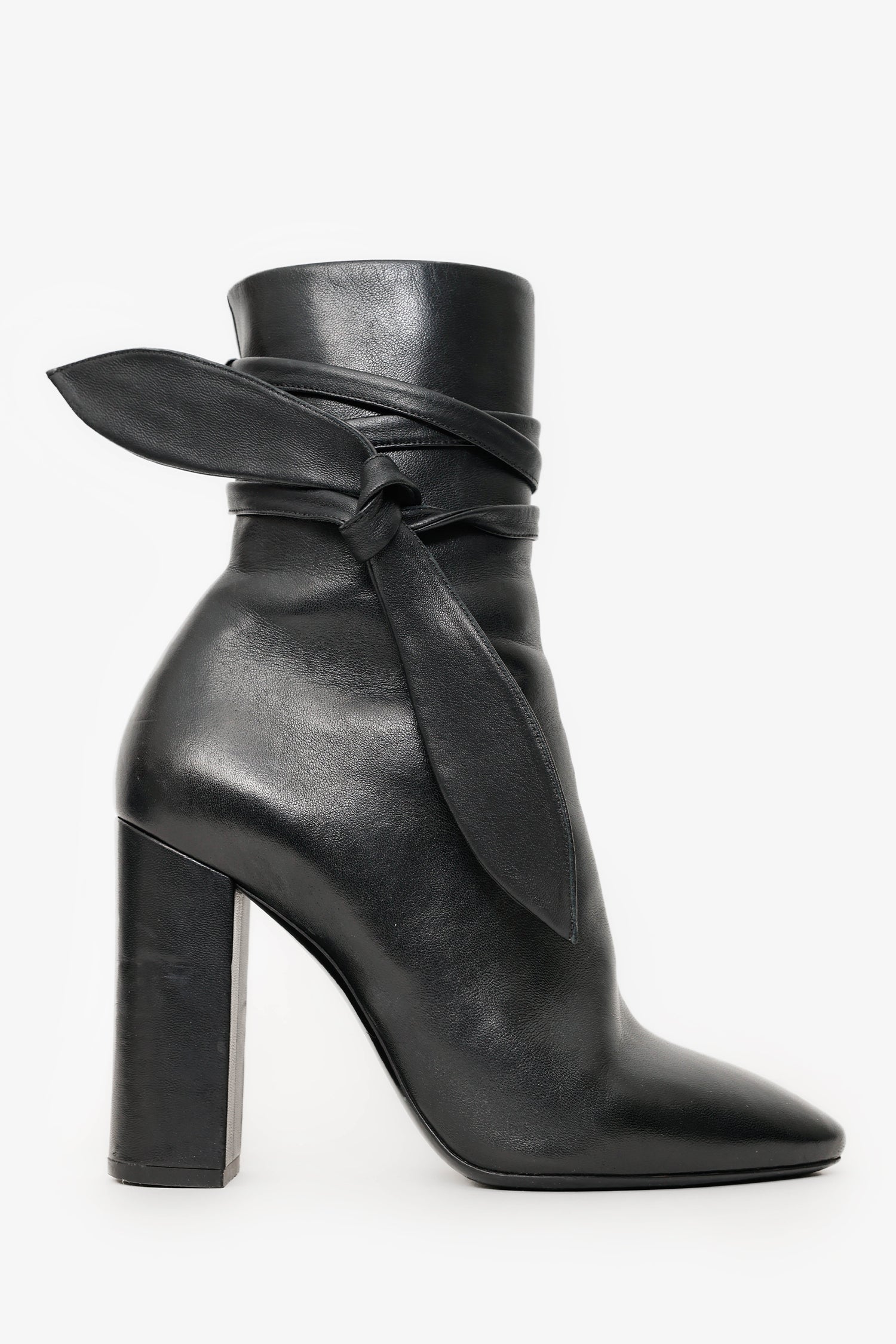 Saint Laurent Black Leather Wrap Around Bow Boots. Round toe. Side zip with tie-up closure. Block heel. Gunmetal-tone hardware. Tonal stitching.