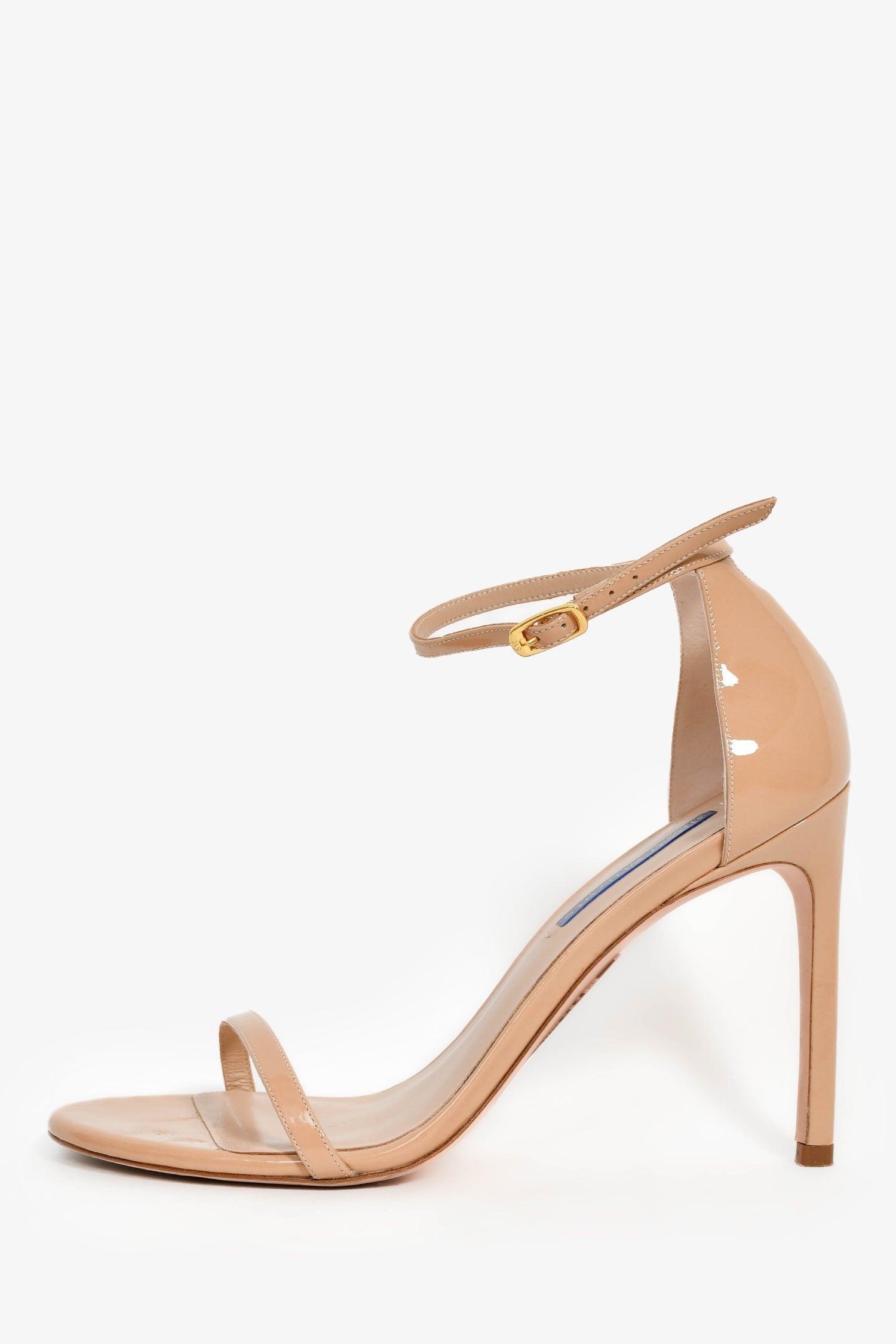 Stuart Weitzman Beige Leather Sandals. Slip-on. Open round toe. Ankle strap with adjustable buckle closure. Leather insole. Gold-tone hardware. Tonal stitching.