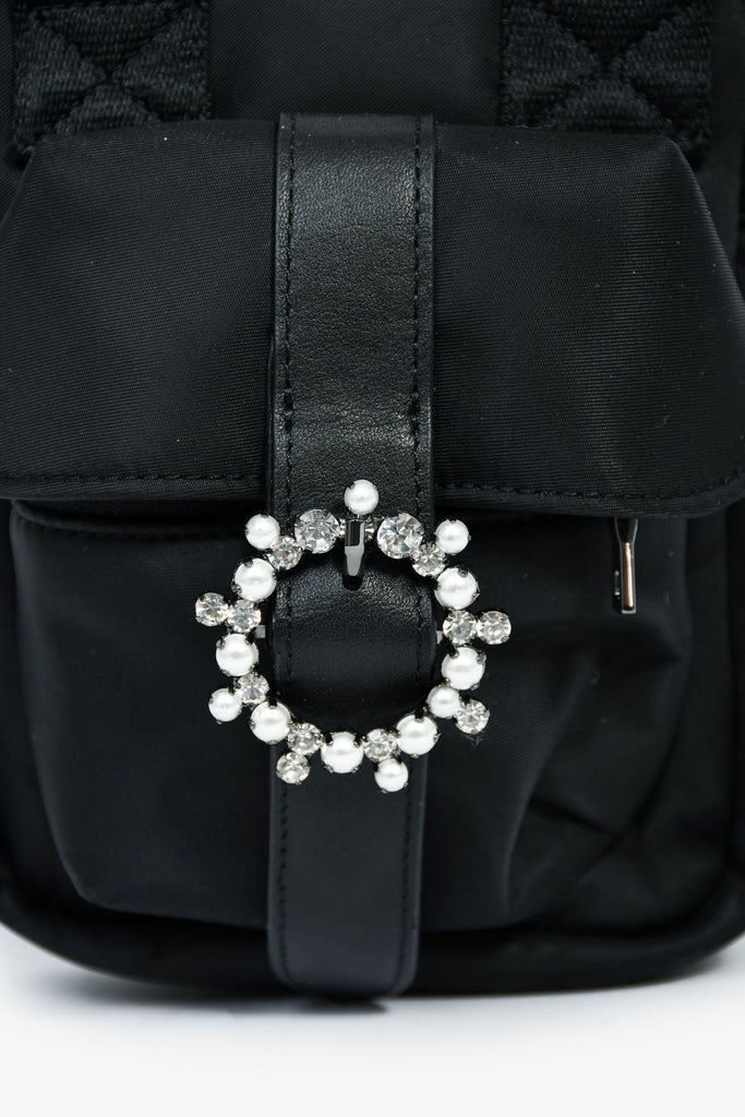 Simone Rocha Black Nylon Faux Pearl/Crystal Buckle Crossbody Bag. Front pocket with fold-over flap with magnetic button closure and zip closure. Dual handles. Top zip closure. Open interior. Adjustable strap. Silver-tone hardware.
