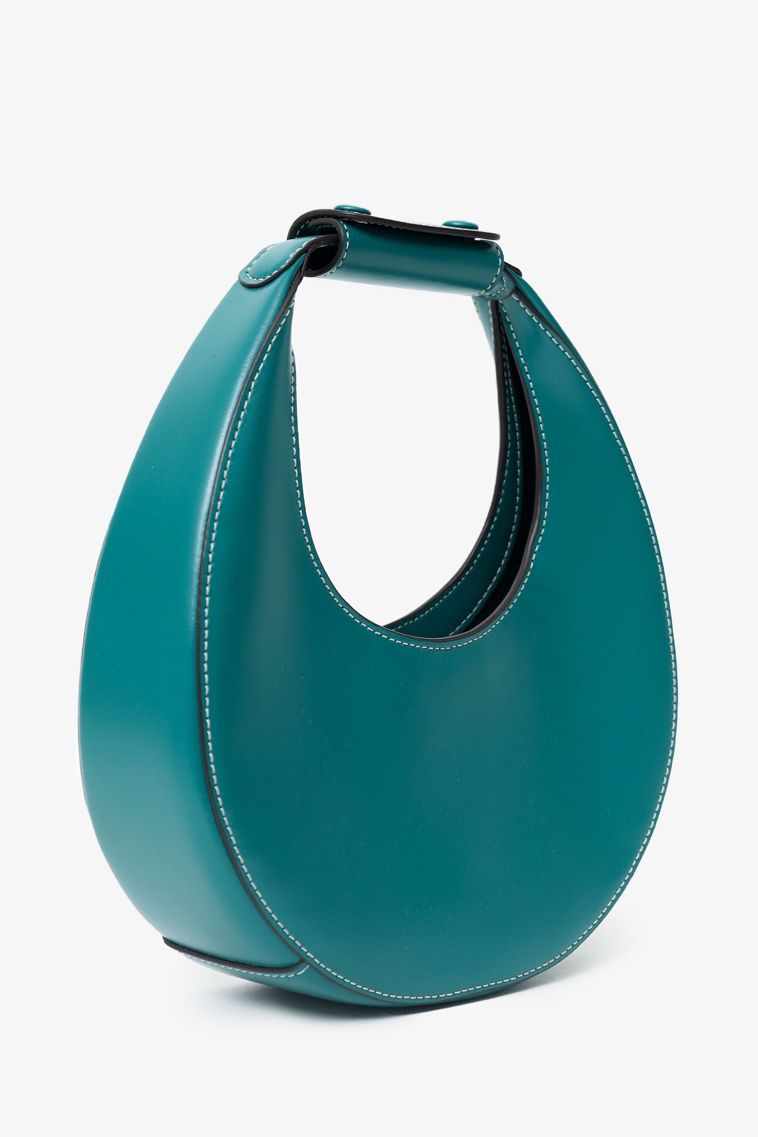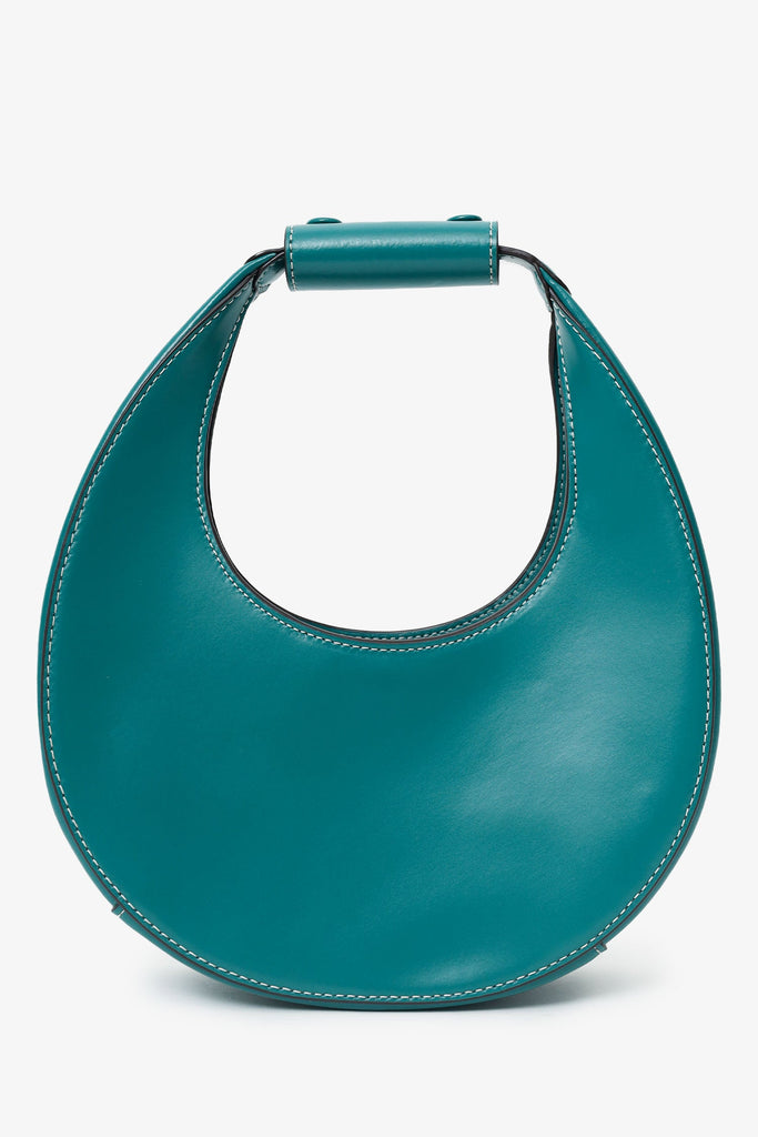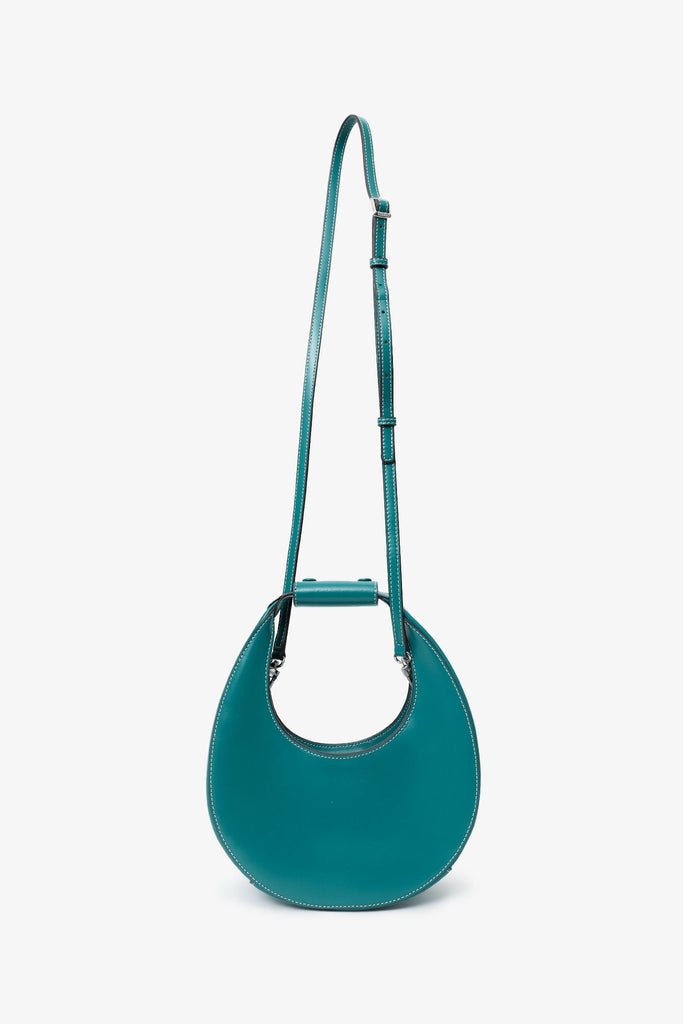 Staud Green Leather Mini Moon Bag With Strap. Top open with magnetic strap closure. Top handle. Removable and adjustable shoulder strap with clasp closure. Removable handle protector with snap-button closure. Suede-lined interior with single zip pocket. Silver-tone hardware. Contrast stitching.