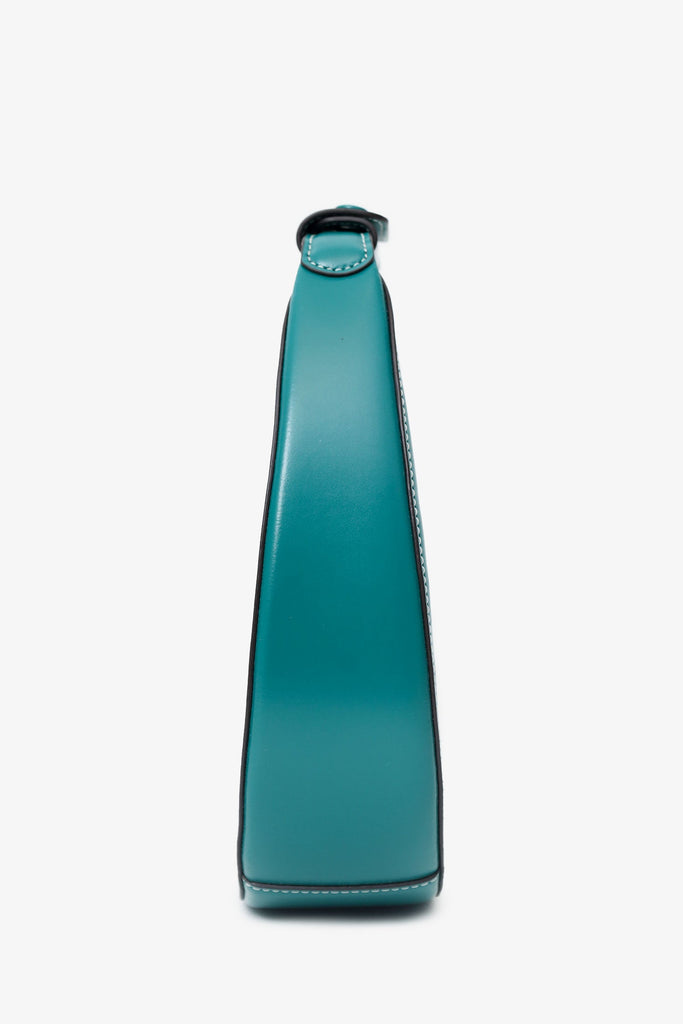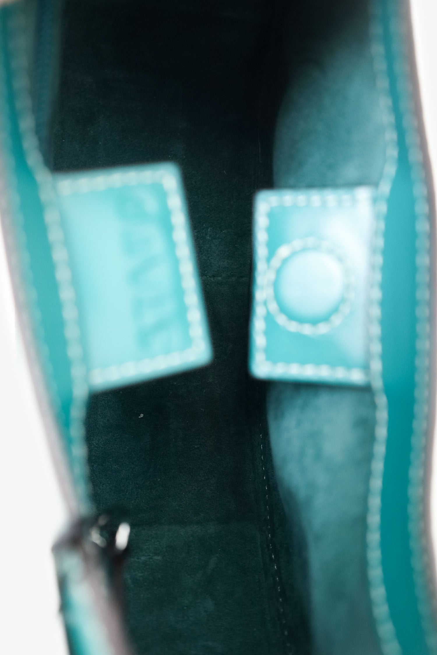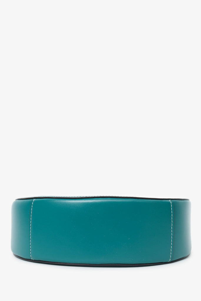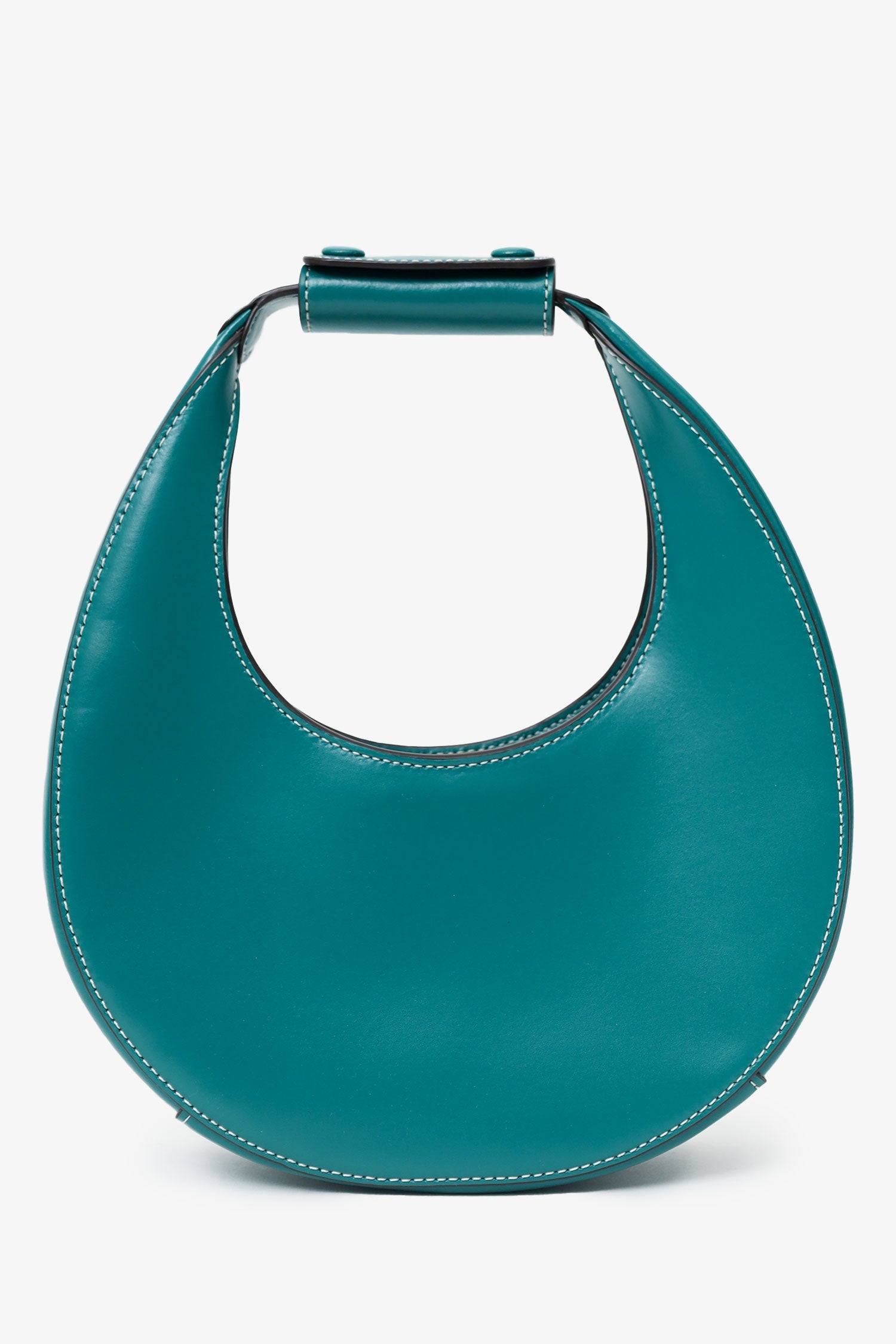 Staud Green Leather Mini Moon Bag With Strap. Top open with magnetic strap closure. Top handle. Removable and adjustable shoulder strap with clasp closure. Removable handle protector with snap-button closure. Suede-lined interior with single zip pocket. Silver-tone hardware. Contrast stitching.