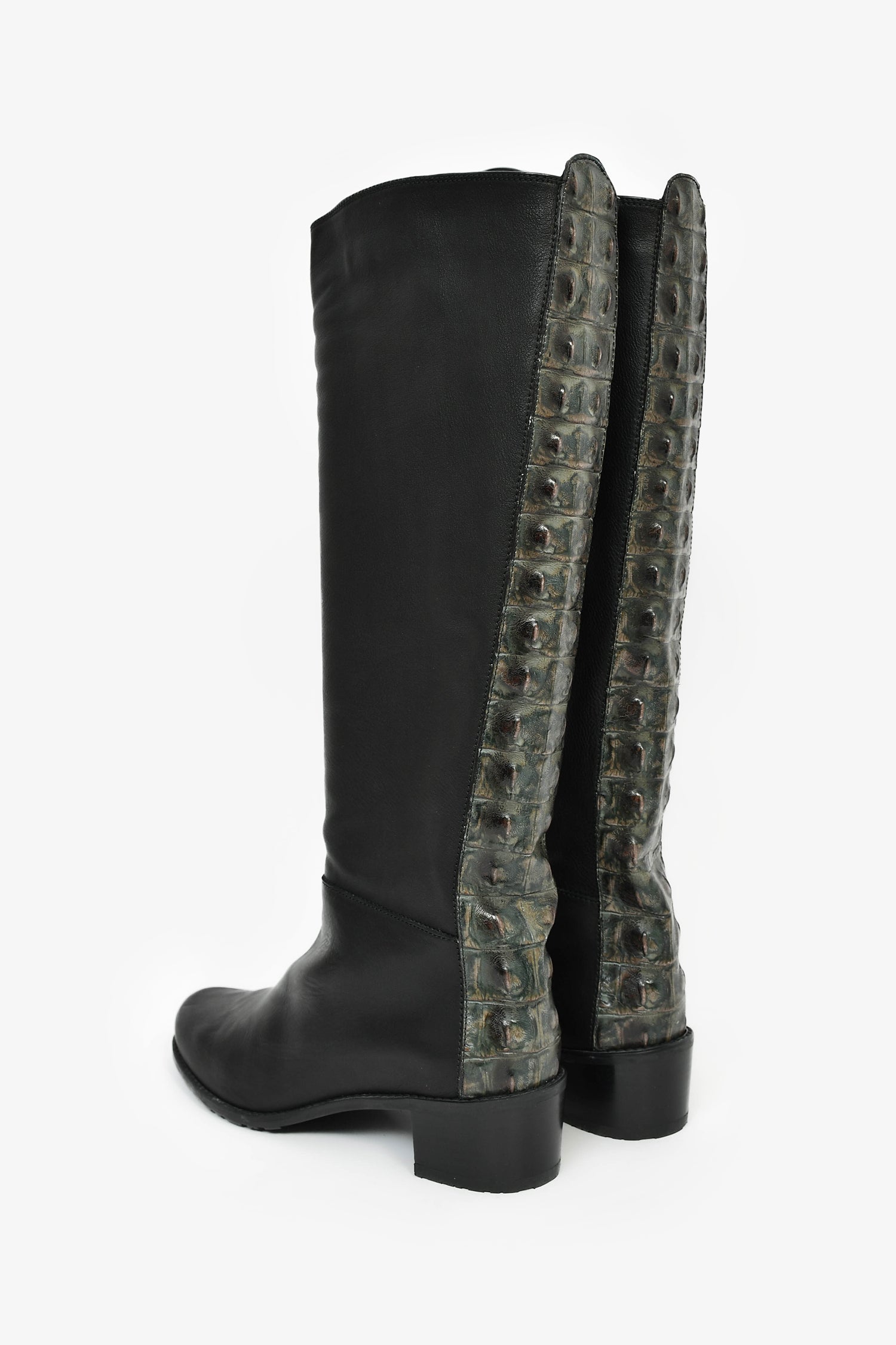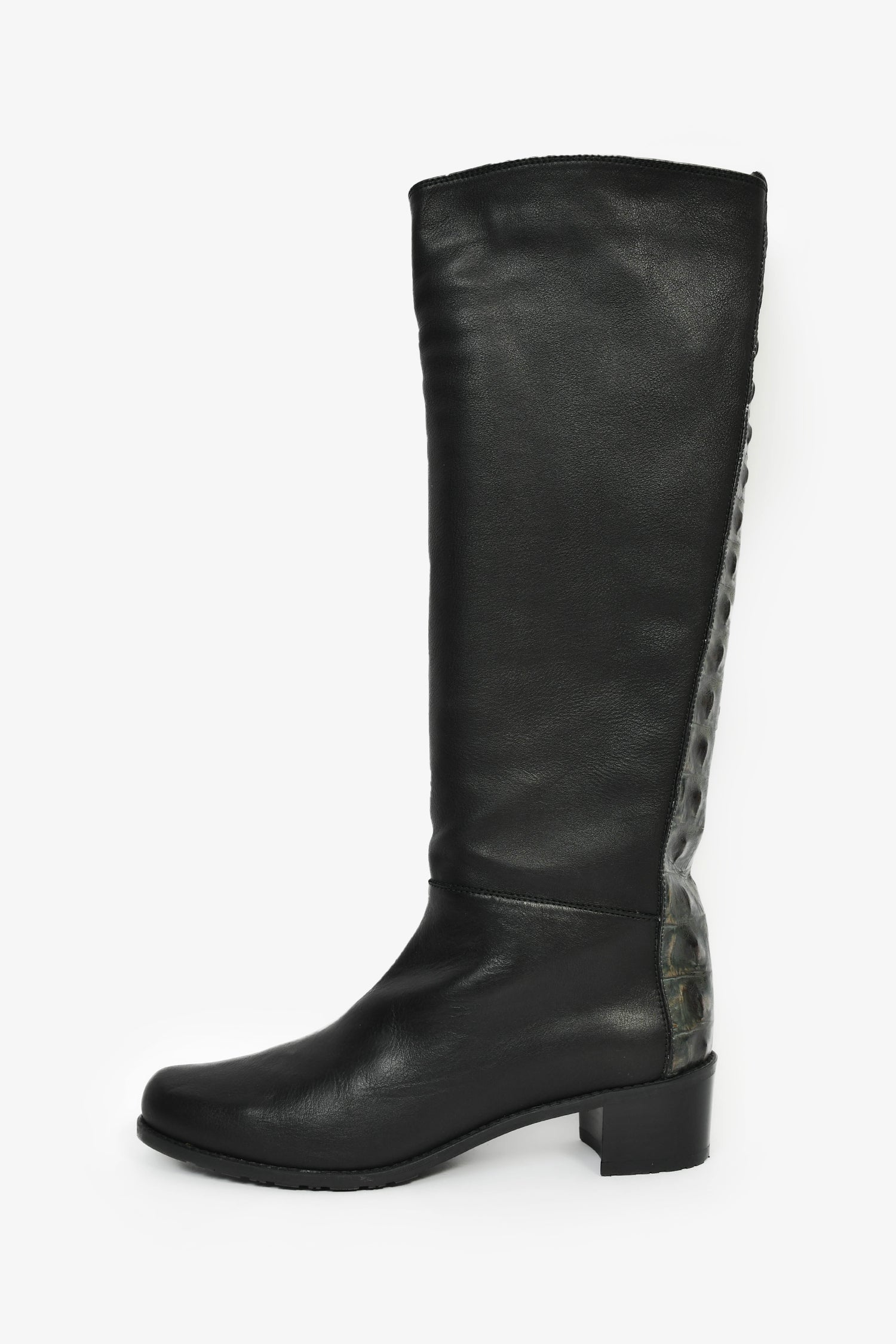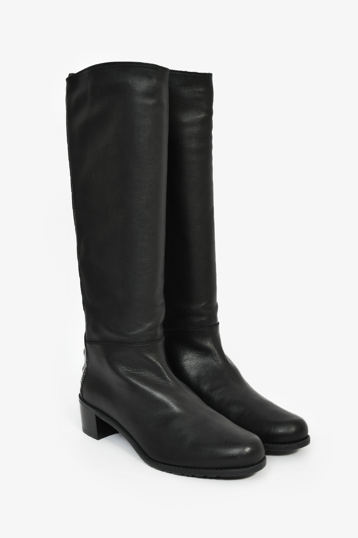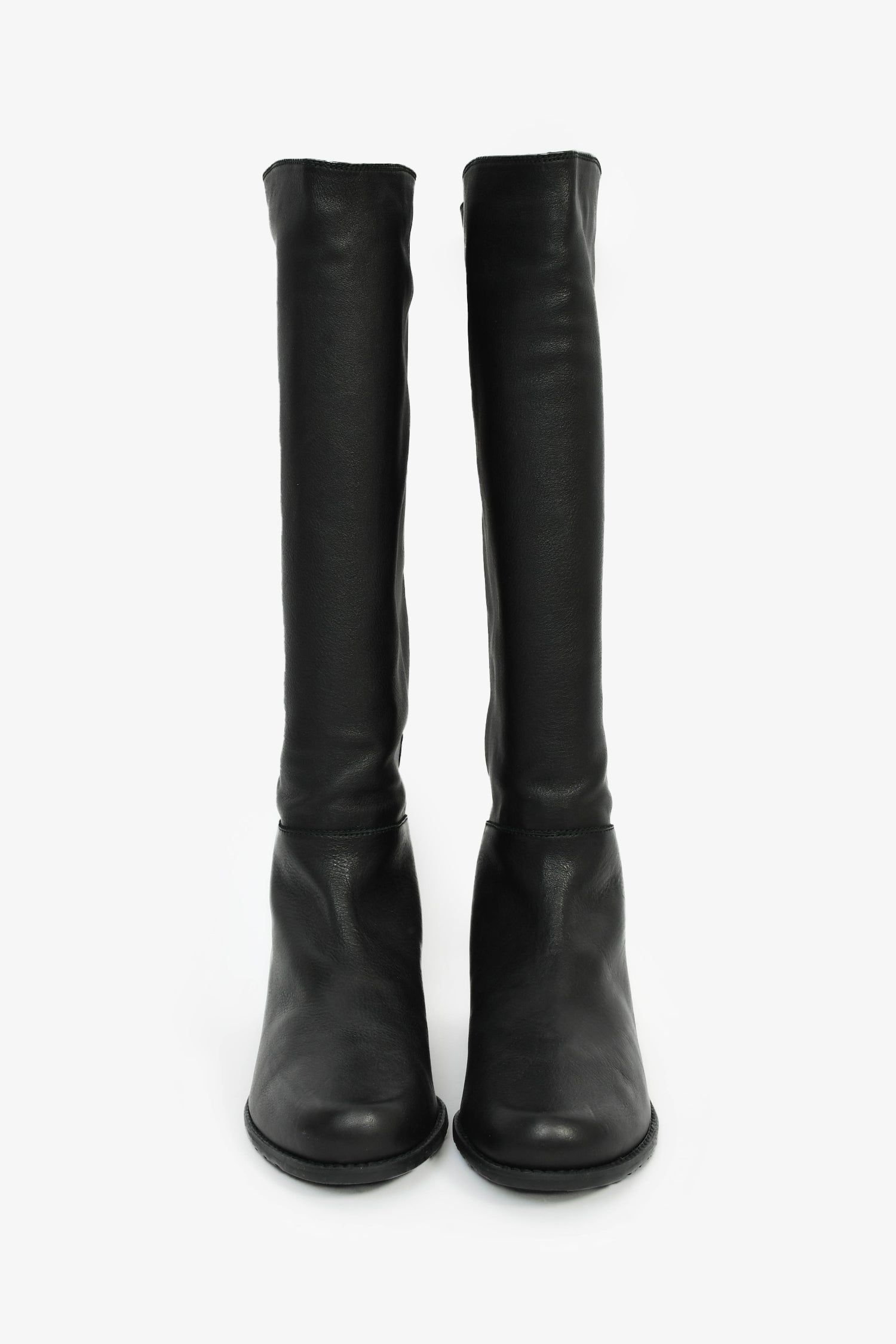 Stuart Weitzman Black Leather High Boots. Pull-on. Round toe. Satin-lined interior. Tonal stitching.