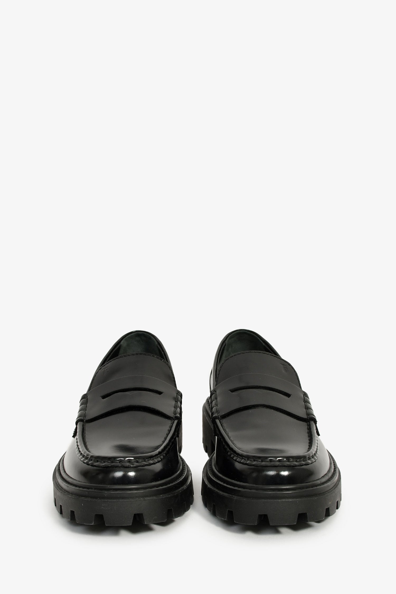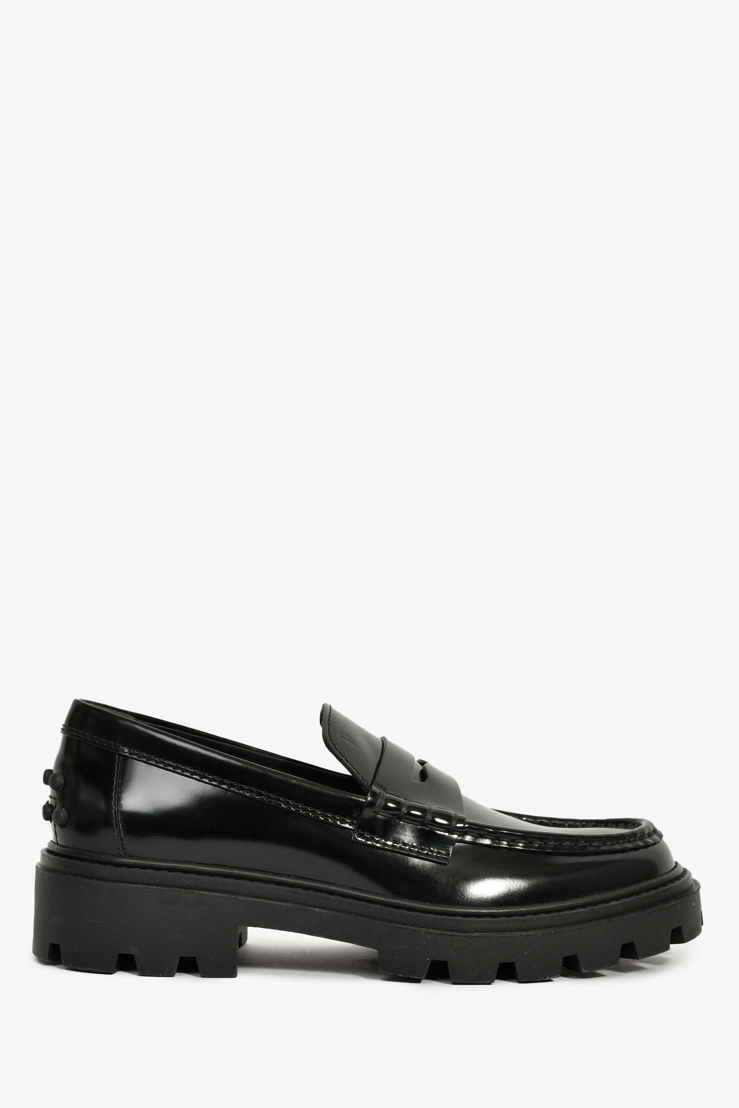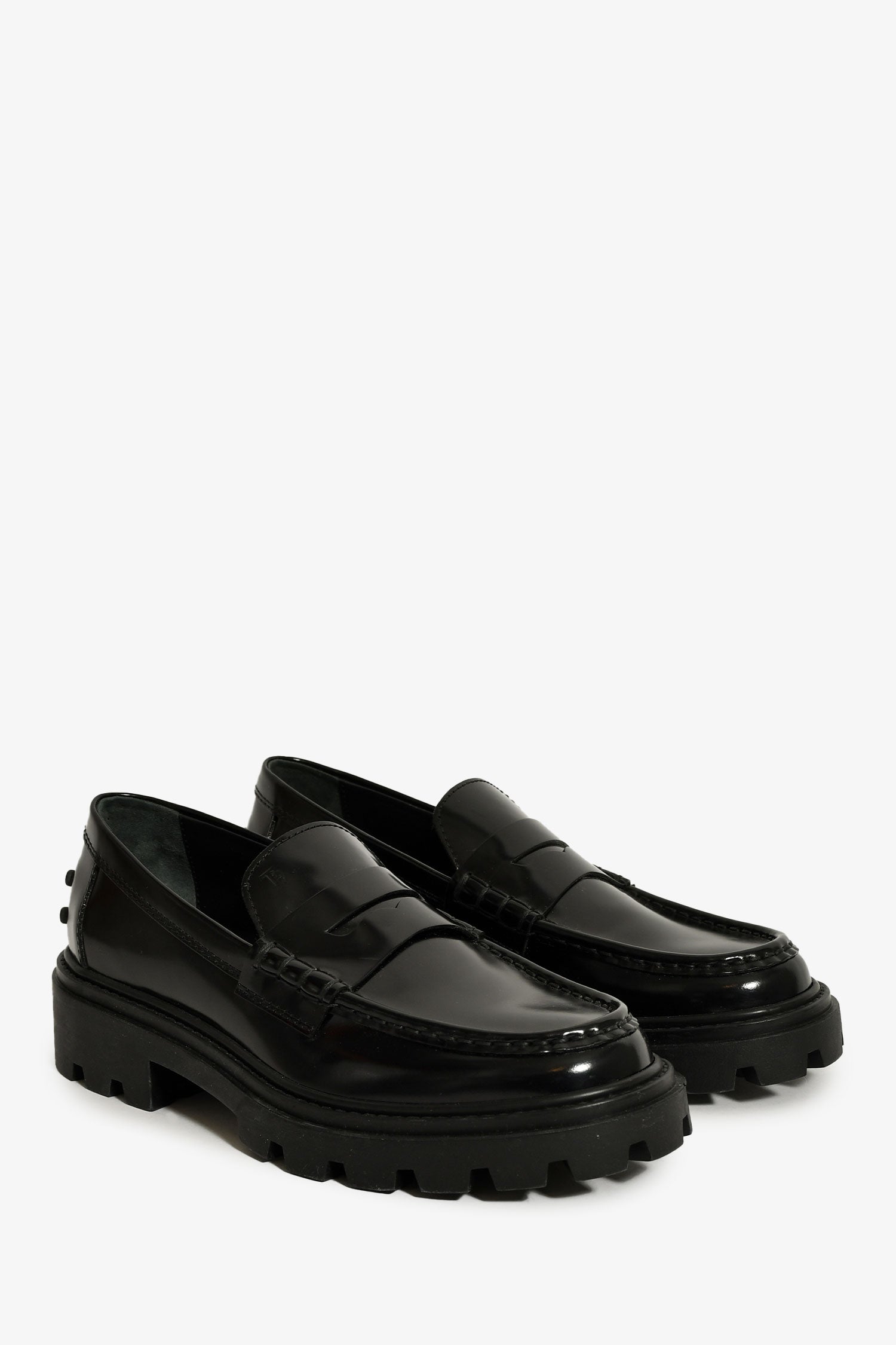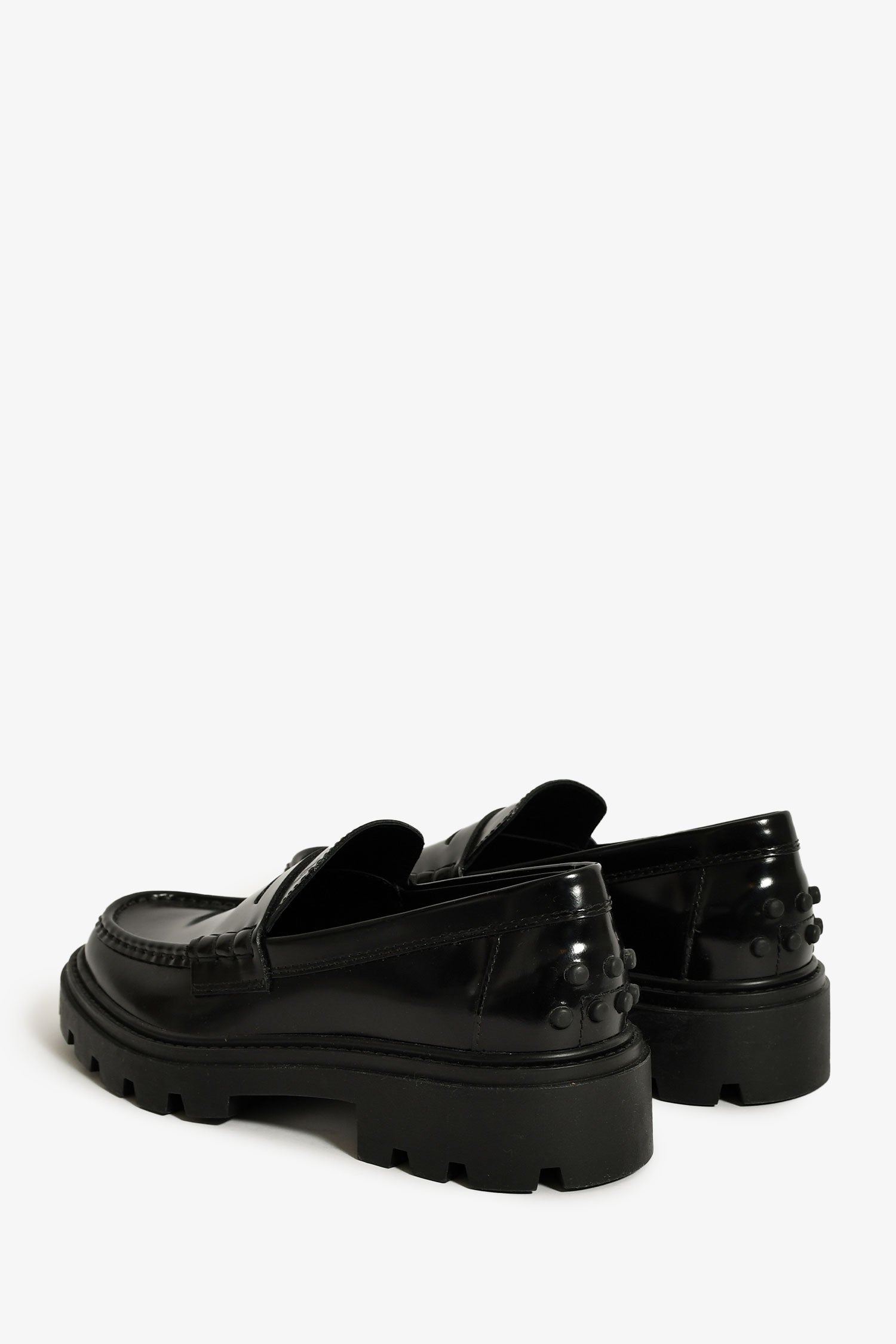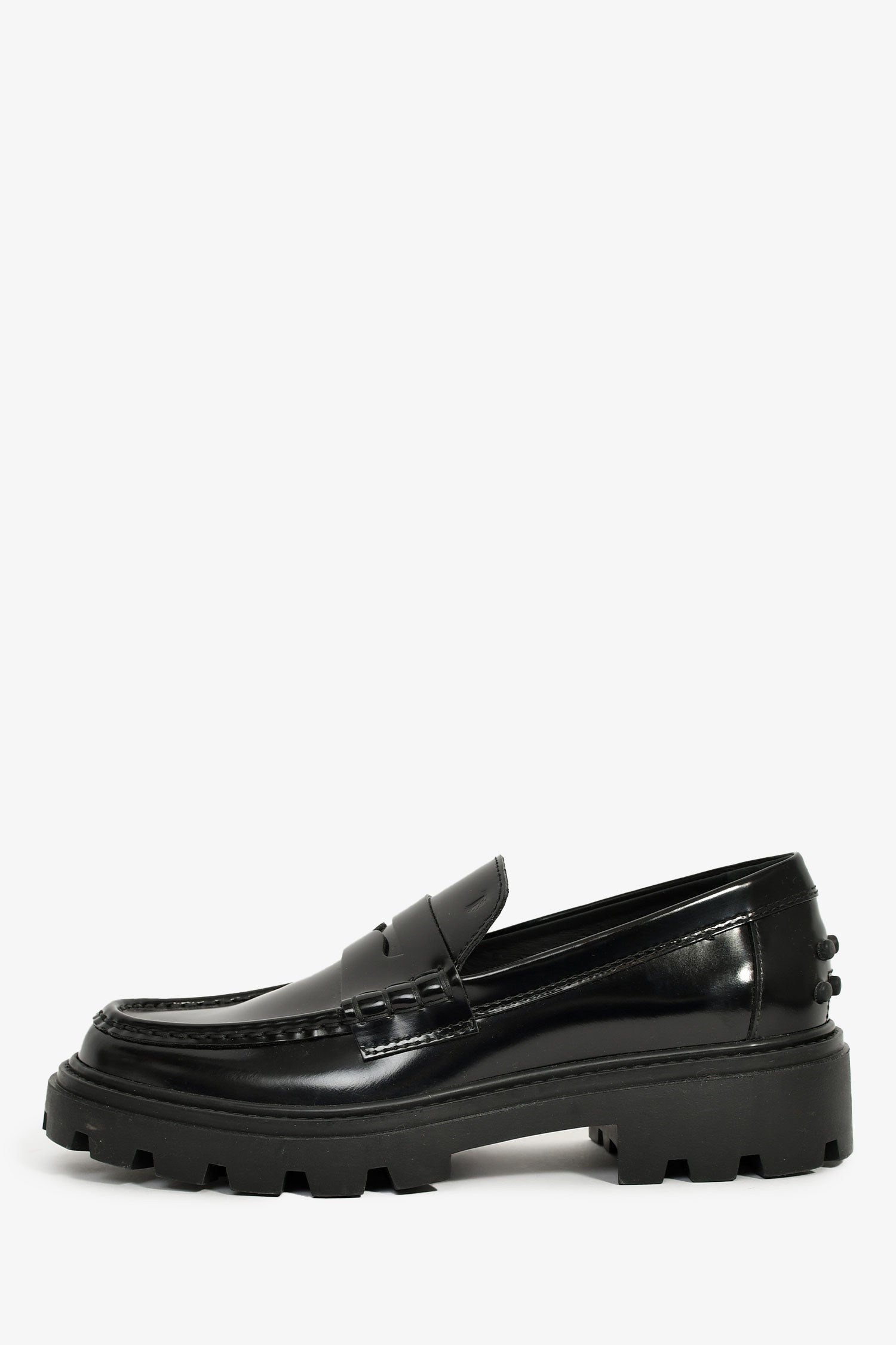 Tod's Black Leather Lug Sole Penny Loafers. Slip-on. Round toe. Tonal stitching.