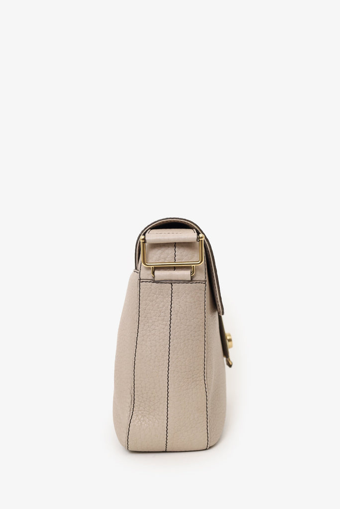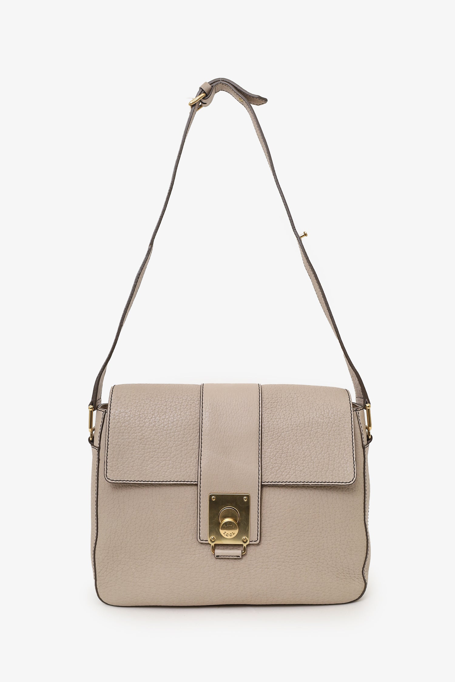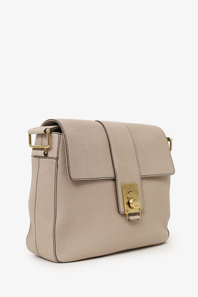 Tod's Grey Leather Crossbody Shoulder Bag. Front fold-over flap with turn-lock closure. Strap with adjustable push-pin closure. Lined interior. Single interior zip pocket. Gold-tone hardware. Tonal stitching.