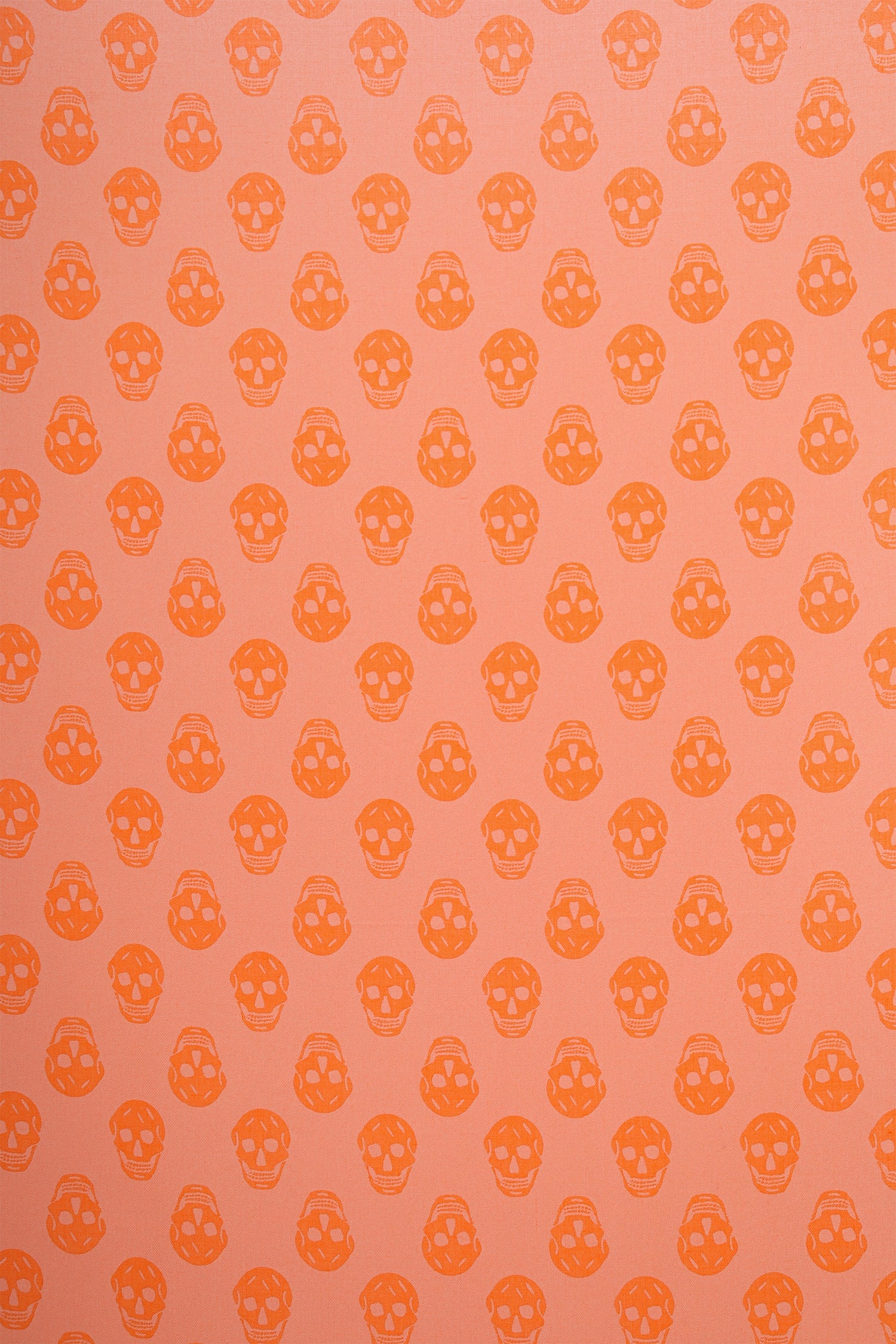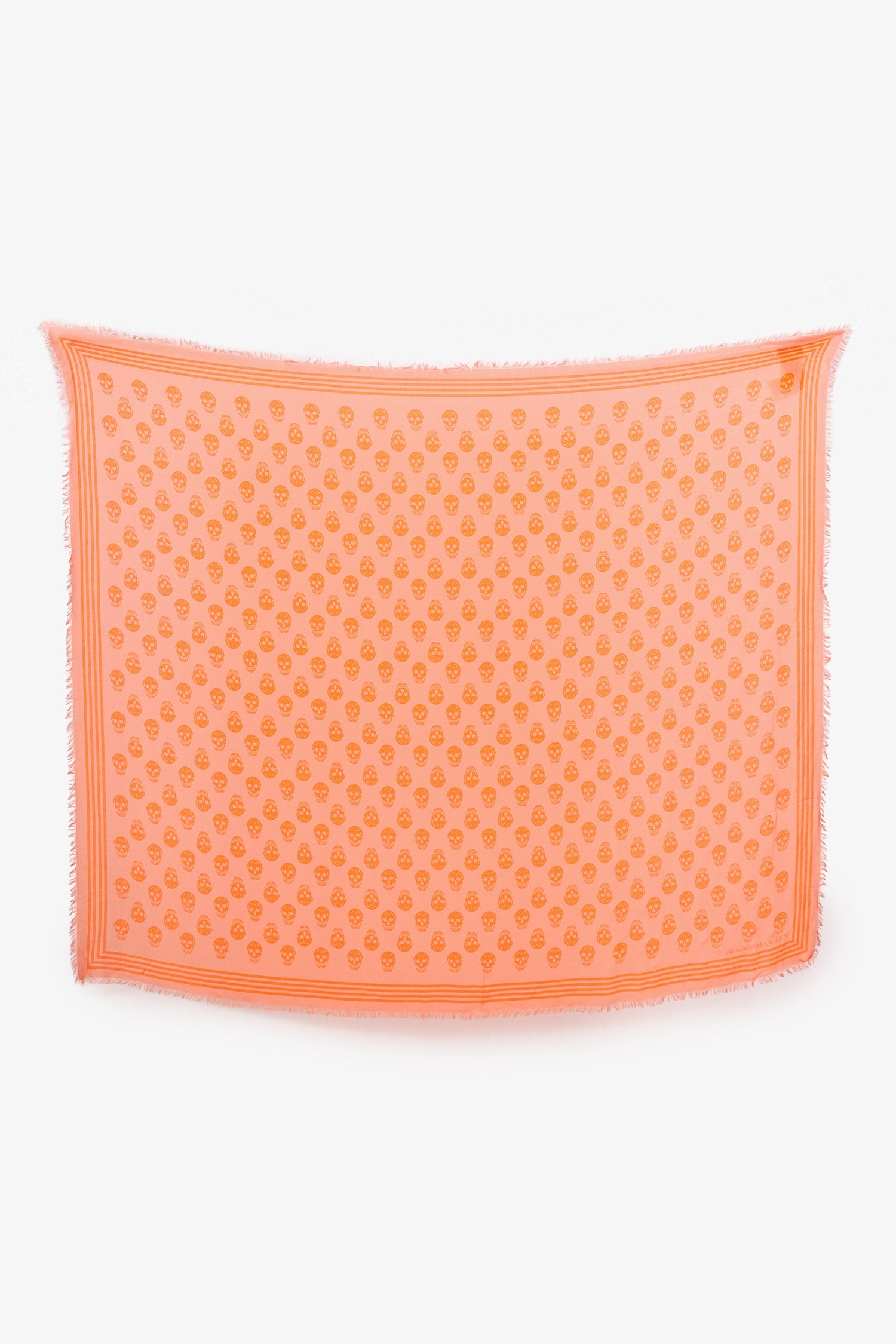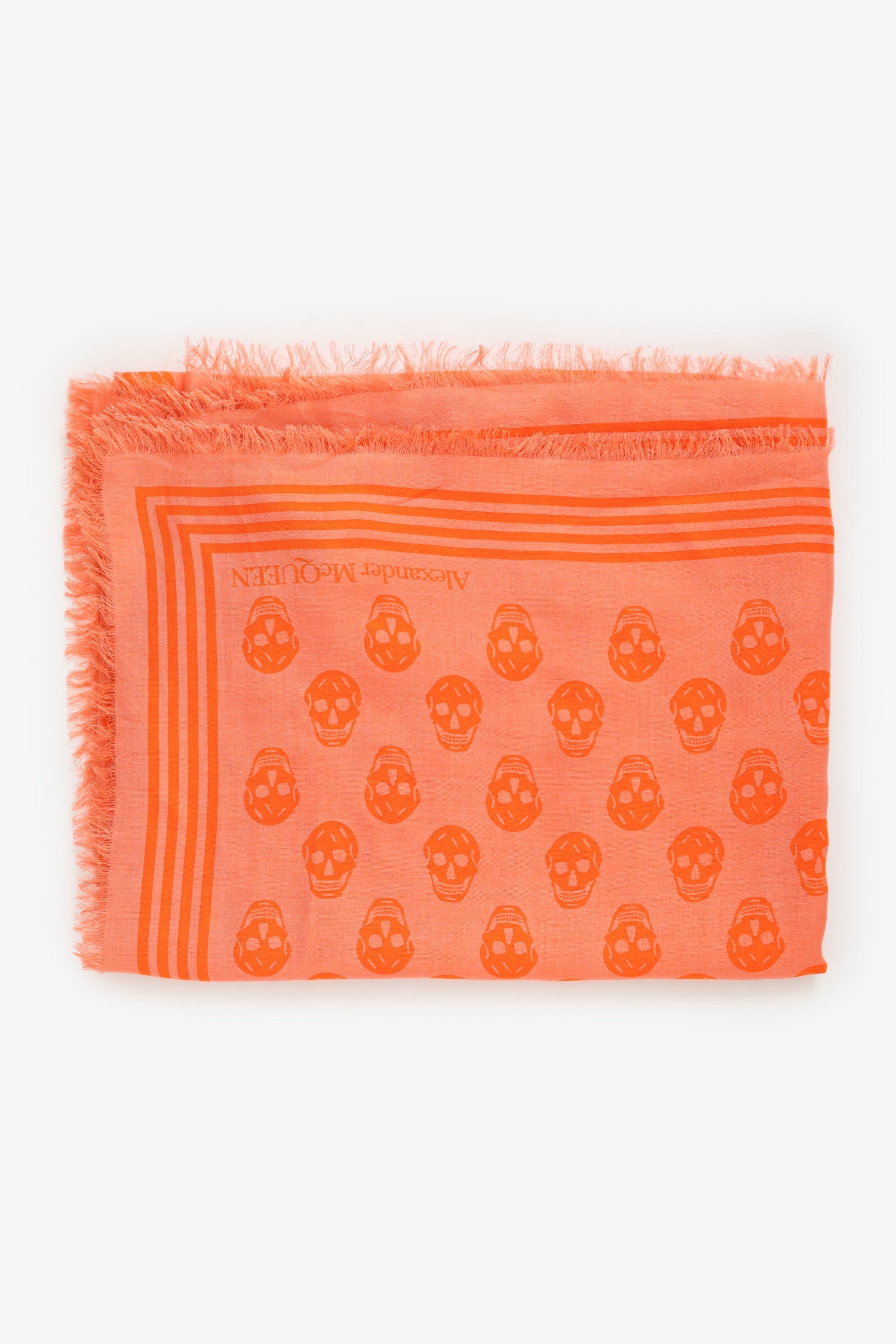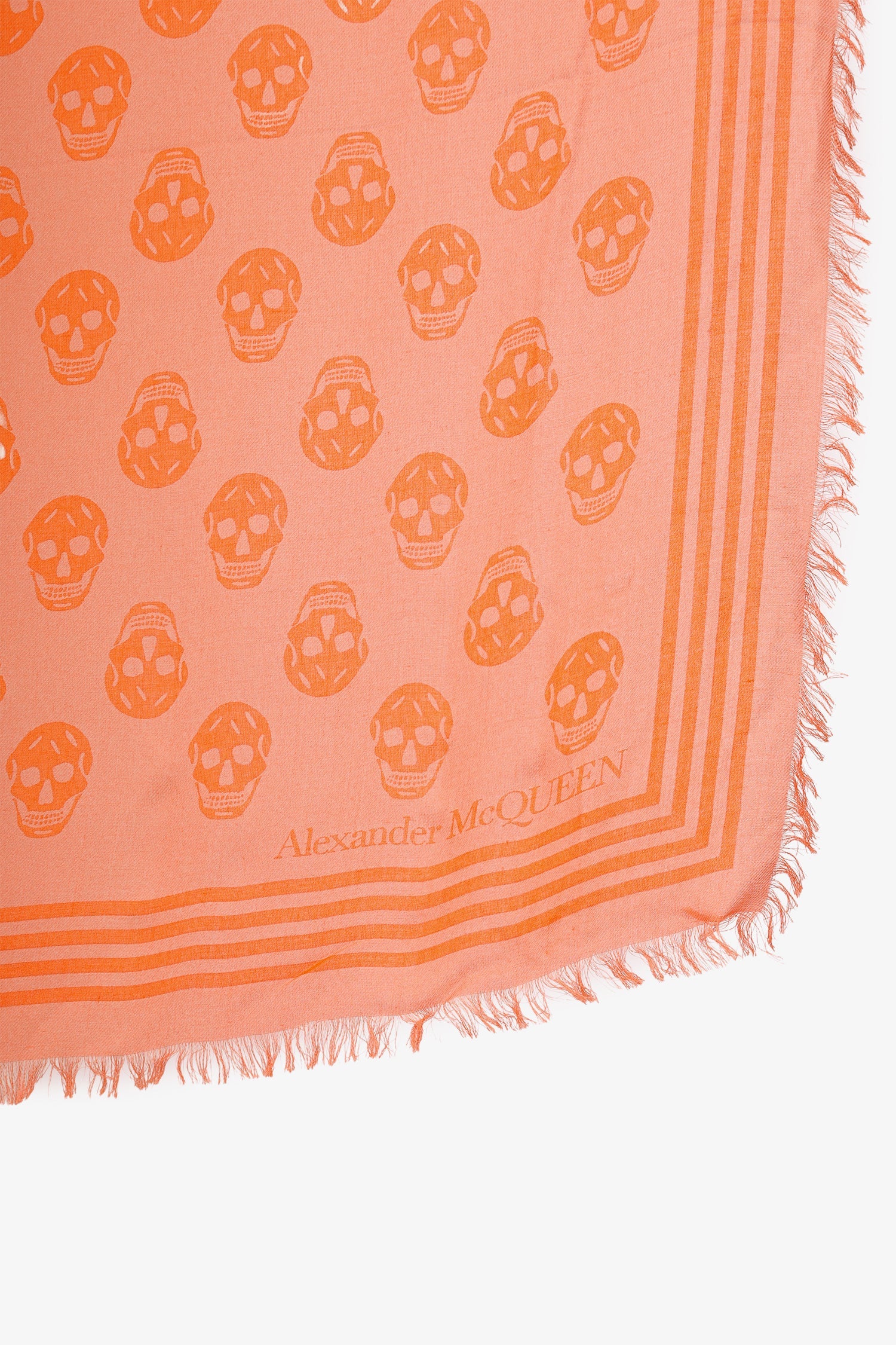 Alexander McQueen Orange Skull Print Scarf. Fringed trims. Tonal stitching.