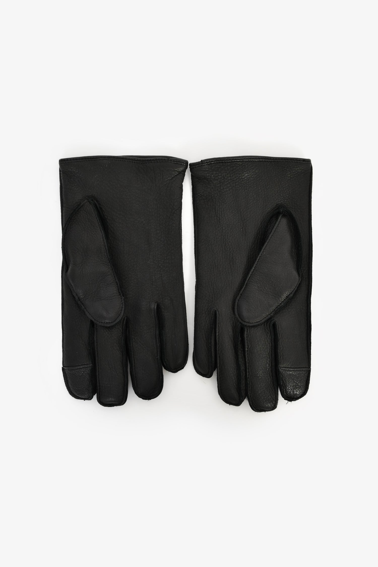Balmain Black Deer Leather Cashmere/Wool Logo Gloves. Slip-on. Wool and cashmere lining. Gold-tone hardware. Tonal stitching.
