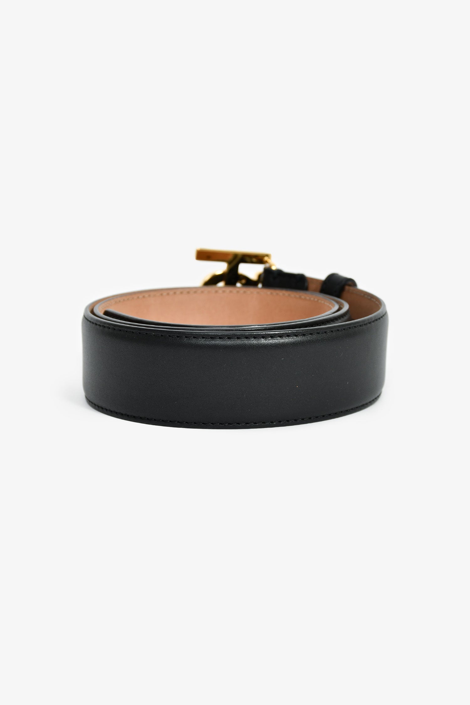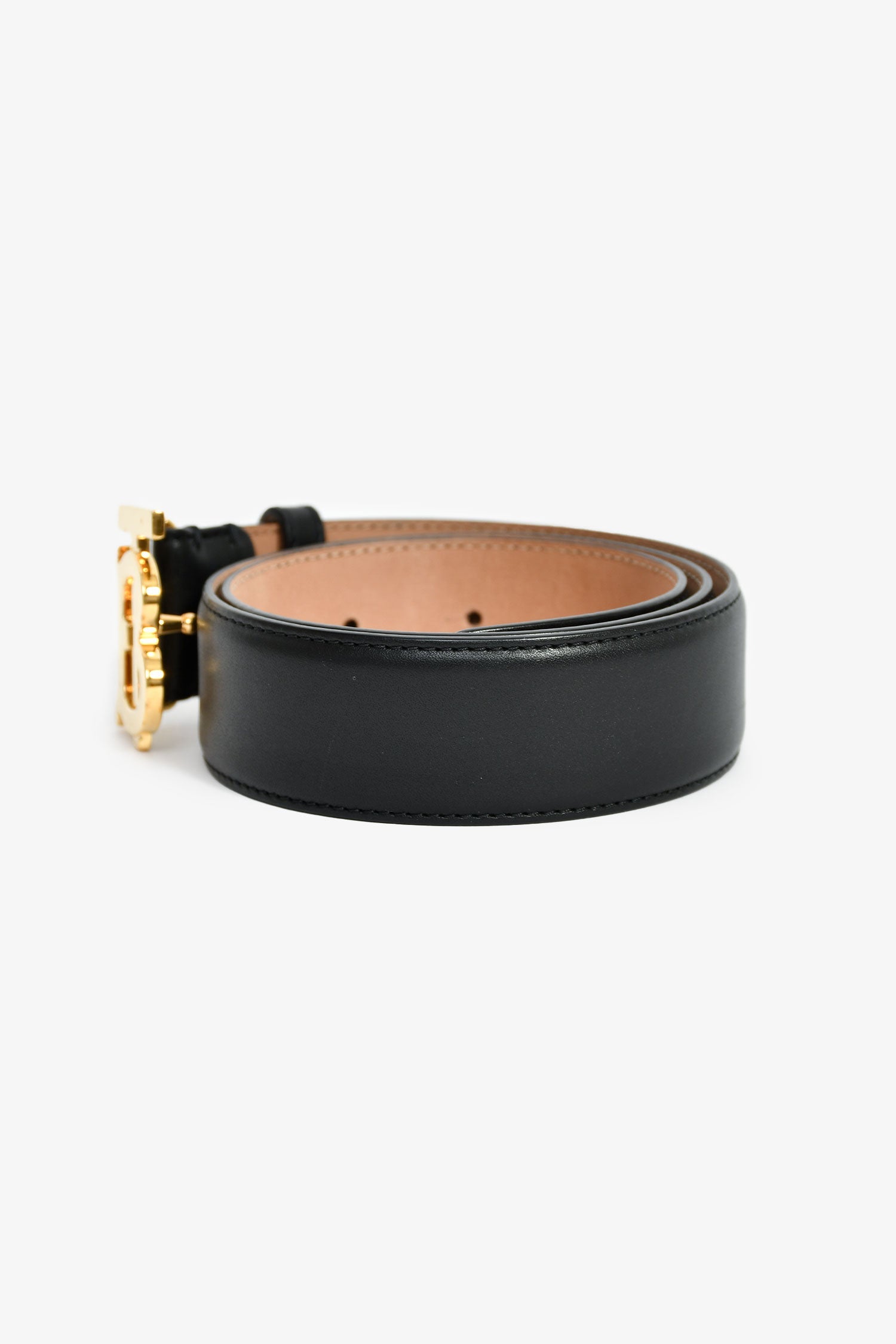 Burberry Black Leather TB Logo Belt. Adjustable pull-through closure. Gold-tone hardware. Tonal stitching.